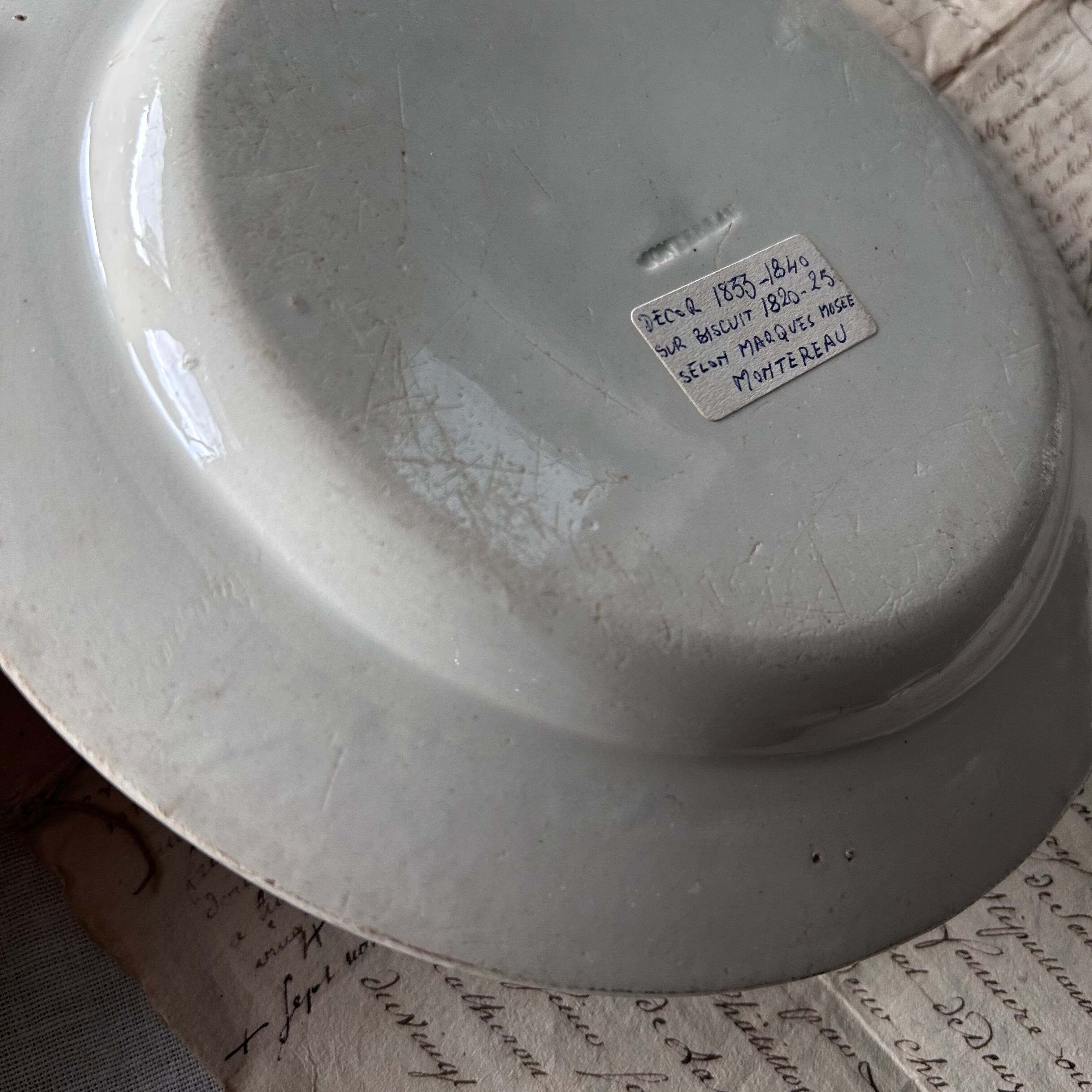 フランスの陶器の名窯「モントロー」で製造。裏面には「MONTEREAU」の刻印とともに、「Louis Debret Montereau」の記載があります。
