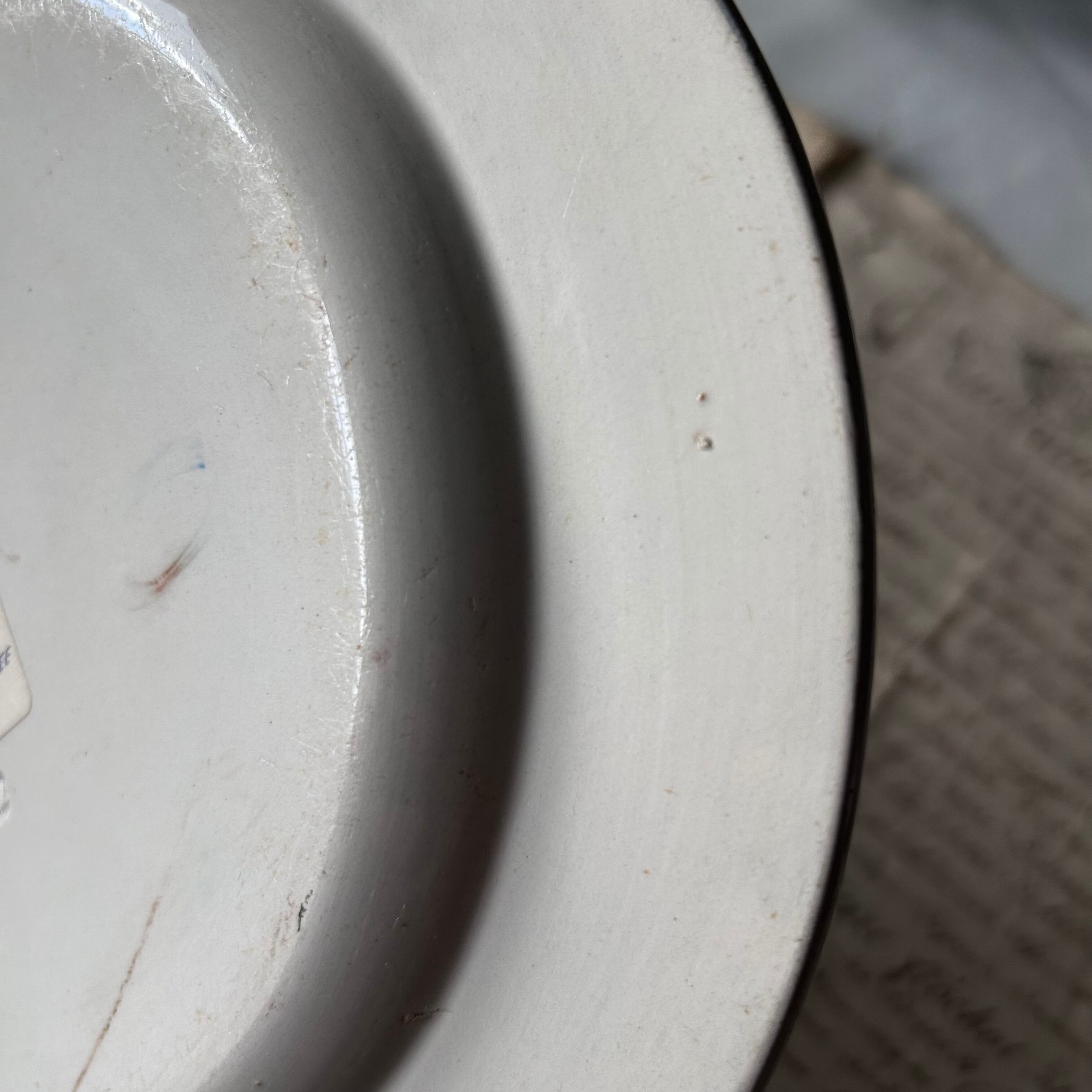 フランスの名窯、クレイユ・エ・モントローによる貴重な初期の絵皿。牧歌的な農村風景が描かれています。周囲にはカラフルな草花模様が彩りを添え、装飾性と物語性を兼ね備えた一品です。裏面には製造元「L. Fourmy & Etilhuit,Montereau」のマークがあり、モントロー陶器博物館による資料をもとに1825年~1833年頃の製造と推定されています。