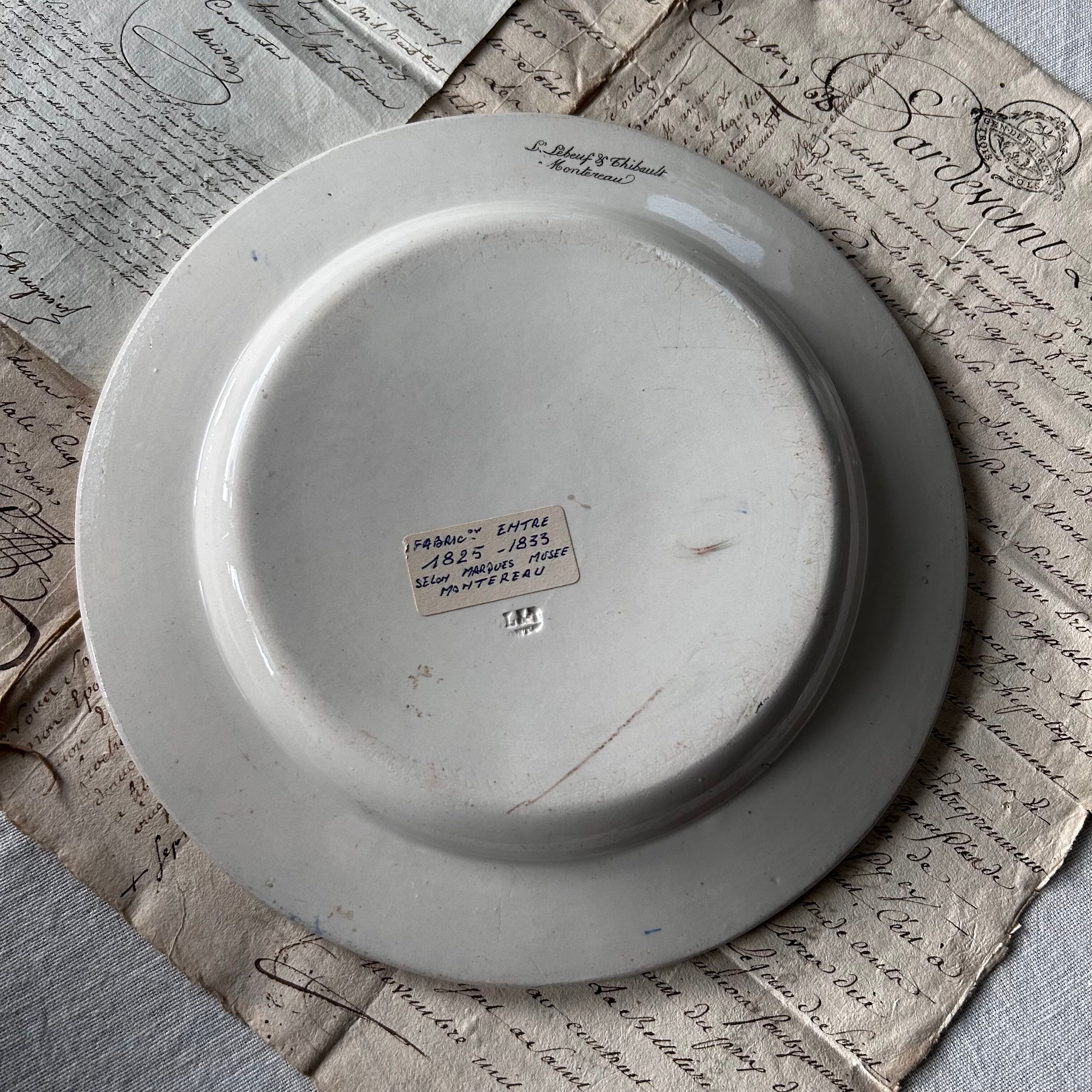 フランスの陶器の名窯「モントロー」で製造。裏面には「MONTEREAU」の刻印とともに、「Louis Debret Montereau」の記載があります。