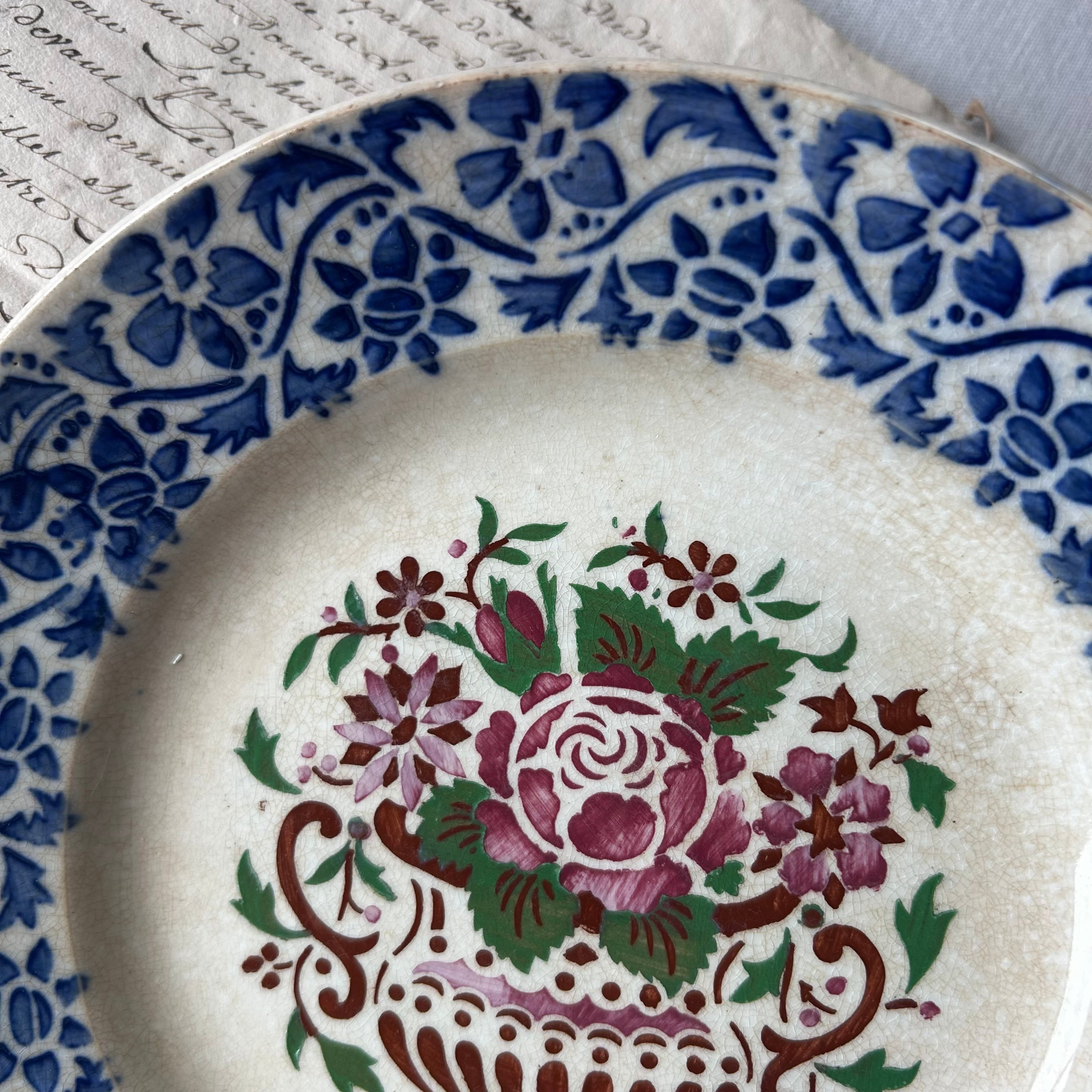 中央に描かれた華やかな花と、リム全体に配されたブルーの花模様が印象的で、鮮やかなグリーンの色使いが目を引く、装飾性の高い一枚です。素朴ながらも気品のあるまいが魅力で、壁に飾ってインテリアとして、映える存在感があります。年月を経て、いい枯れ方をしているアンティーク感満載の素敵なプレートです。シャビーな雰囲気が好きな方に是非オススメしたい唯一無二の一品です。
