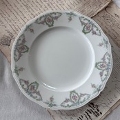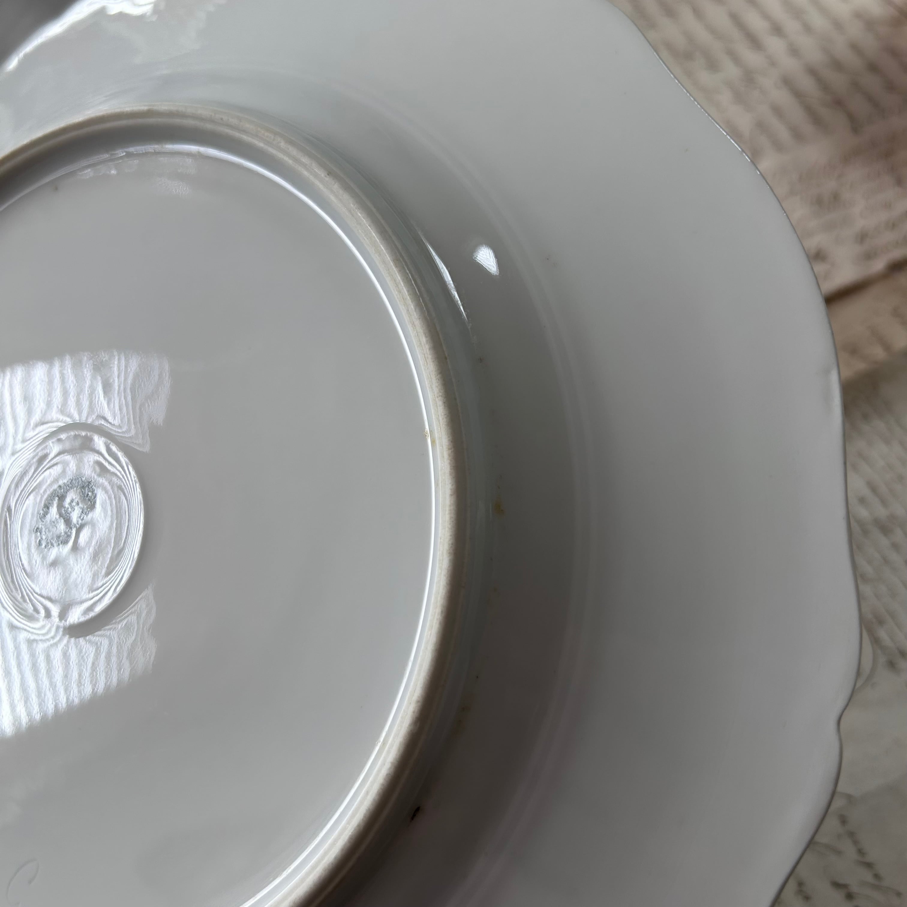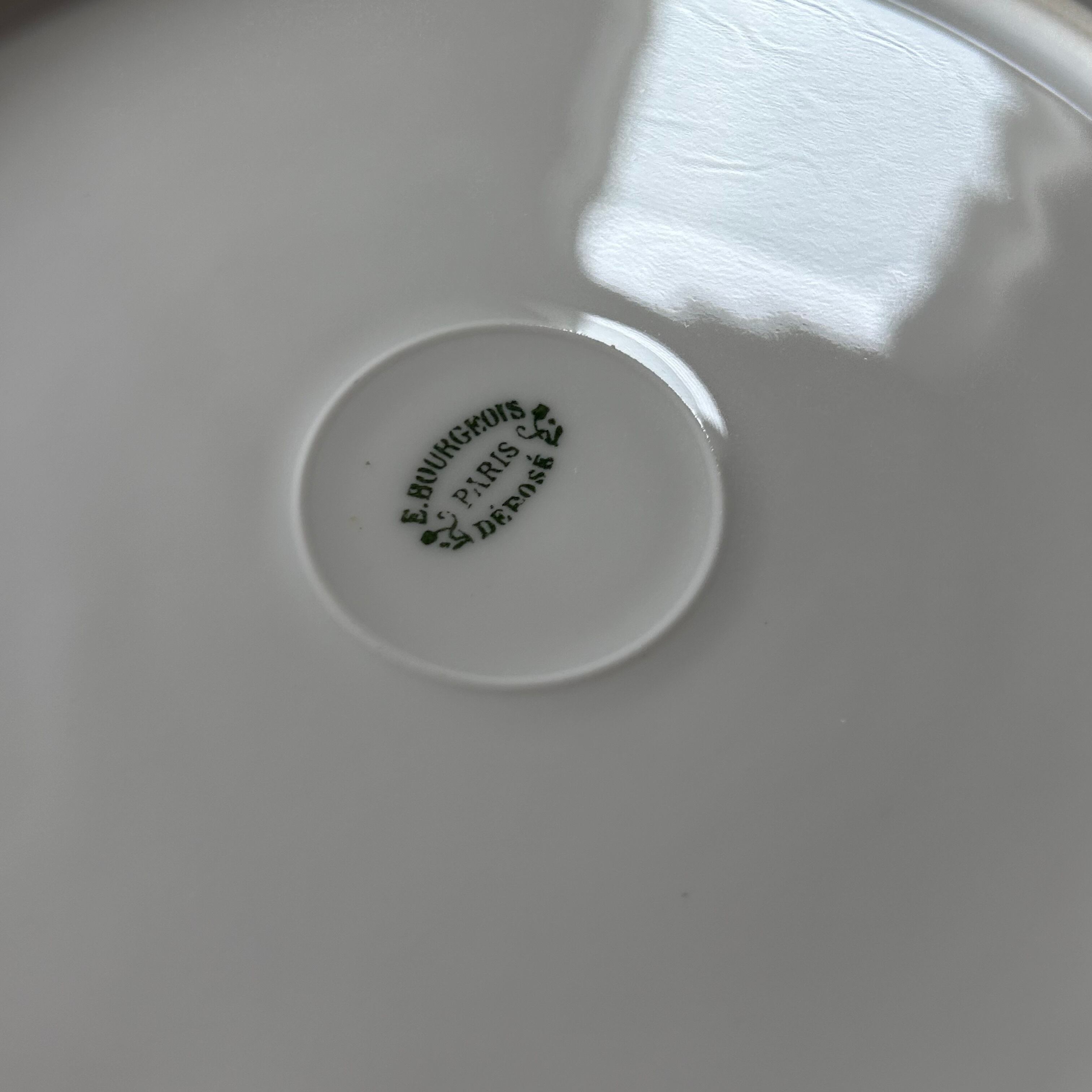 淡いピンクの小花とリーフが連なる花綱模様が優雅な、リモージュ製のクラシカルなプレート。緩やかなウェーブのあるリムと繊細な絵付けが調和し、控えめで上品な雰囲気を漂わせます。裏面には、パリの高級陶器商「E. Bourgeois(エミール・ブルジョワ)」の名が記されており、特別注文品として製作されたことがうかがえます。