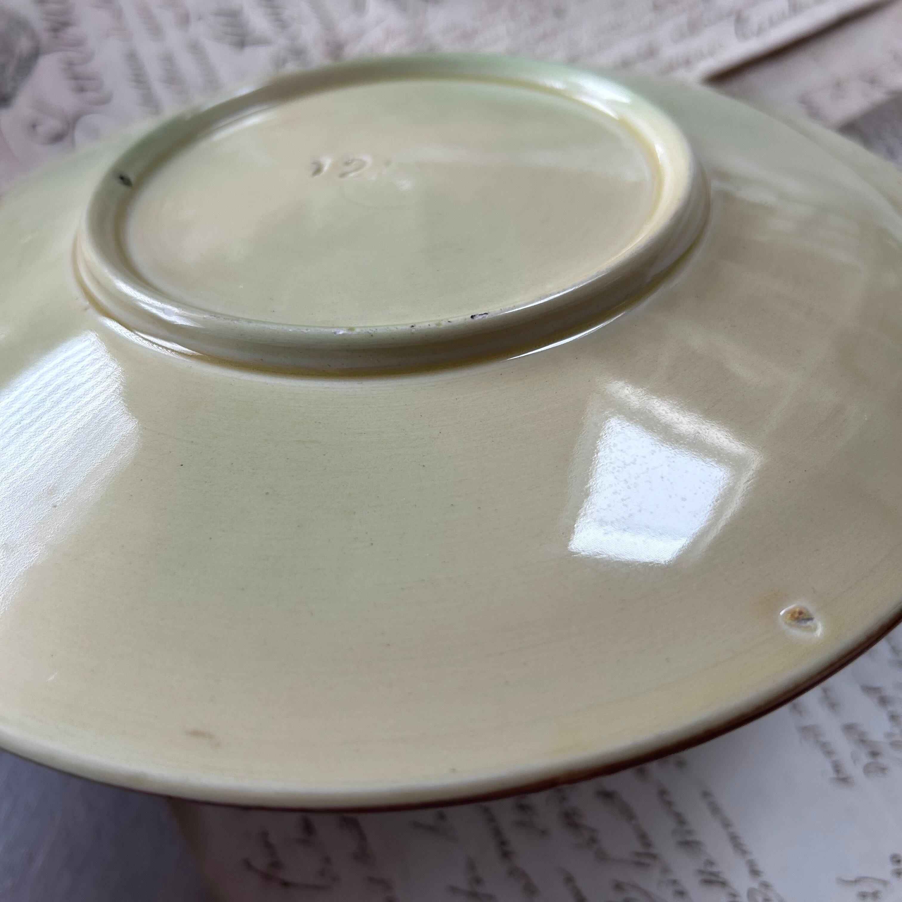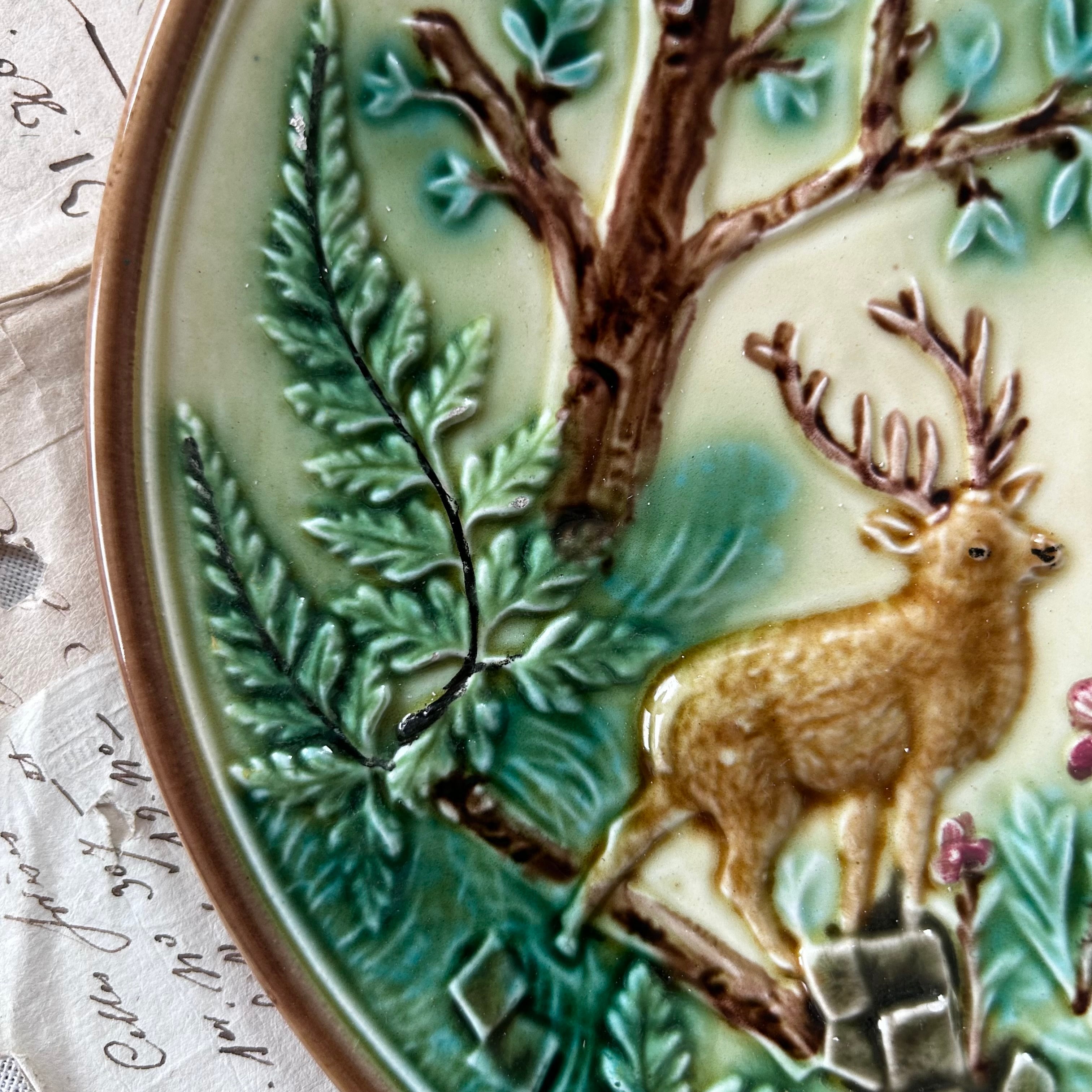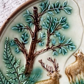 立体的なレリーフと艶やかな釉薬で、森にたたずむ鹿たちの姿を生き生きと描いたバルボティーヌの装飾プレート。濃淡のあるグリーンやブラウン、繊細な表情の動物たちが、絵画のように浮かび上がります。厚みと重量感があり、壁に飾ってもしっかりと存在感を放つ一枚です。