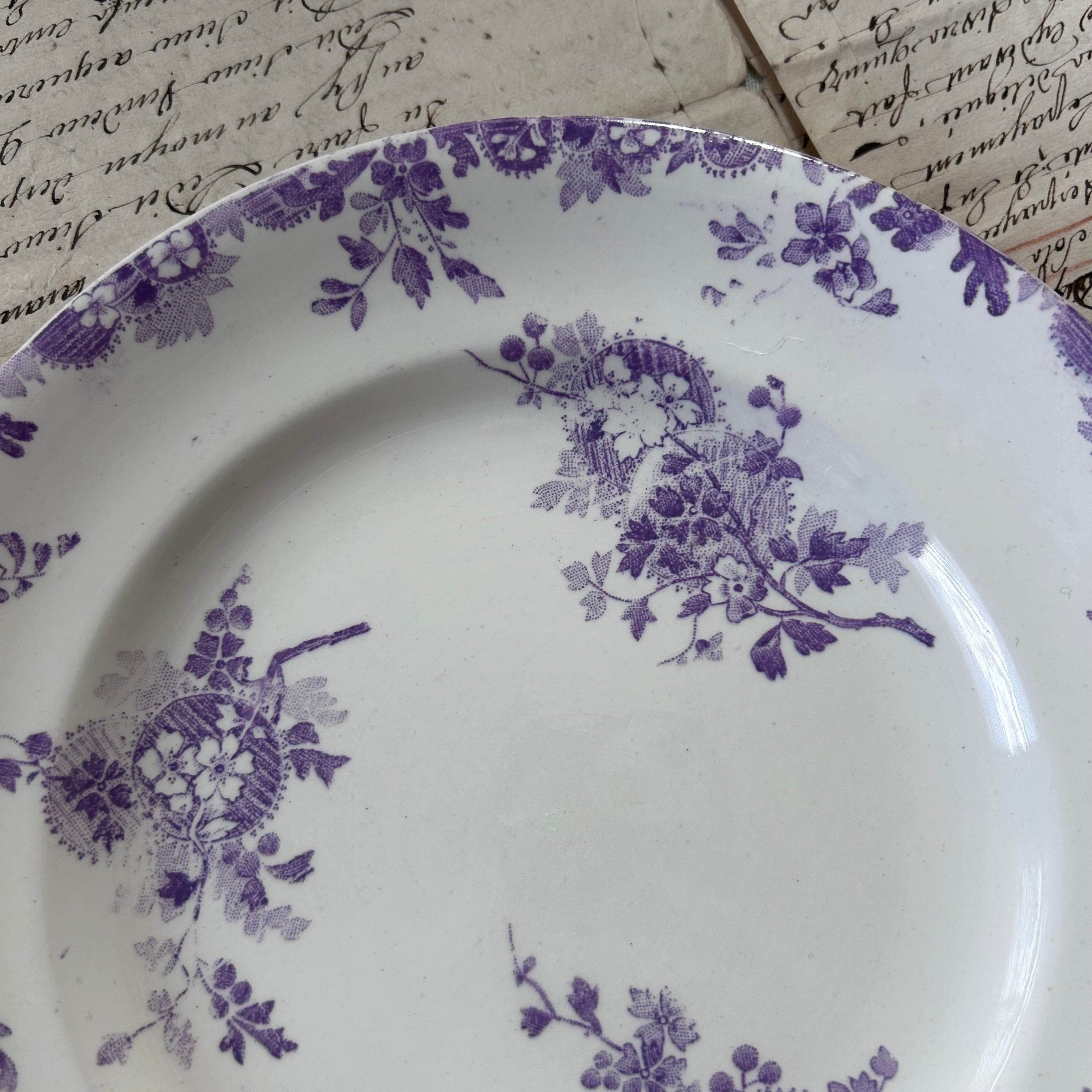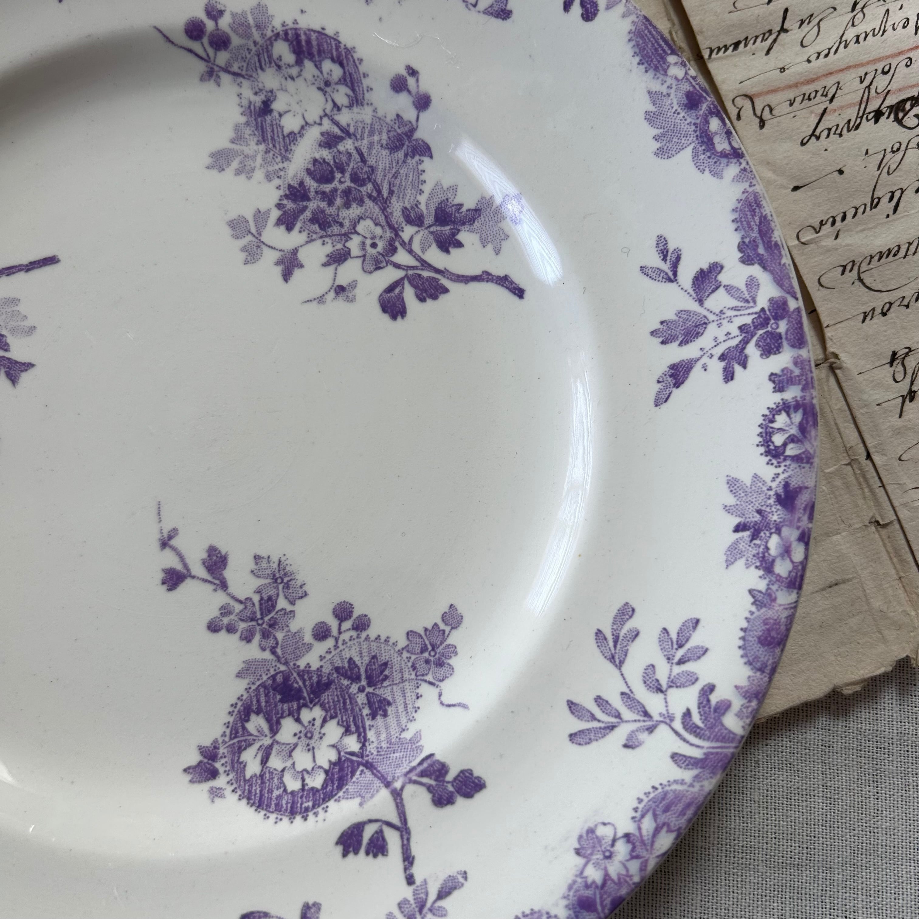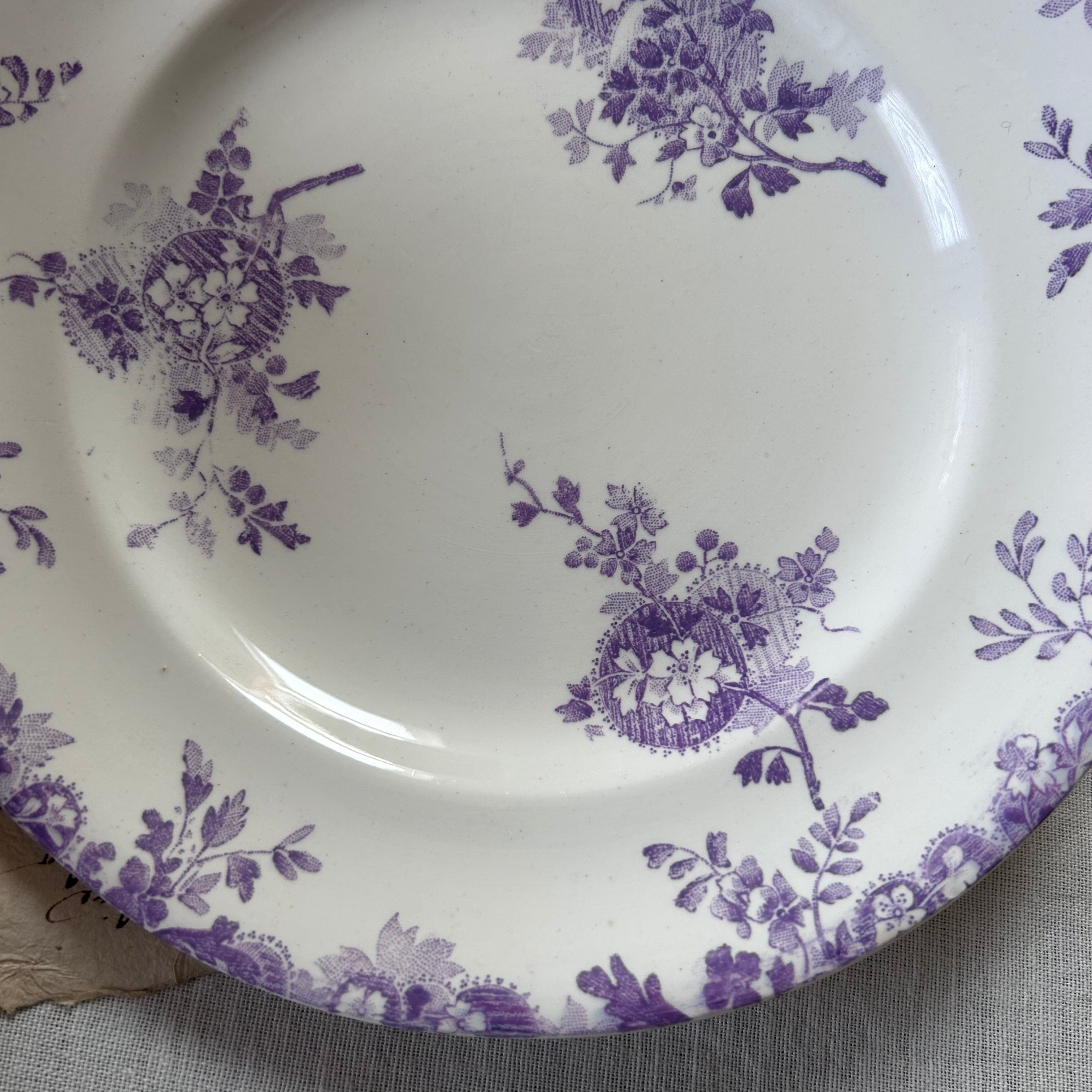 フランスの老舗陶器メーカー、ロンウィによる「HANOi(ハノイ)」シリーズのディナープレート。目にも涼しげな淡いパープル(ライラック系)の色調で、東洋趣のある花籠模様が優雅にあしらわれた一枚です。繊細なトランスファープリントがプレート全体にリズムよく配置され、クラシックでありながらモダンな印象も併せ持ちます。