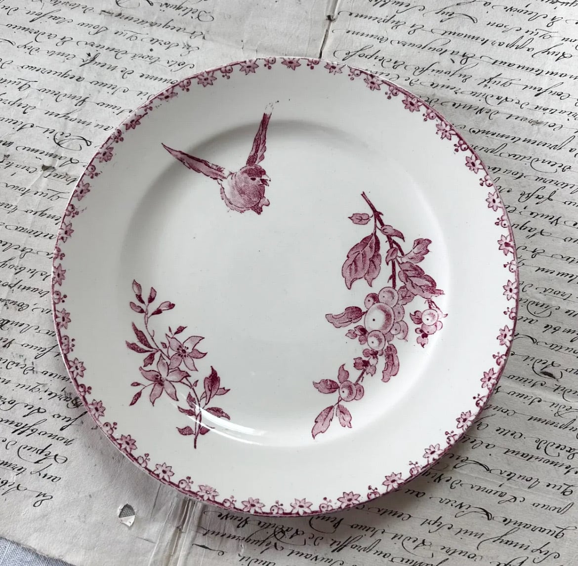 羽ばたく小鳥とやさしい花のモチーフがあしらわれた、繊細で詩的な雰囲気のアンティークプレート。縁を彩る小さな花模様がプレート全体を優しく引き締め、飾っても食卓に置いても目を惹くデザインです。愛らしくも上品なパターンで、ティータイムやデザートプレートにぴったりです。