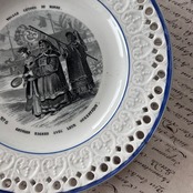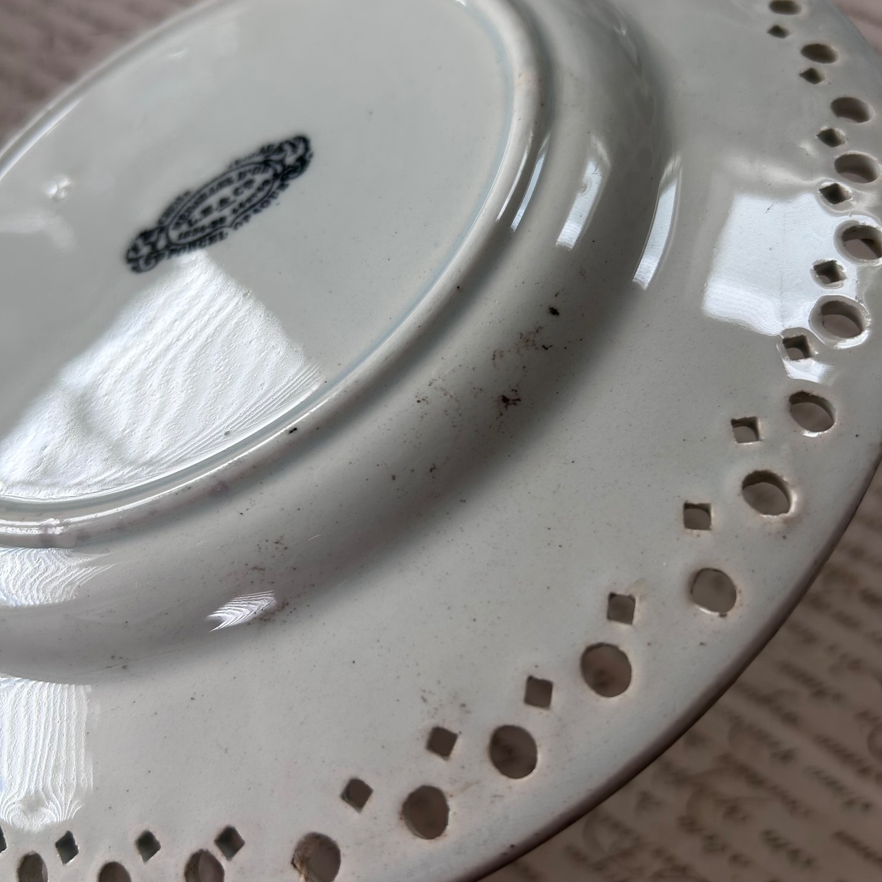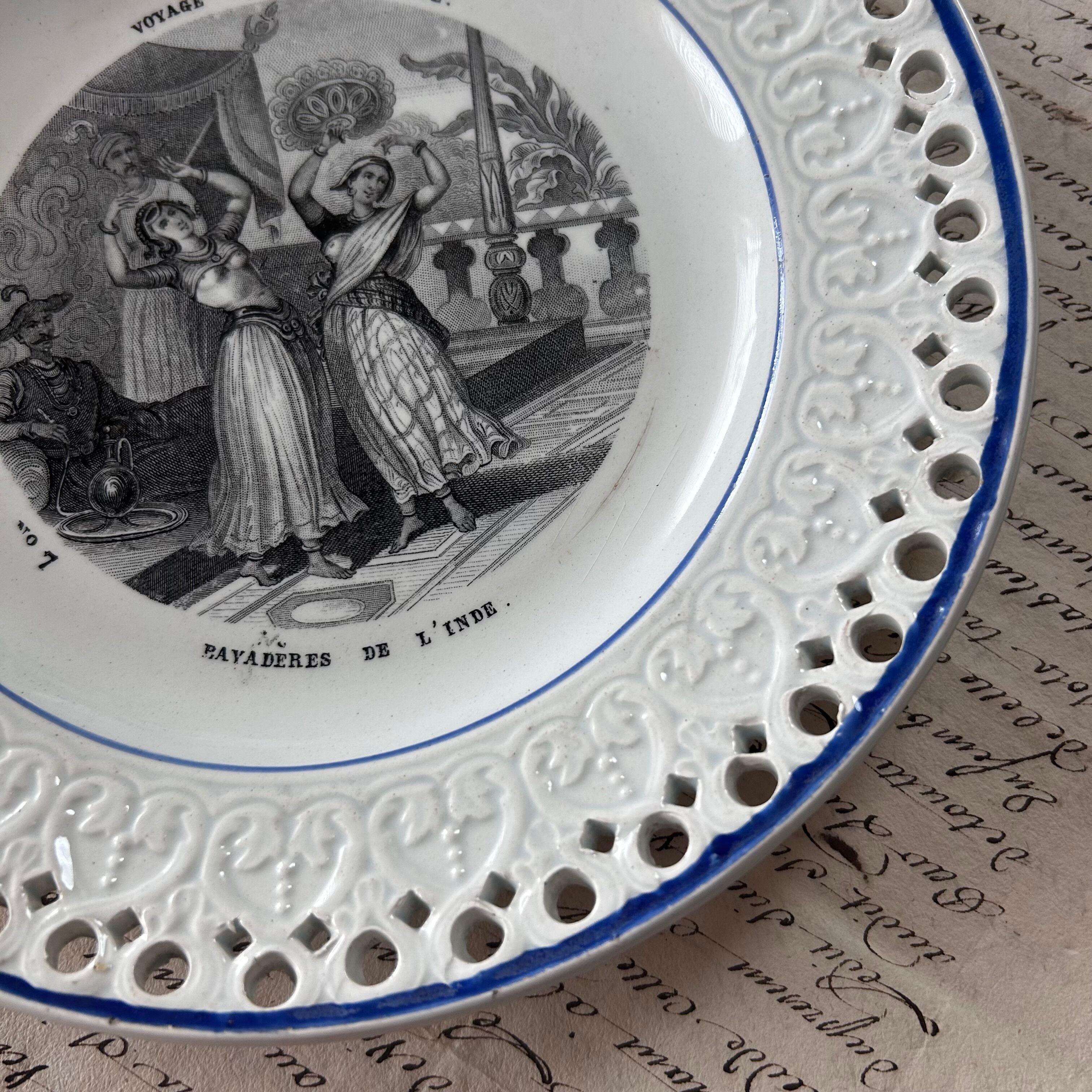 世界各地の風俗を描いた人気シリーズ「VOYAGE AUTOUR DU MONDE (世界一周)」のアンティークプレート。リムには透かし装飾が施されており、クラシカルで存在感のある一枚です。中央には時の人々の装いが緻密なモノトーンプリントで描かれており、まるで一枚の絵画のよう。インテリアやディスプレイにもぴったりで、アンティークコレクターにもおすすめの逸品です。