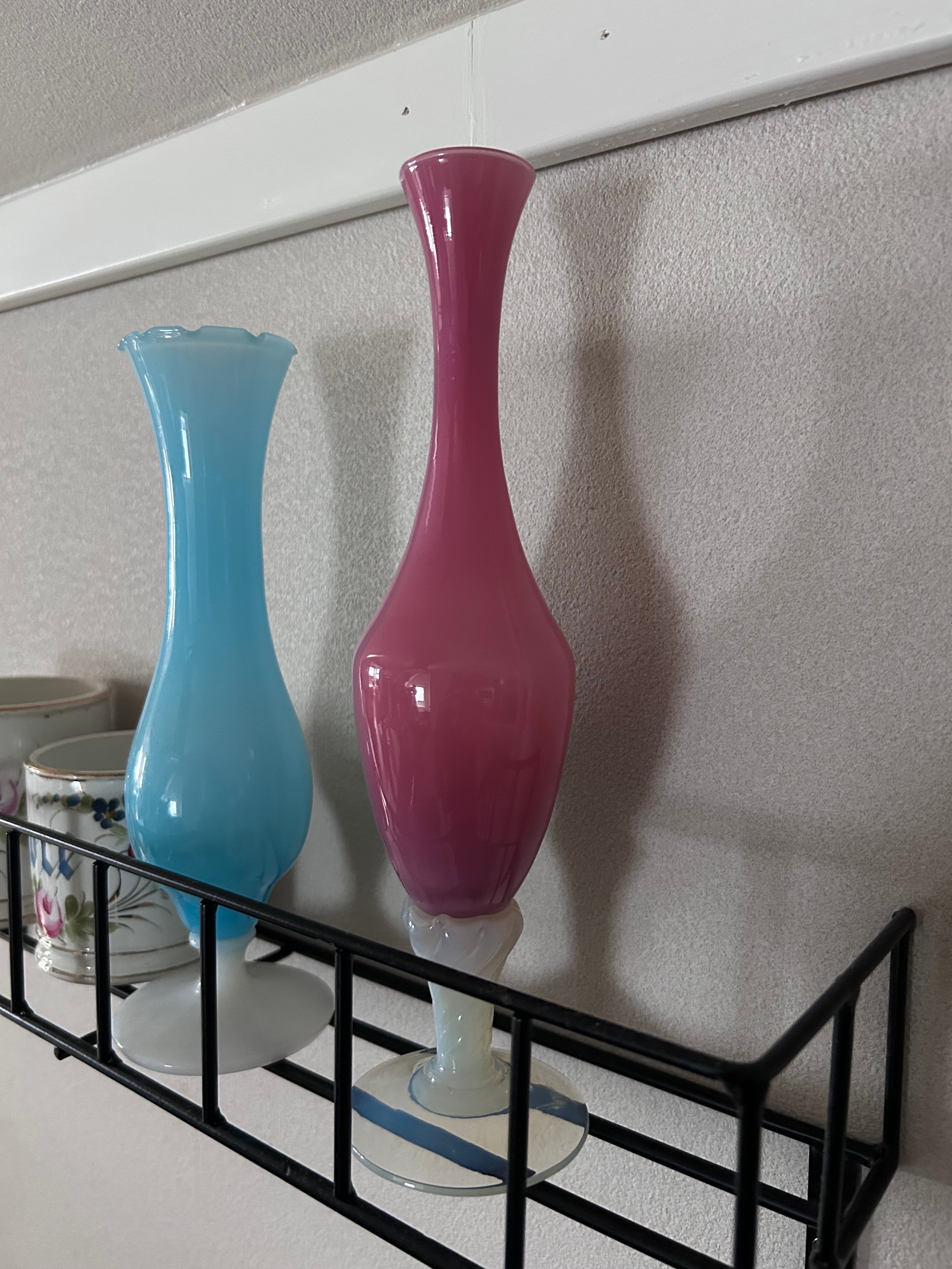 色鮮やかなミルキートーンのガラスが魅力的なオパリンガラス。今回のものはワインローズ系の発色で、それぞれ半透明の脚部との対比が美しく、光を受けたときのグラデーションがとても印象的です。手吹きによる製法と見られ、シンプルながらエレガントなフォルムは、飾るだけで空間にクラシカルな雰囲気をもたらします。
