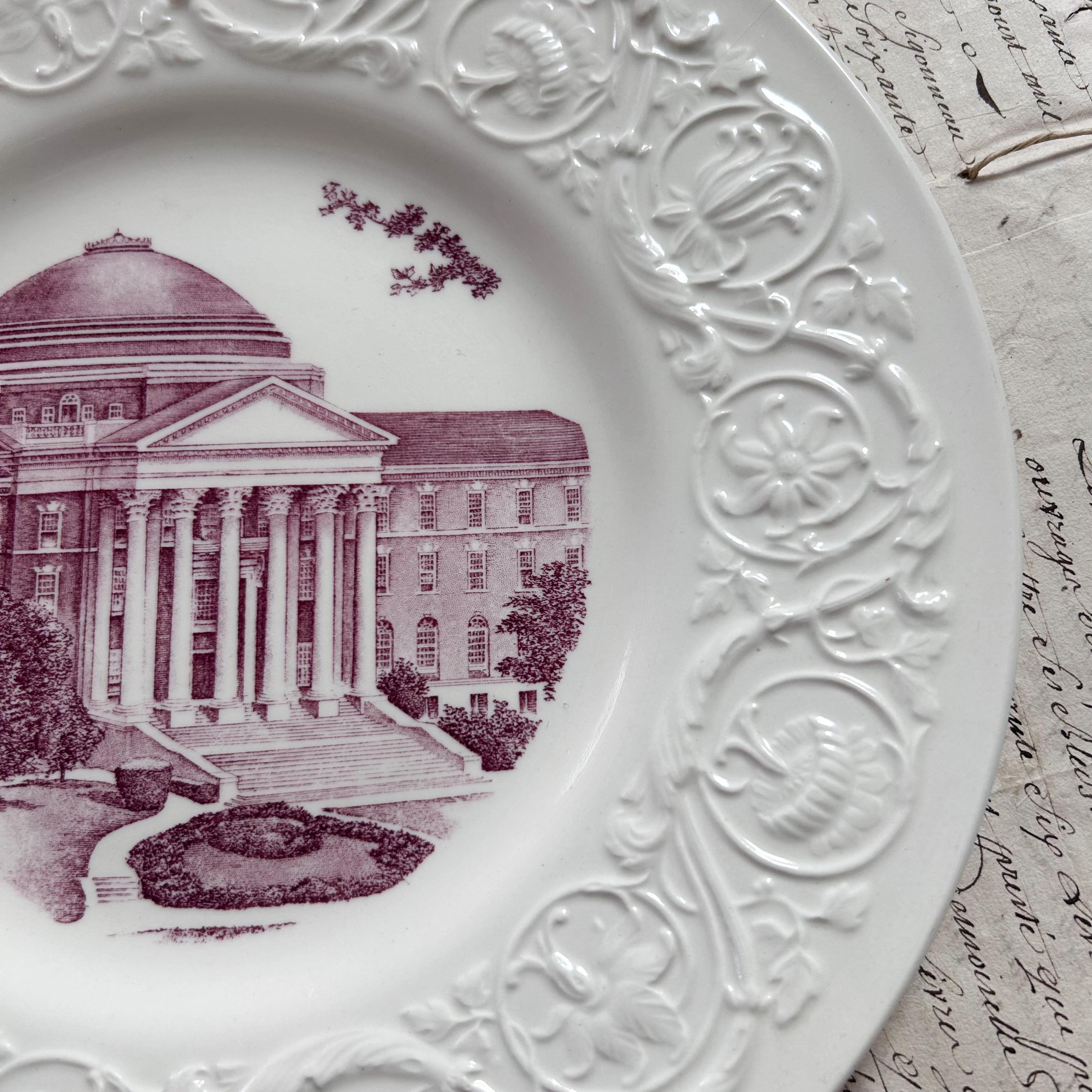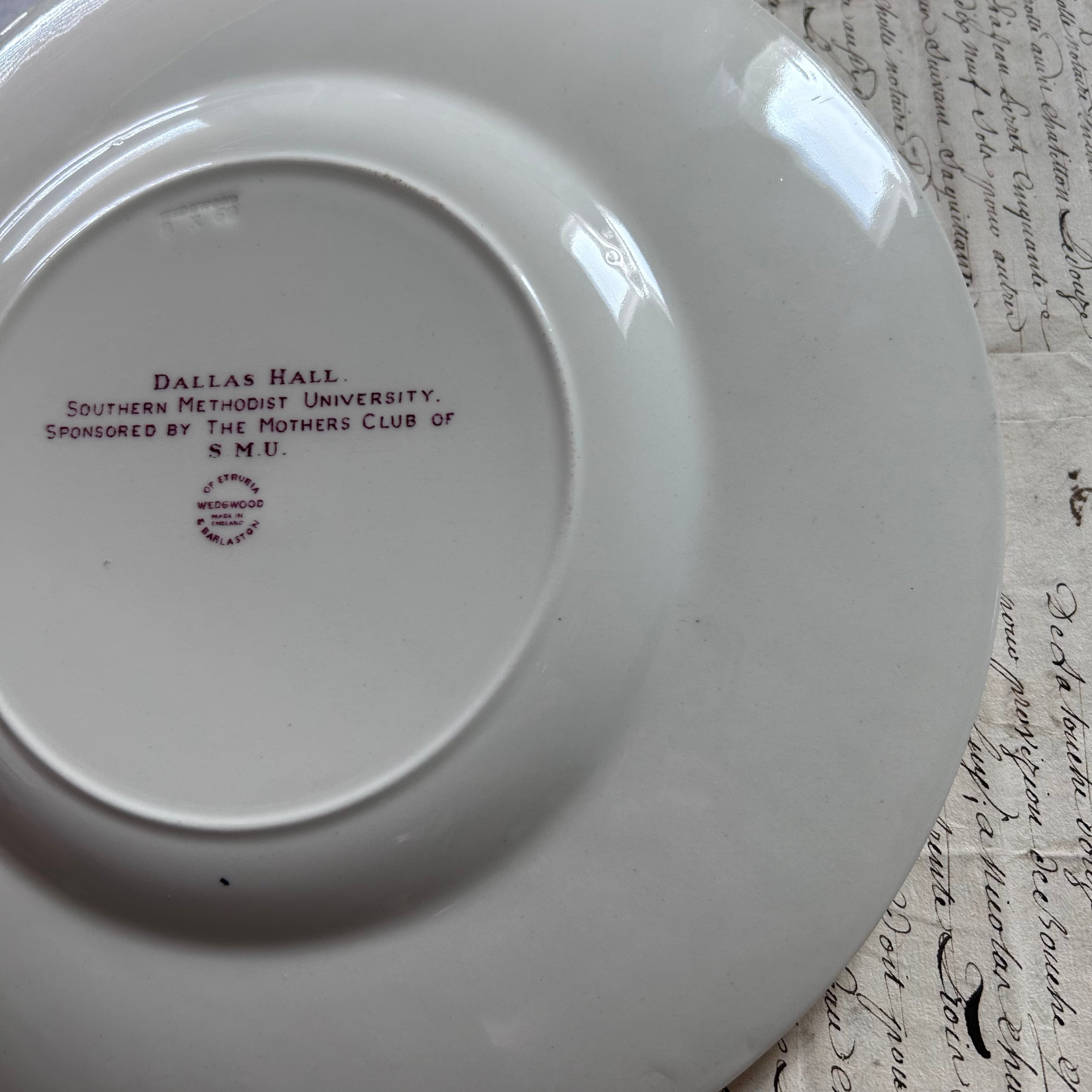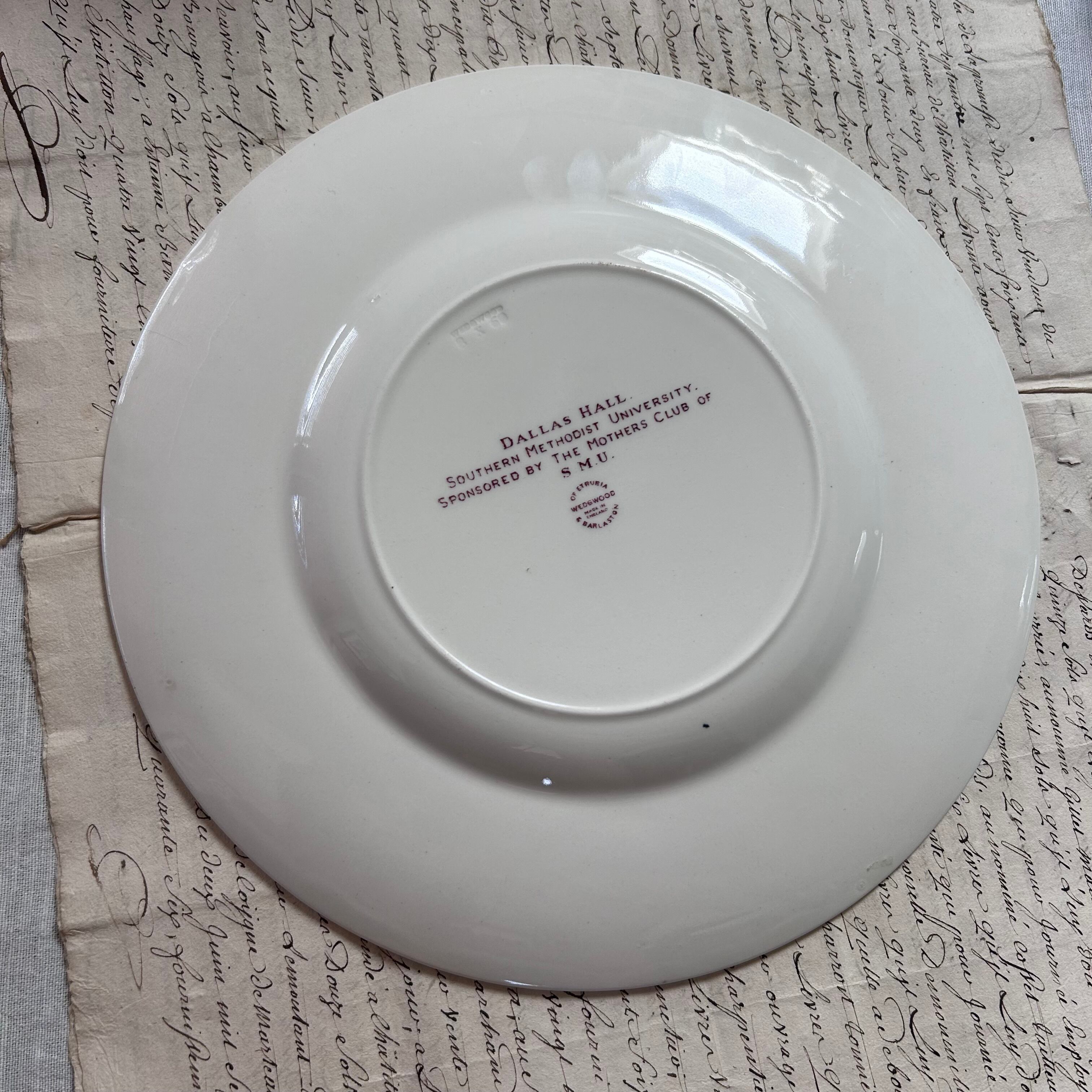 アメリカ・テキサス州の名門、Southern Methodist University (サザンメソジスト大学)の象徴である「ダラス・ホール」を描いた記念プレートです。縁には草花模様の繊細なレリーフが施され、中央には紫がかった転写プリントで荘厳な建物が描かれています。格式ある大学文化と英国名窯のクラフトマンシップが融合した、コレクタブルな一枚です。少し大きめなので、店舗の什器としての使用もオススメです。こちらラストの1枚。