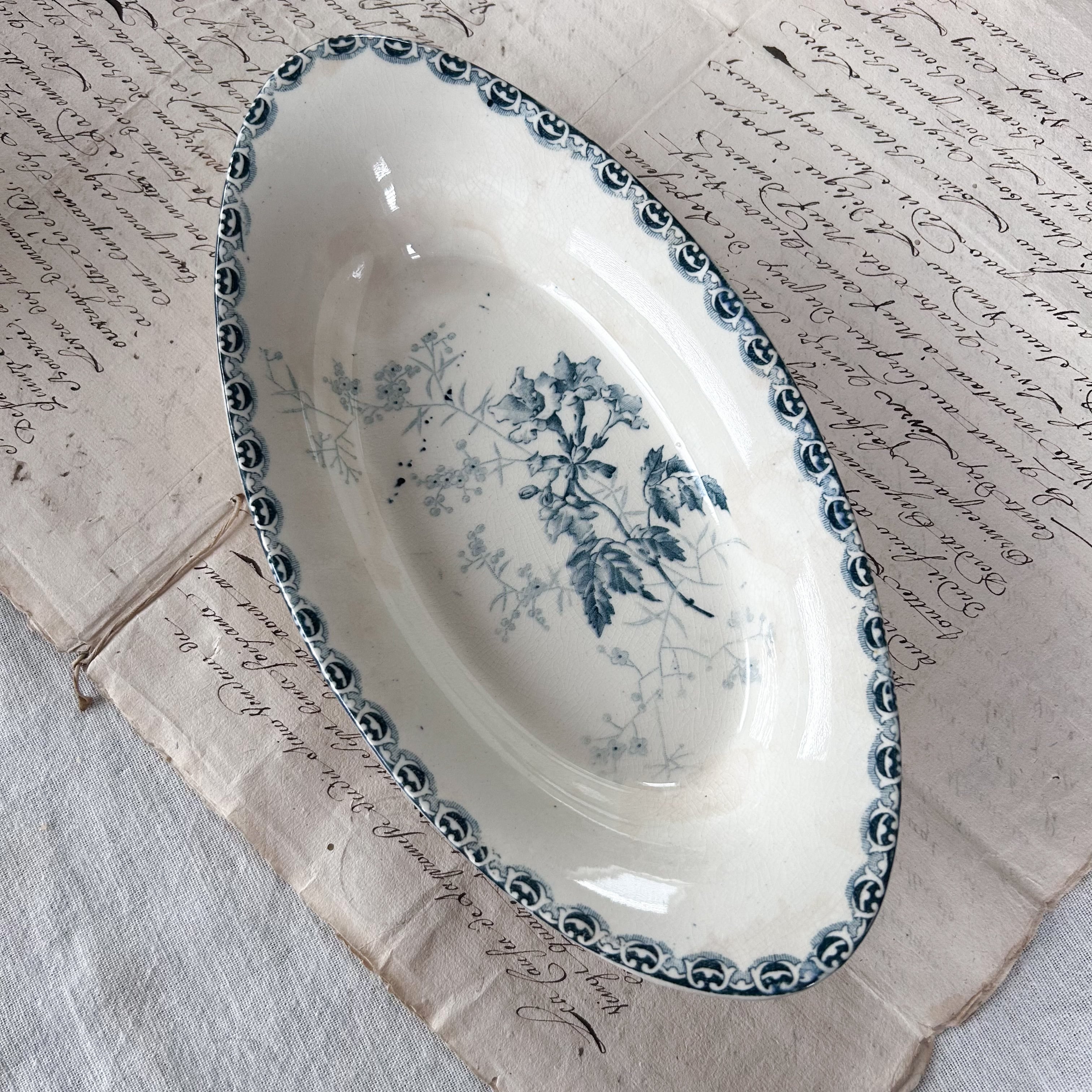 19世紀末に製造されたアンティークらしい風合いが魅力のショワジールロワによるテールドフェール製のラヴィエです。トランスファープリントによる繊細な青の花模様が、上品ながらもどこか素朴な印象を与えてくれます。縁にはリズミカルな装飾が施され、クラシックな佇まいを引き立てます。フレンチアンティークならではの味わい深い一品です。