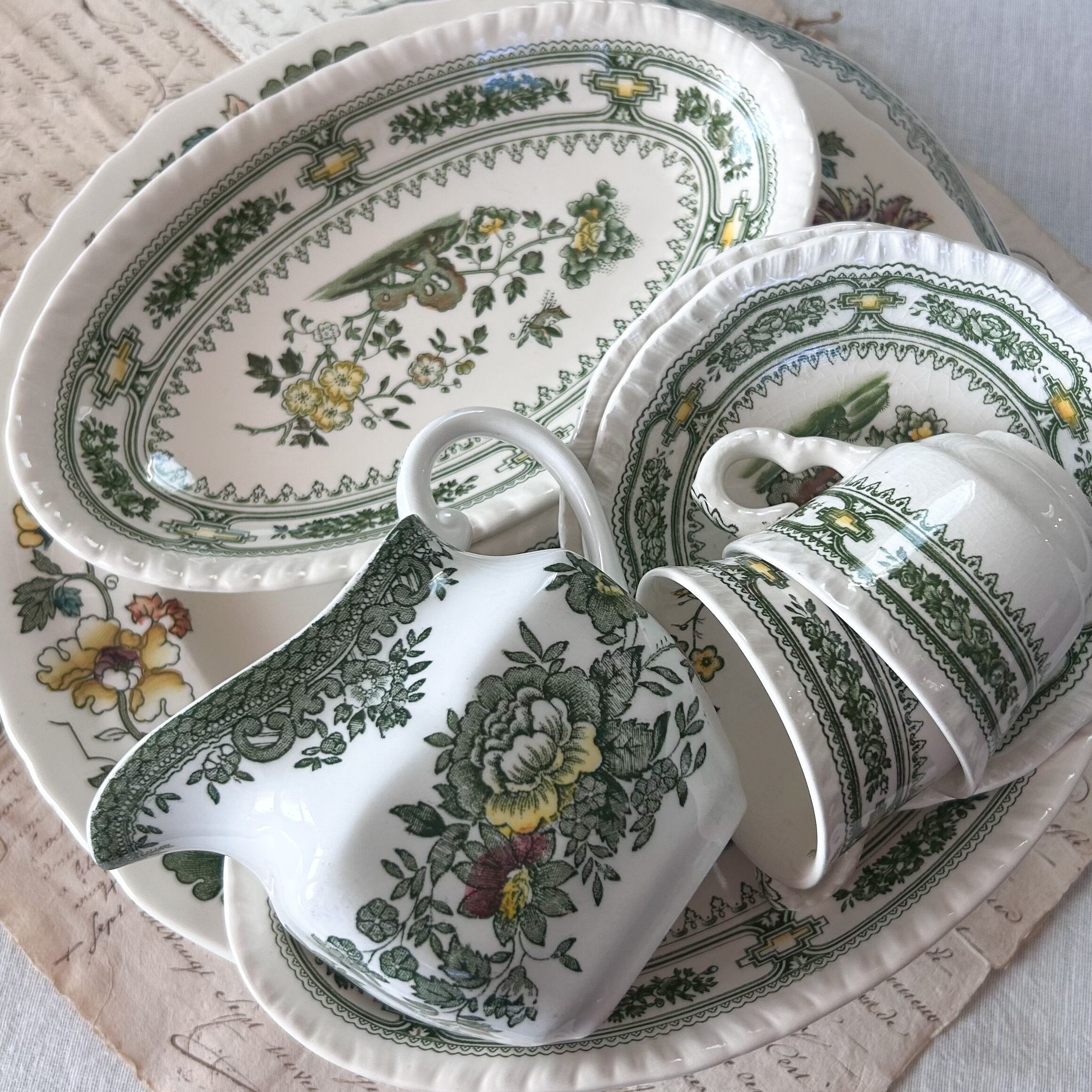 イギリスの名窯メイソンズによるManchu シリーズのラヴィエです。オリエンタルな趣を感じさせる唐草模様と、花々や鳥が描かれたエキゾチックなデザインが特徴。深みのあるグリーンと落ち着いた黄色のコントラストが、クラシカルでありながら華やかな印象を与えます。またリムのレリーフもアクセントになっていて、可愛らしい表情に。副菜や前菜、オリーブやチーズを盛り付けるアンティパストプレートとしてもぴったりです。