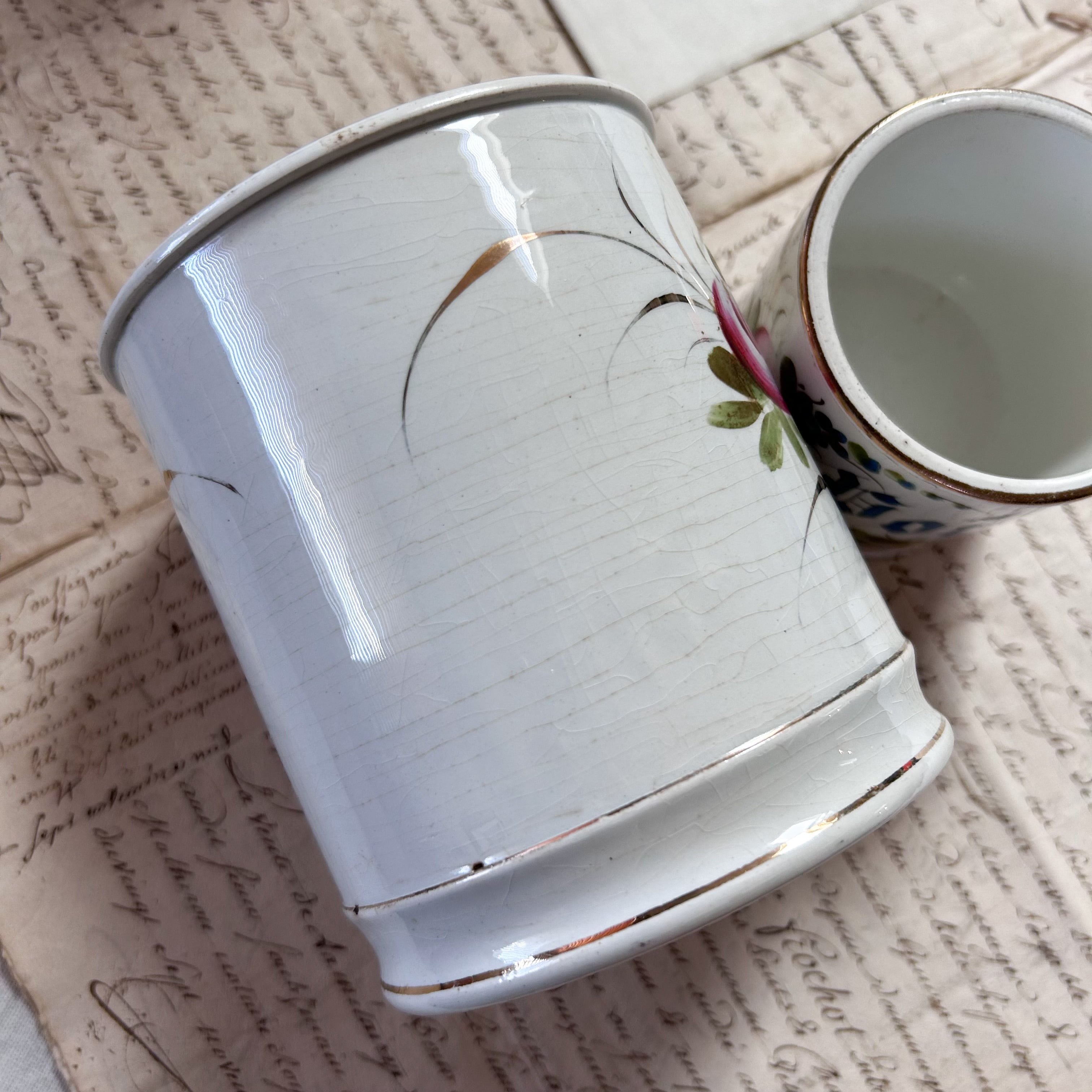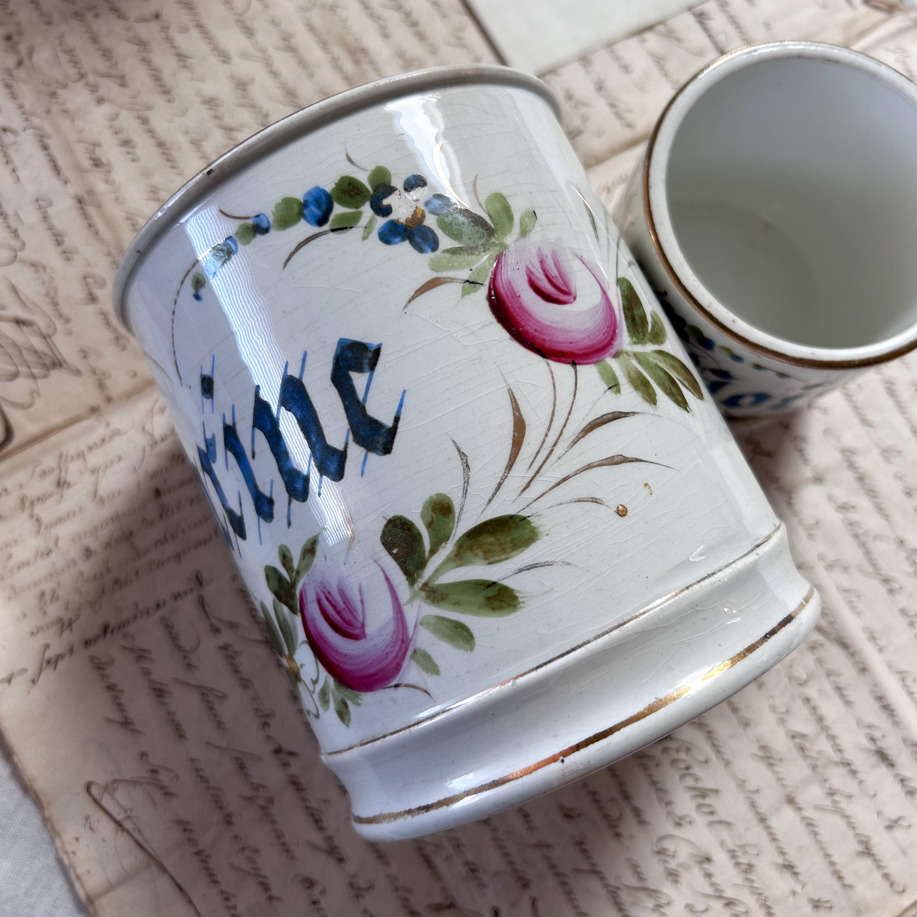 フランス・ショワジールロワ製のアンティークキャニスター。白地に手描きで描かれたピンクのバラとグリーンの葉、効果的に施された金彩、そして鮮やかなブルーのゴシック書体が印象的です。キッチンを彩る実用的かつ装飾的なアイテムとして、19世紀末から20世紀初頭にかけて愛用されました。現在では、ブロカントスタイルのインテリアに欠かせない人気のアンティークアイテムです。