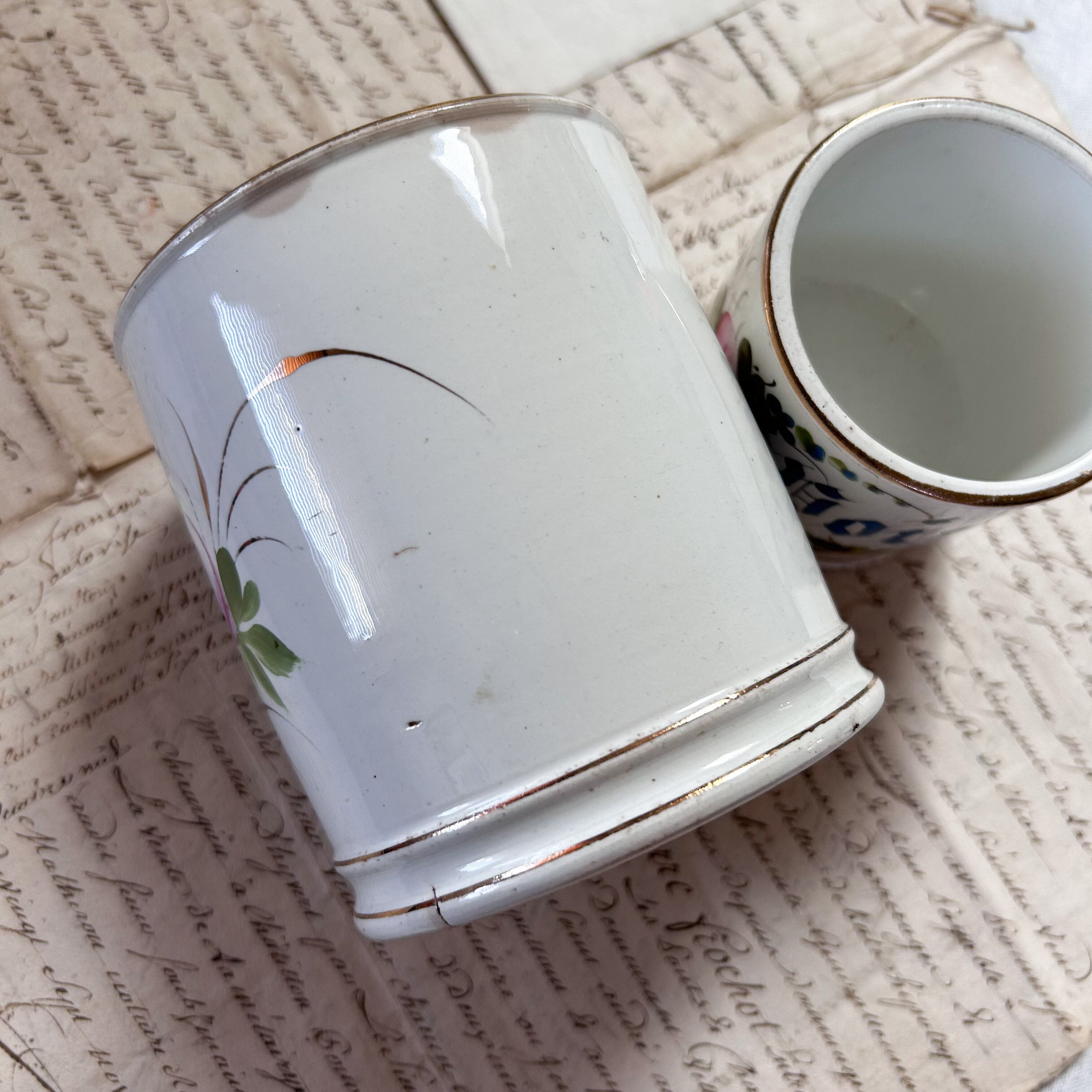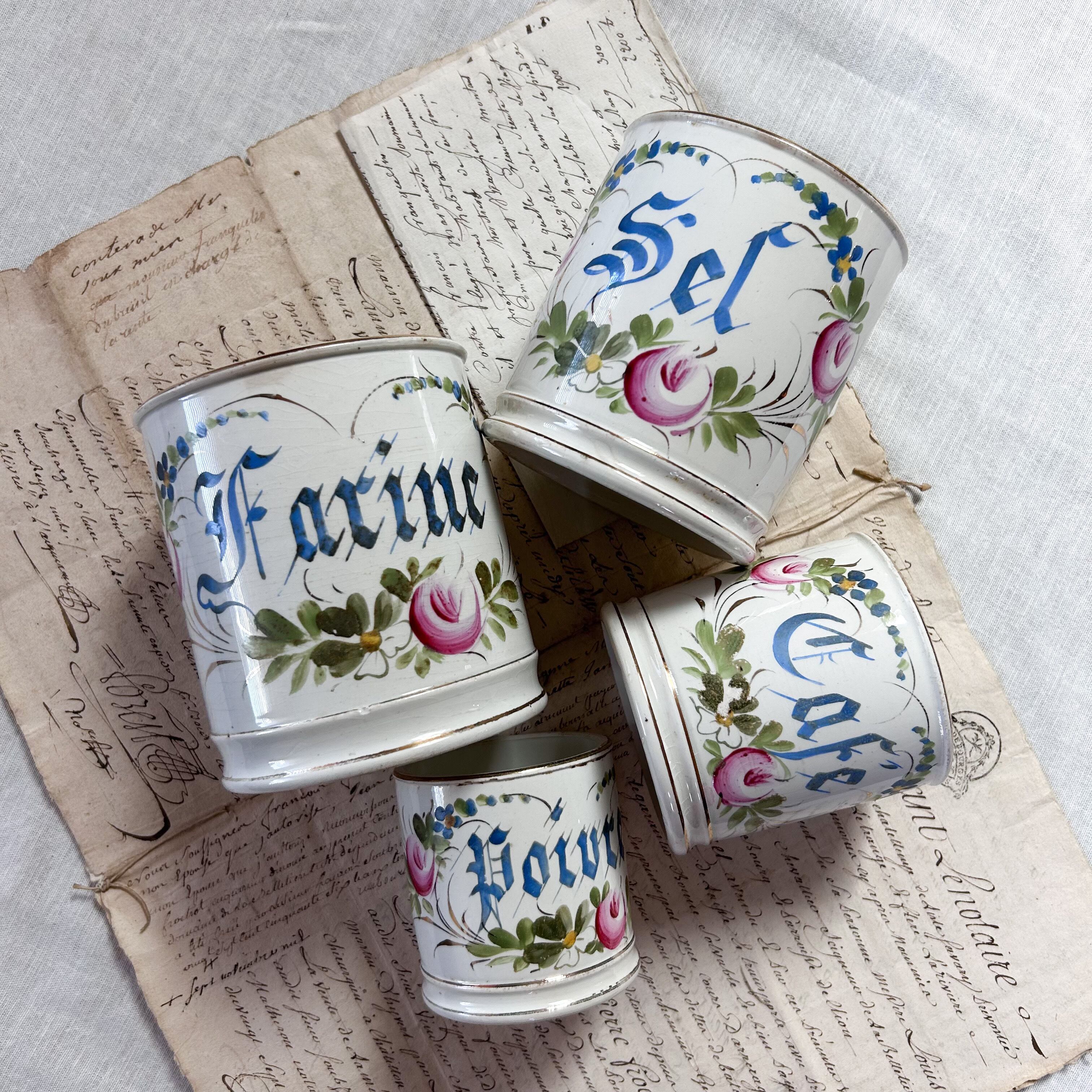フランス・ショワジールロワ製のアンティークキャニスター。白地に手描きで描かれたピンクのバラとグリーンの葉、効果的に施された金彩、そして鮮やかなブルーのゴシック書体が印象的です。キッチンを彩る実用的かつ装飾的なアイテムとして、19世紀末から20世紀初頭にかけて愛用されました。現在では、ブロカントスタイルのインテリアに欠かせない人気のアンティークアイテムです。
