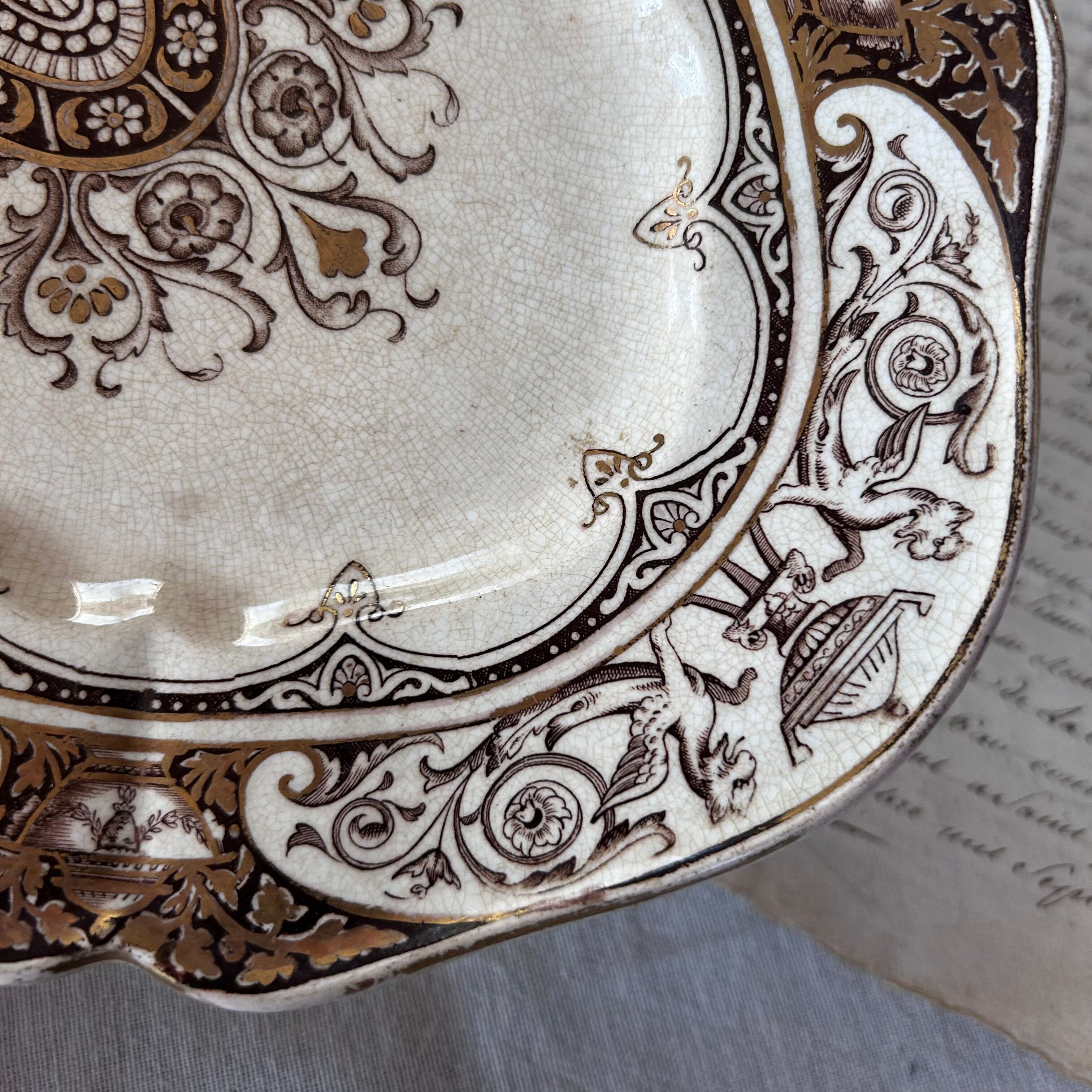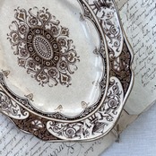 クラシカルなブラウンのトランスファープリントで装飾された、ウェッジウッドのオーバル型サービスプレート。中央には美しいシンメトリーのアラベスク模様、縁には東洋趣味を感じさせるパゴダや花瓶、植物のモチーフが配されています。複雑な装飾が施されたリム、緩やかなカーブのある縁取りが、華やかで、金彩とともに格調高い雰囲気を演出。肉料理や前菜の盛り付け、大皿料理に最適なサイズ感です。使い込まれて美しく枯れた雰囲気になっています。アンティーク感がお好きな方に特におすすめしたい唯一無二の素敵なお品です。是非お手に取ってお確かめください。