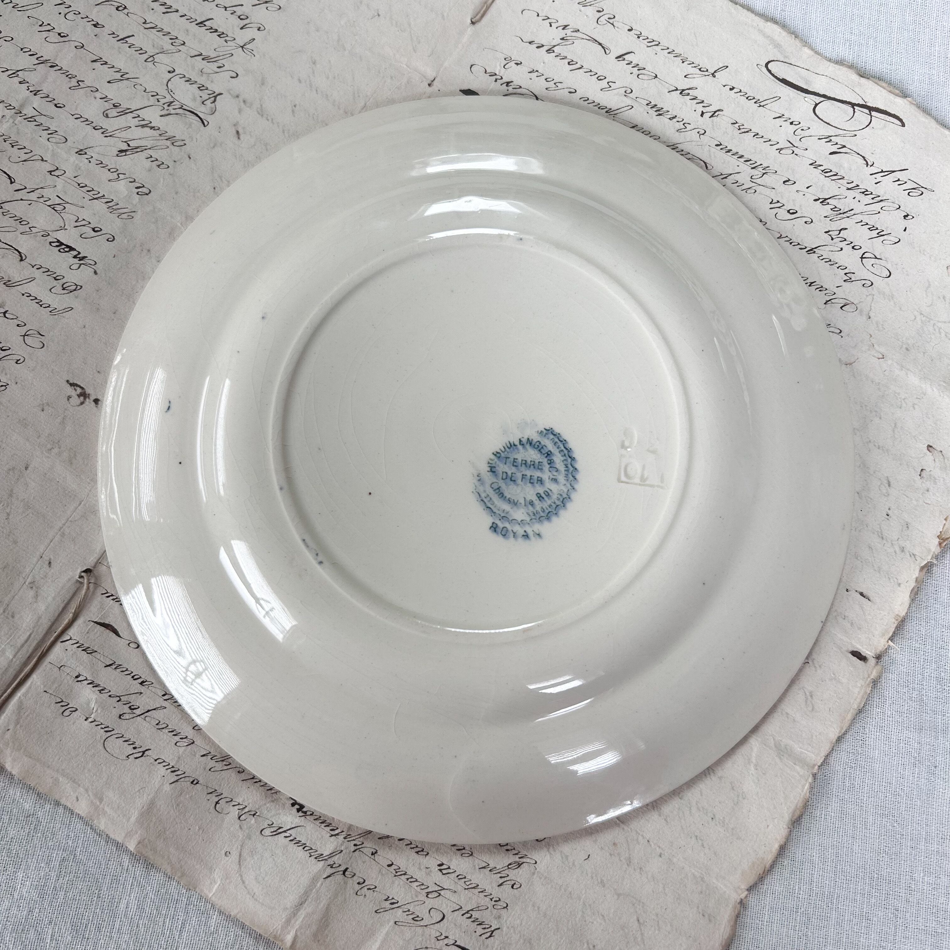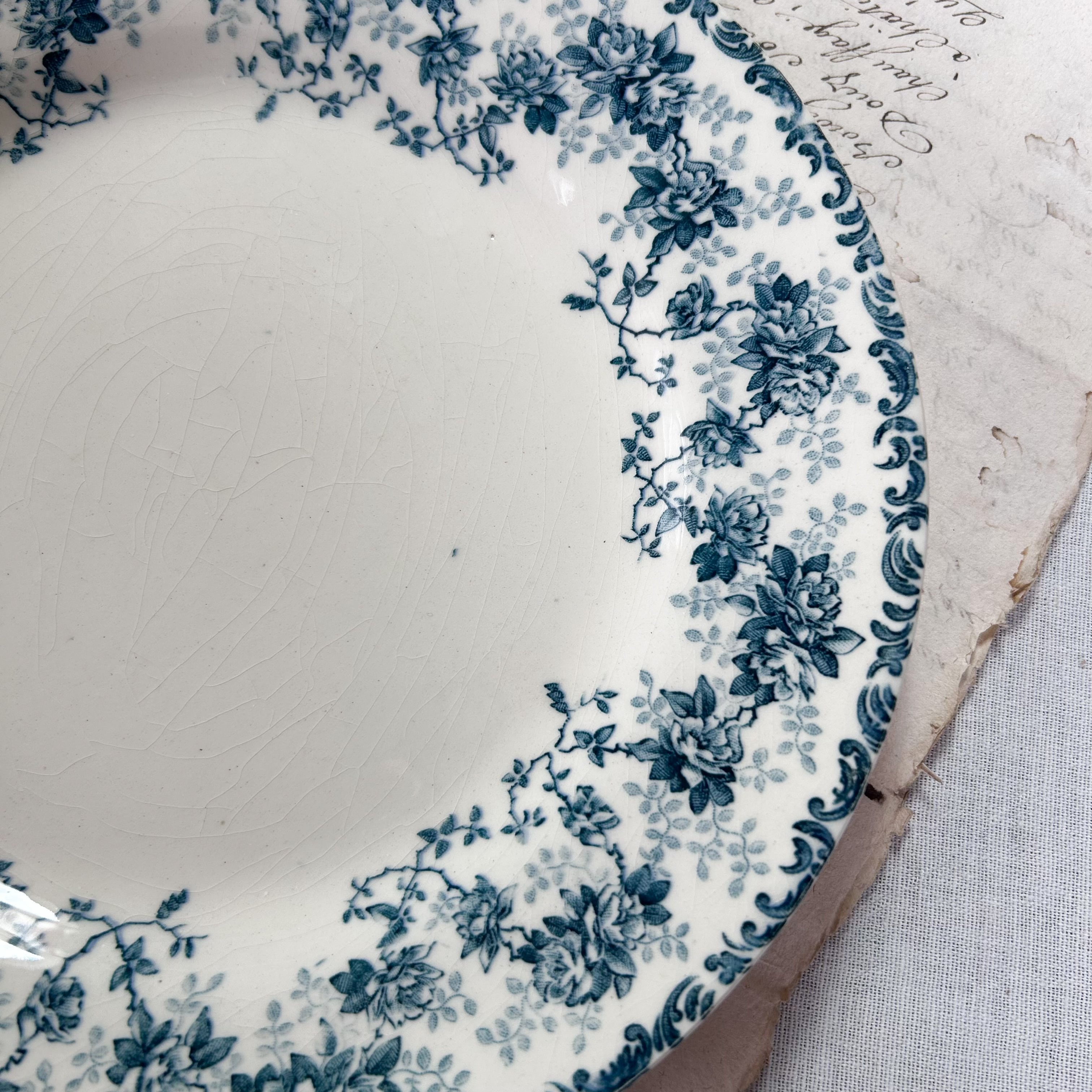 白地に深みのあるブルーで、優雅なバラをモチーフにしたガーランドが縁を彩るRoyanシリーズ。咲き誇るバラと可憐な小花、そして繊細な葉が絡み合う美しいデザインは、クラシカルなフレンチアンティークならではの魅力を感じさせます。縁取りのロカイユ模様がさらに気品を添え、テーブルを華やかに演出します。飾り皿としても存在感のある一枚です。