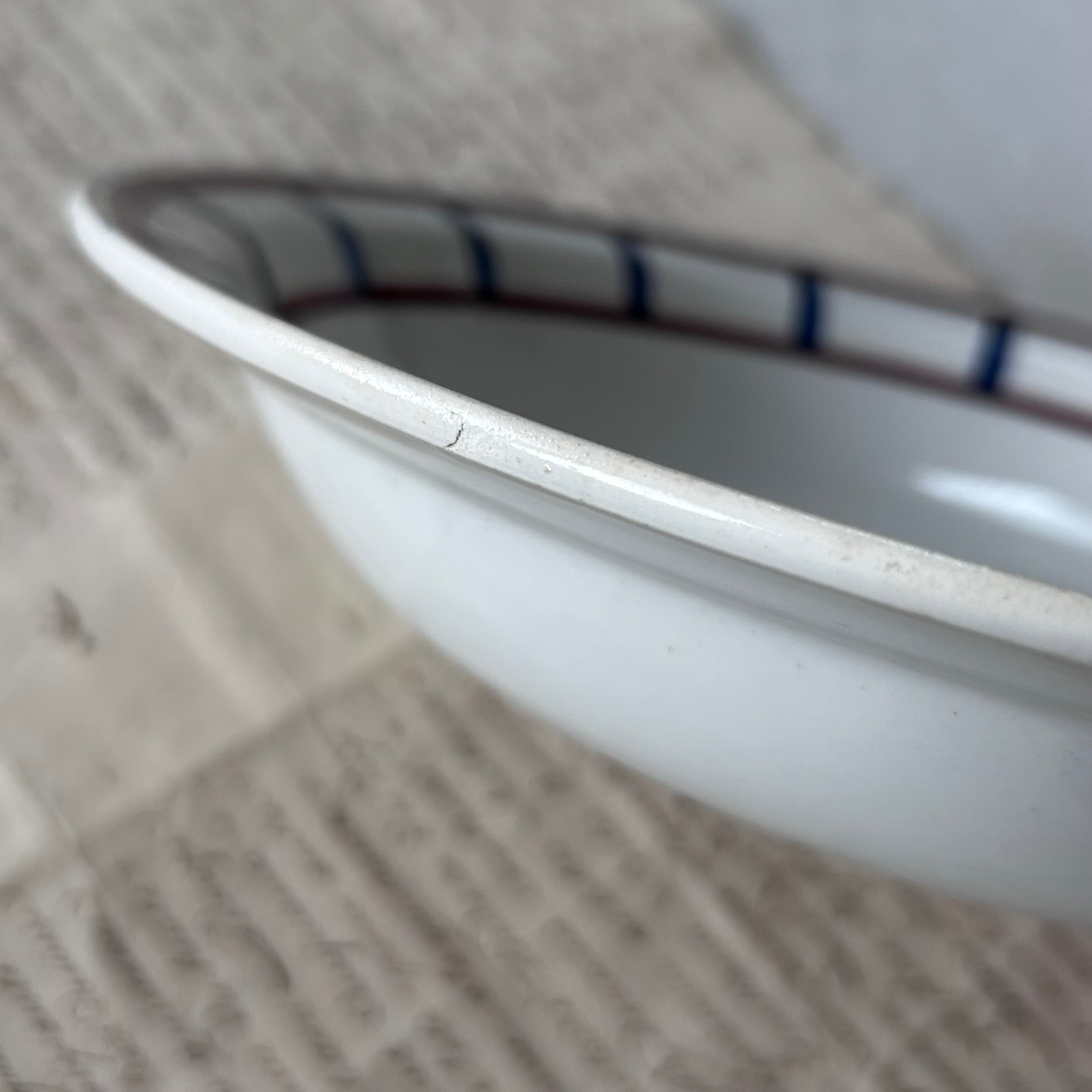 赤と青のラインが交互に並ぶ、フランスらしいトリコロールと素朴な温かみを感じさせる「バスク柄」のプレート。こちらは数あるバスク柄の中でも人気の高い、クレイユ・エ・モントロー製Bearn シリーズの一枚です。潔い直線のラインが刻むブルーとルージュのコントラストが美しく、田舎のビストロを思わせる懐かしい雰囲気。白磁とのバランスもよく、和洋問わず日常使いに取り入れやすいのが魅力です。