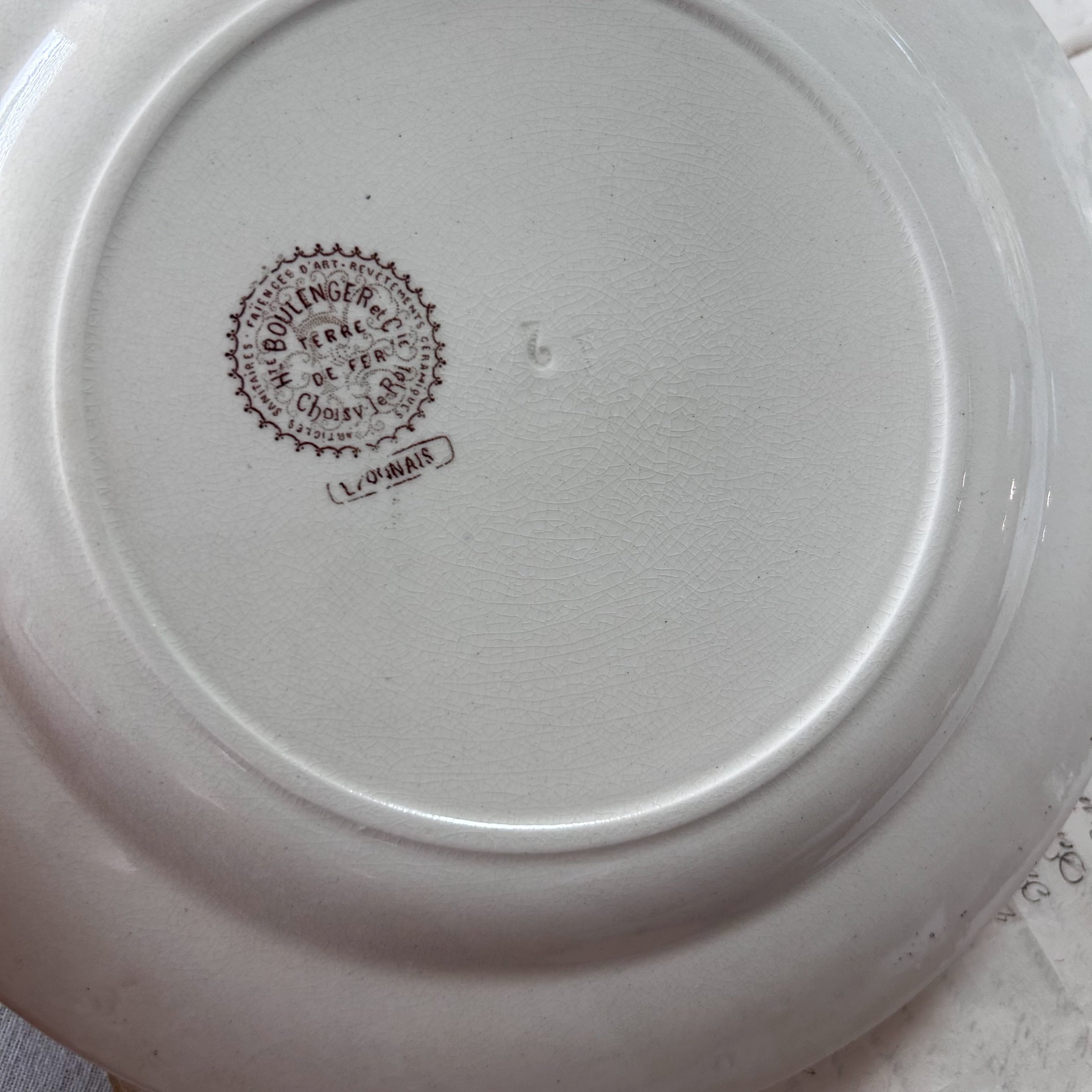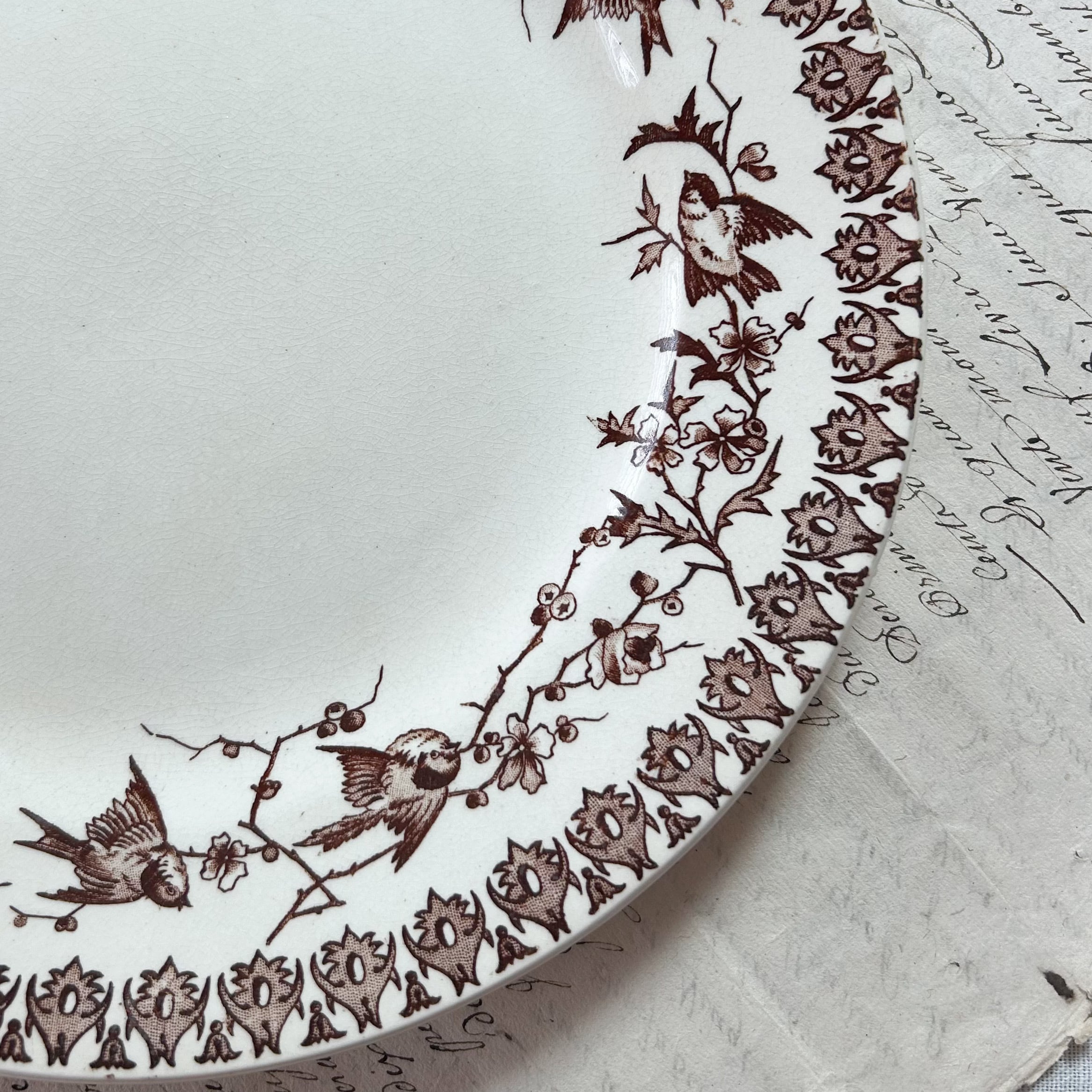 リムいっぱいに小鳥と植物が繊細に描かれた、Lyonnais の美しいプレート。ブラウンの転写によるデザインは、優雅で落ち着いた印象を与え、自然の情景が生き生きと表現されています。