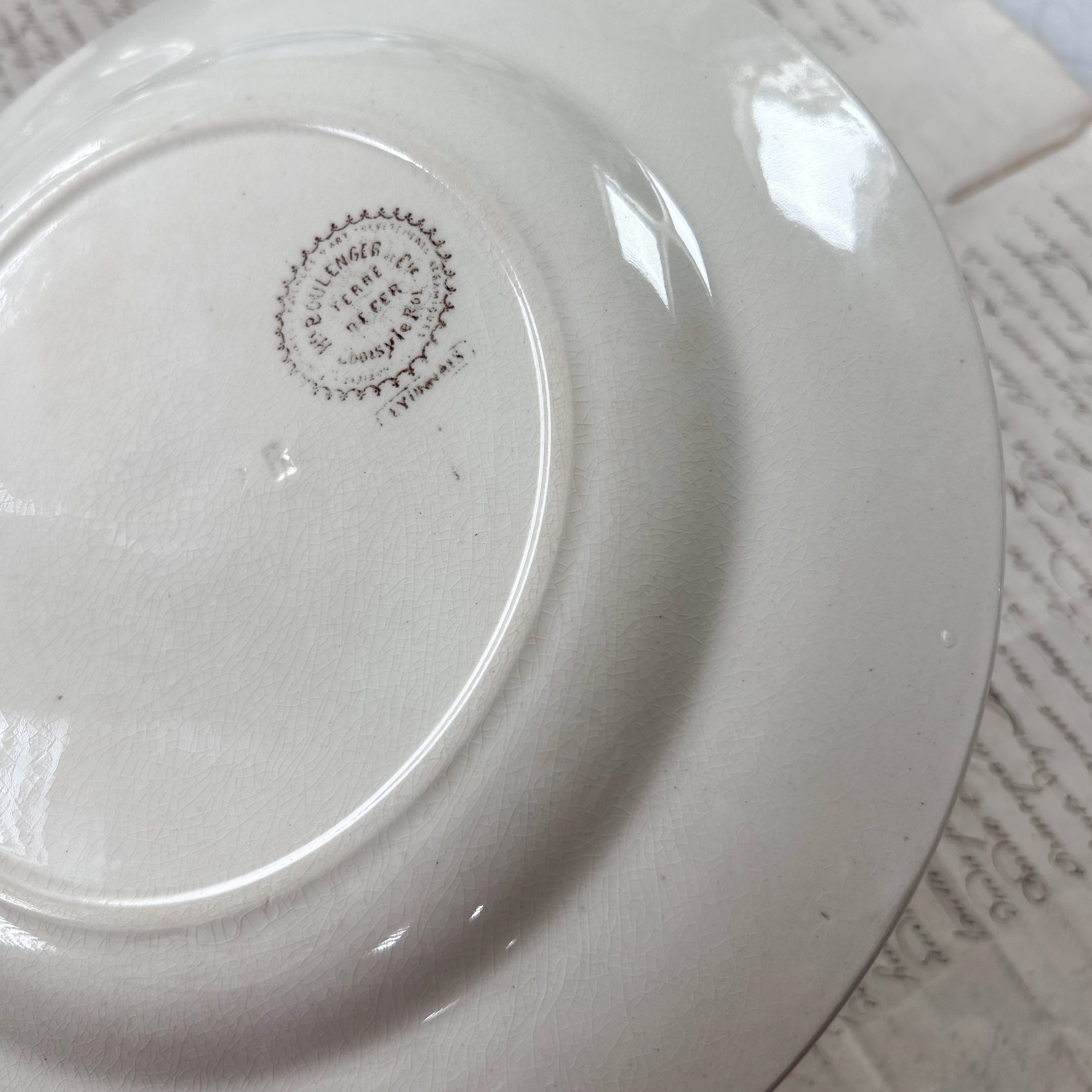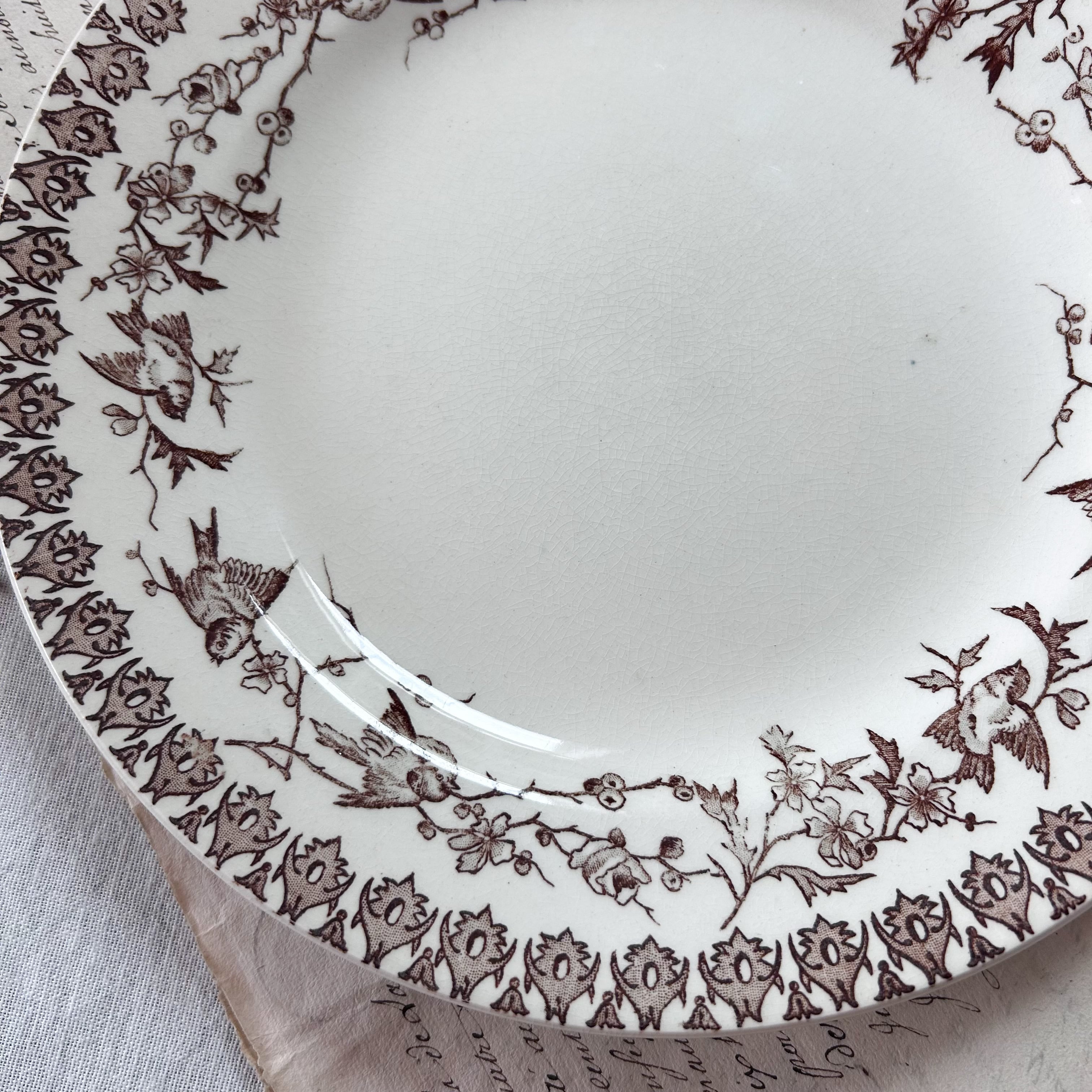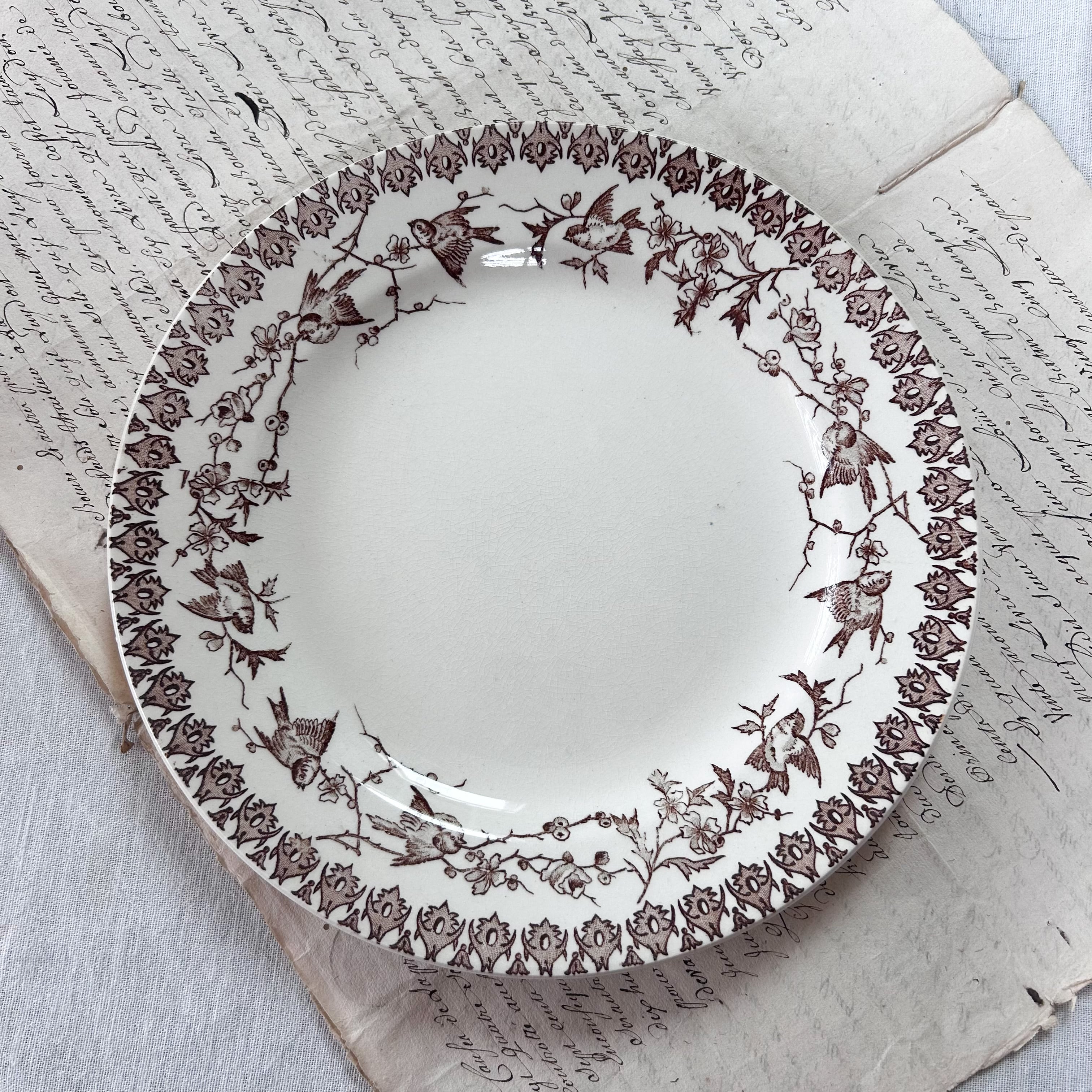 リムいっぱいに小鳥と植物が繊細に描かれた、Lyonnais の美しいプレート。ブラウンの転写によるデザインは、優雅で落ち着いた印象を与え、自然の情景が生き生きと表現されています。