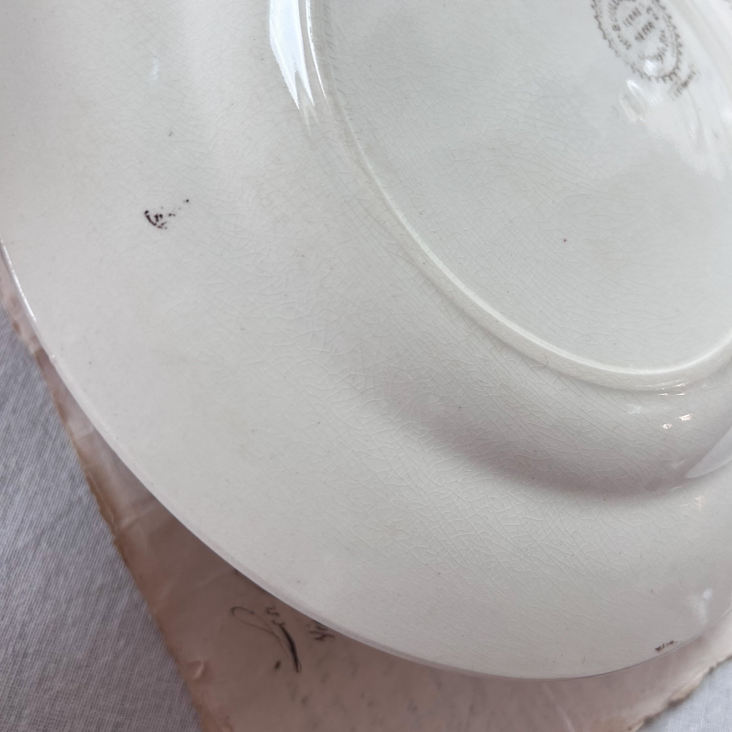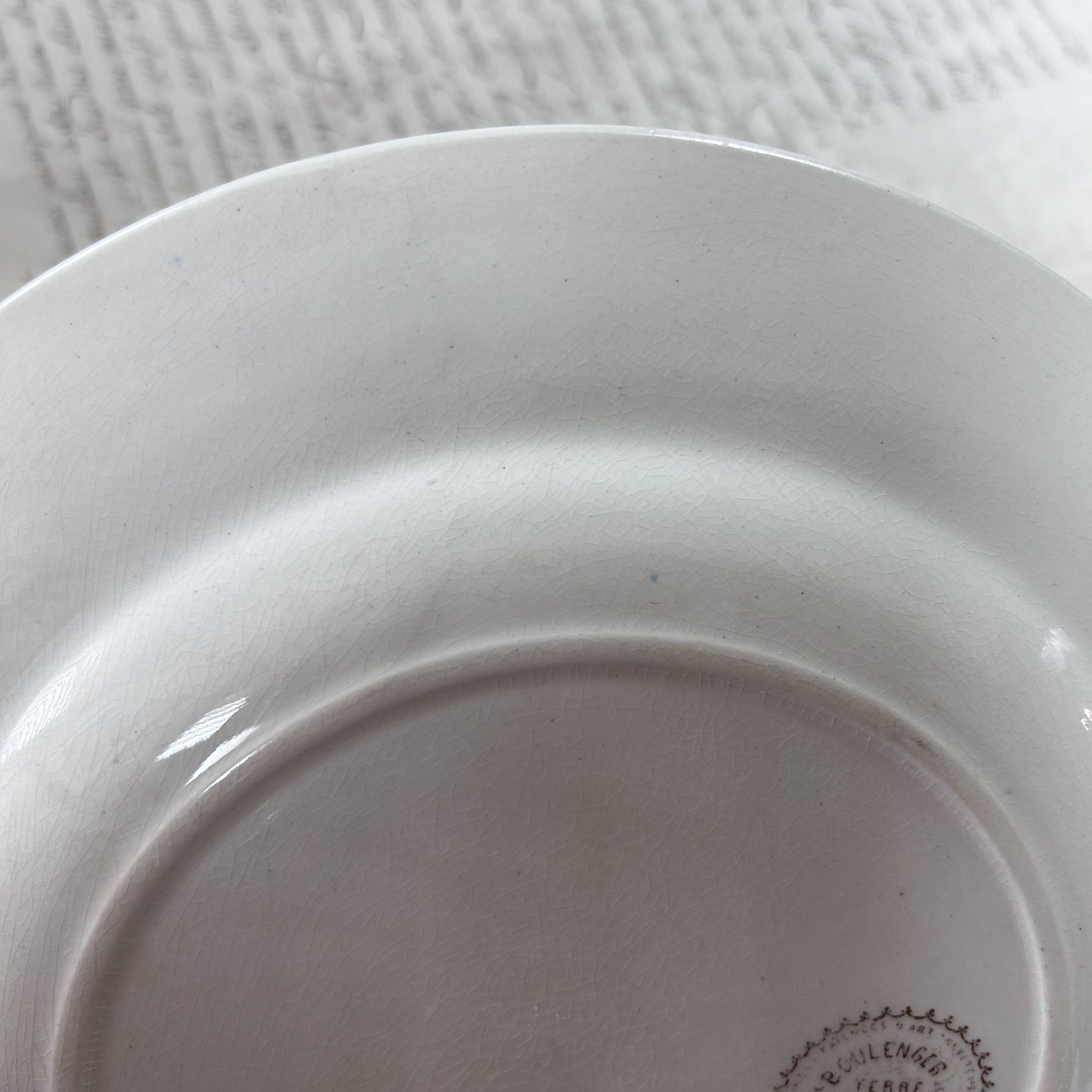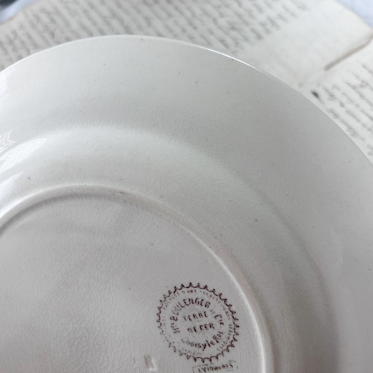 リムいっぱいに小鳥と植物が繊細に描かれた、Lyonnais の美しいプレート。ブラウンの転写によるデザインは、優雅で落ち着いた印象を与え、自然の情景が生き生きと表現されています。