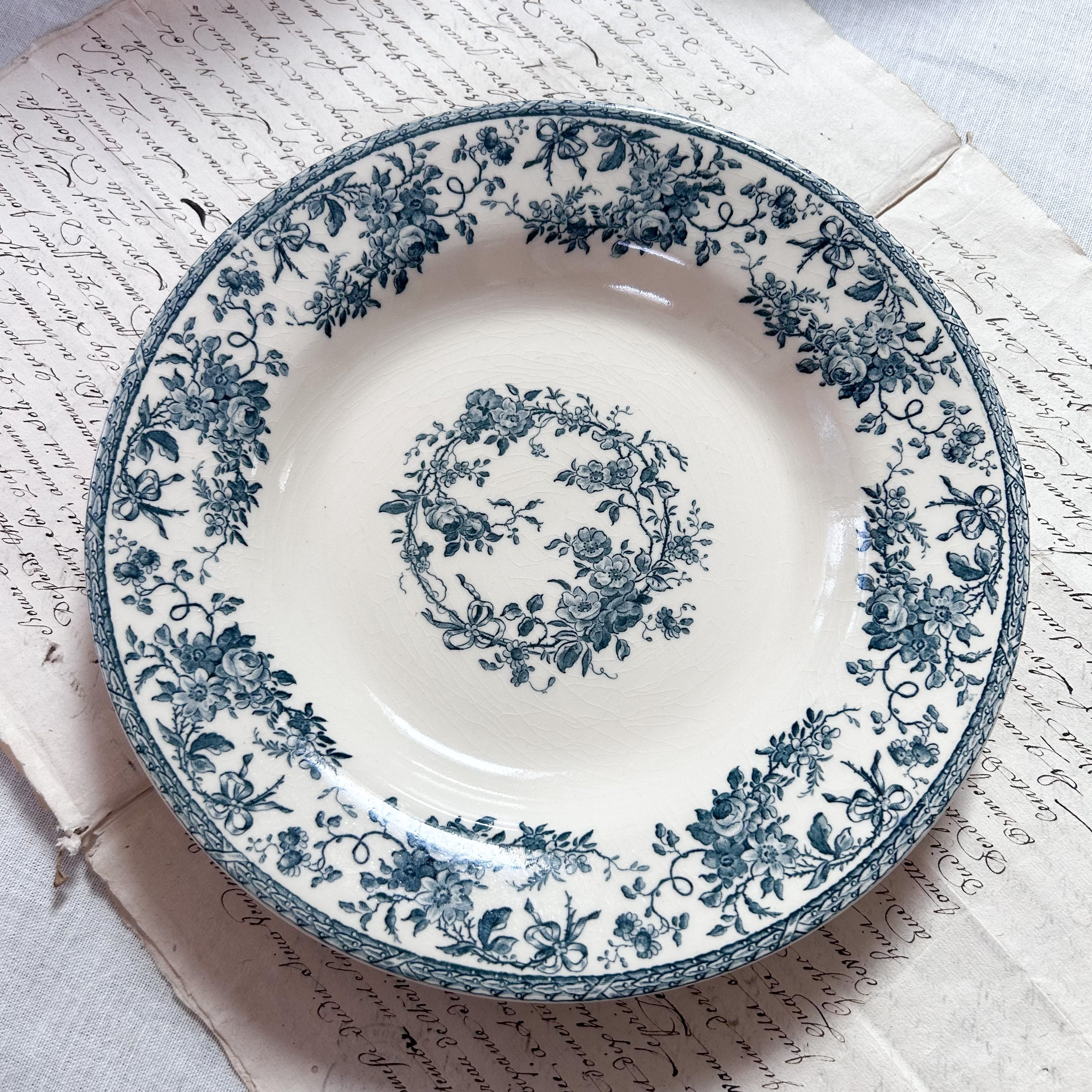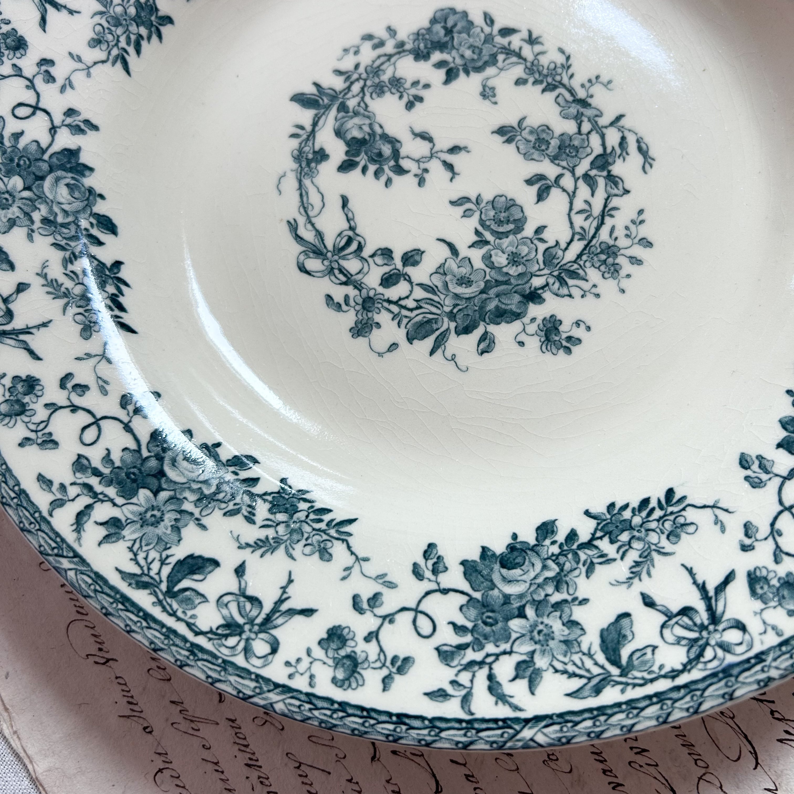フランス・ジアンによるアンティークプレート。バックスタンプに「MEDAILLESD'OR(メダイユ・ドール)」の刻印があり、時の博覧会で金賞を受賞した栄誉を示しています。アイボリー地にブルーグリーンの花々とリボンのガーランドを配した優美なデザインで、中央にはバラのリースが描かれています。繊細でロマンティックな意匠は、テーブルにクラシカルな趣を添えます。