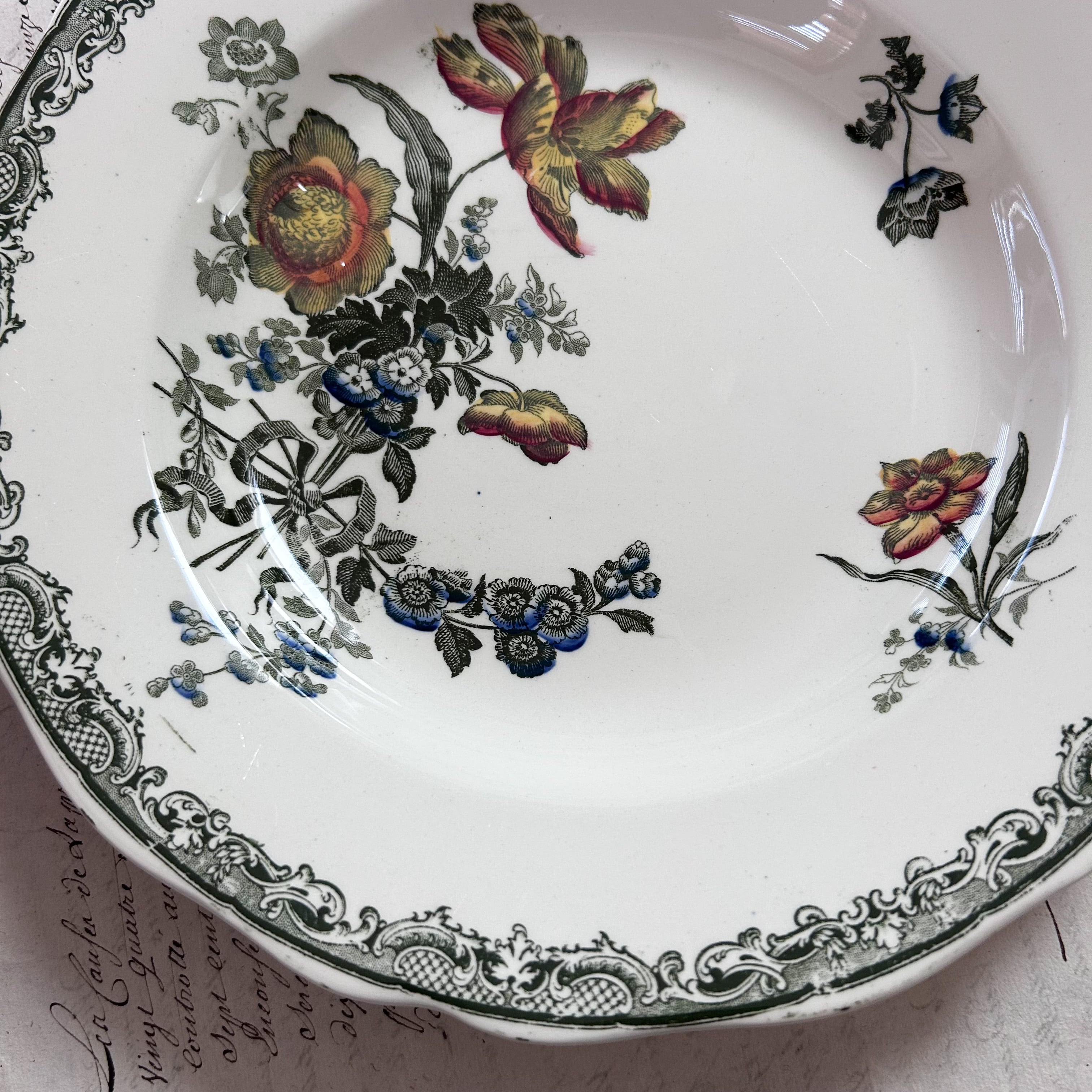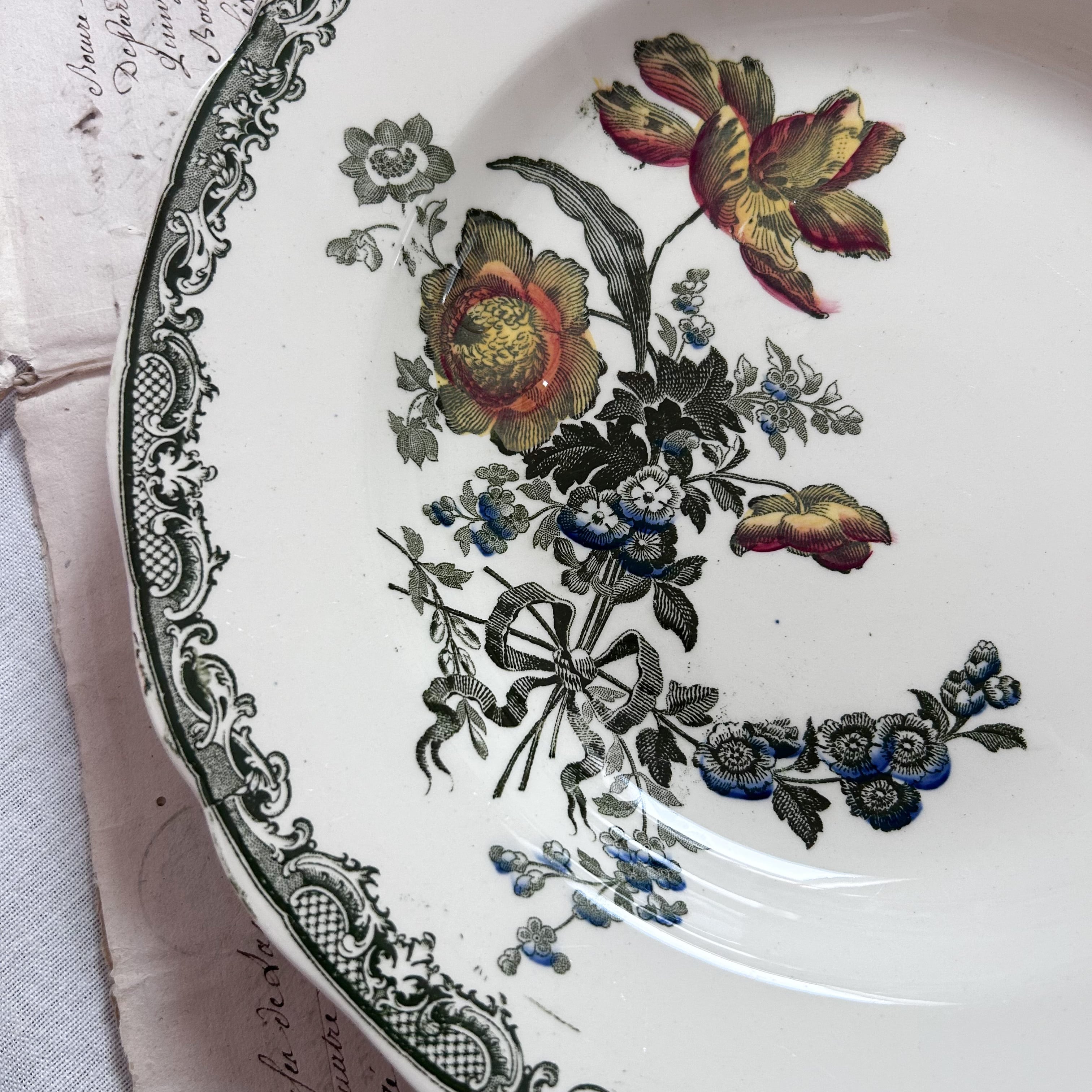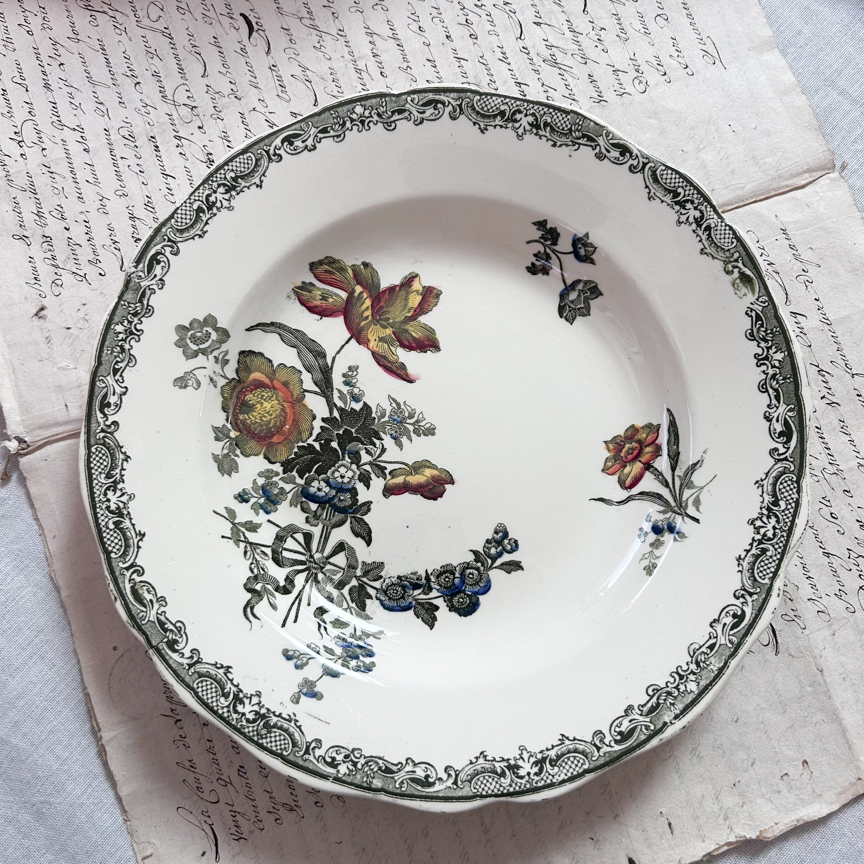淡いグリーンの繊細な縁飾りに、鮮やかな花々を多色刷りであしらった華やかな一枚です。朱赤や黄色、青の花がバランスよく配置され、リボンの装飾がロマンティックな雰囲気を添えています。サルグミンヌらしい柔らかな陶肌に、彩り豊かな花々が生き生きと映える、優雅で存在感あるかなりレアな深皿です。スープやパスタ、盛皿として特別な日に使いたいお品です。