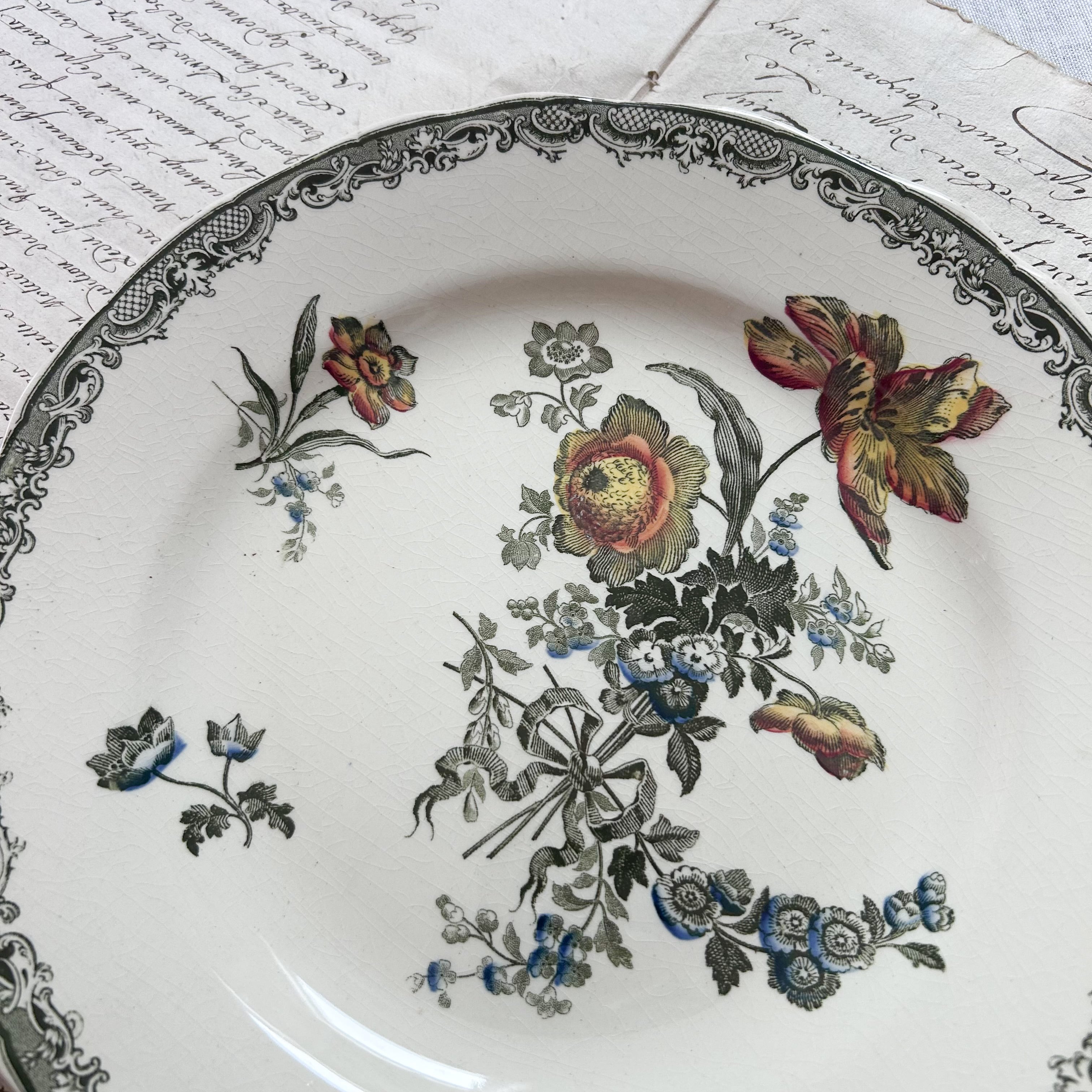 淡いグリーンの繊細な縁飾りに、鮮やかな花々を多色刷りであしらった華やかな一枚です。朱赤や黄色、青の花がバランスよく配置され、リボンの装飾がロマンティックな雰囲気を添えています。サルグミンヌらしい柔らかな陶肌に、彩り豊かな花々が生き生きと映える、優雅で存在感あるかなりレアな深皿です。ディナープレートとして特別な日に使いたいお品です。