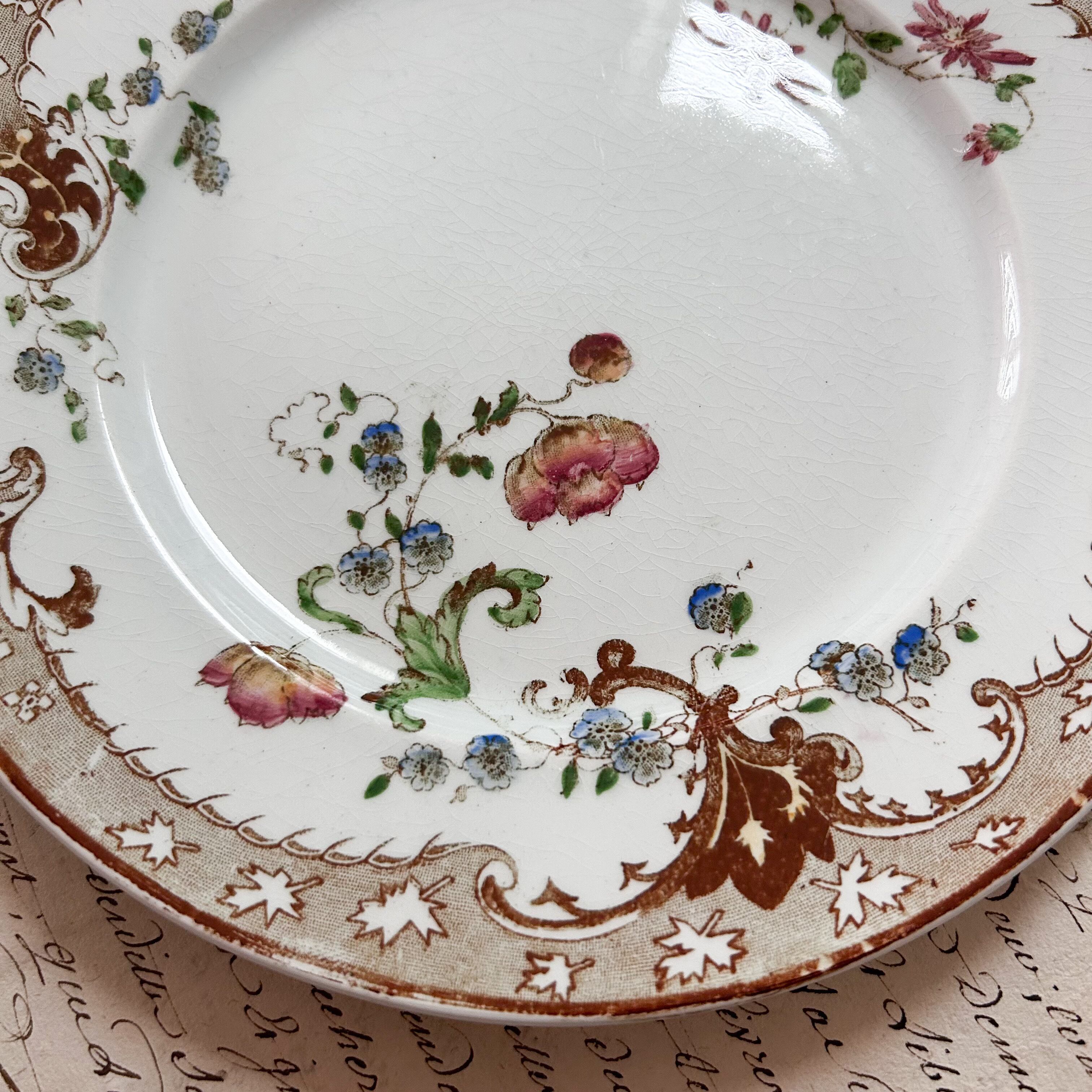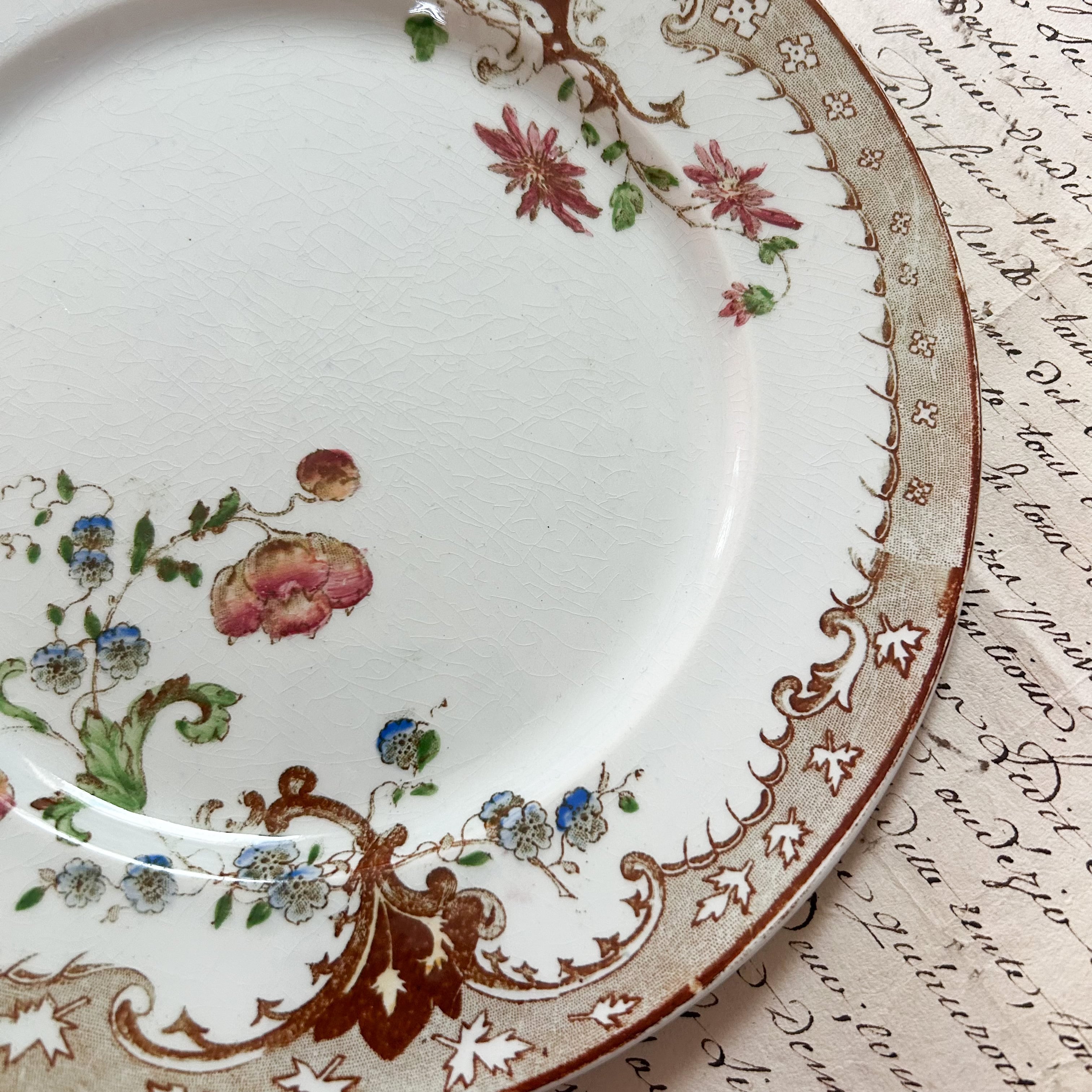 温かみのある白地に、茶色の縁取りとスクロール装飾が施され、中央には繊細な多色刷りの花々があしらわれたエレガントなプレートです。可憐なブルーやローズの花々と、優雅なリム装飾が調和し、19世紀フランス陶器らしいクラシカルな気品を漂わせています。これからの季節にぴったりの色目。ディスプレイとしても存在感があり、テーブルを華やかに彩る一枚です。
