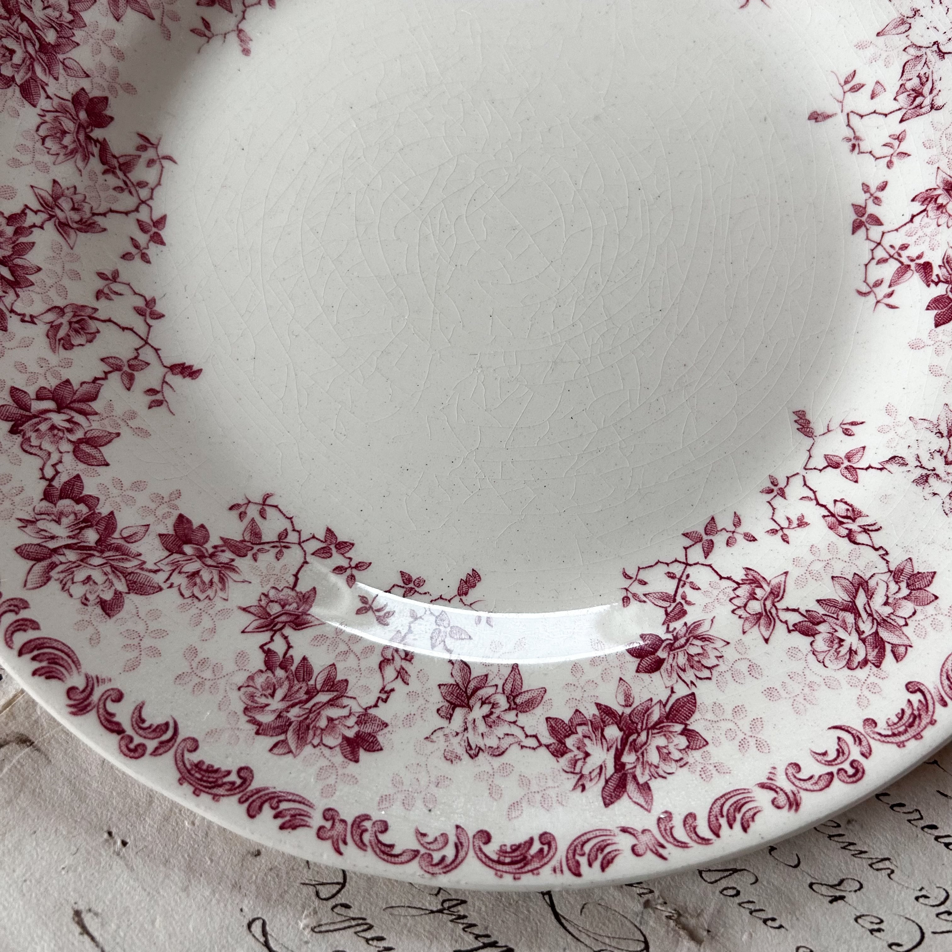 白地に深みのある赤で、優雅なバラをモチーフにしたガーランドが縁を彩るRoyanシリーズ。咲き誇るバラと可憐な小花、そして繊細な葉が絡み合う美しいデザインは、クラシカルなフレンチアンティークならではの魅力を感じさせます。縁取りのロカイユ模様がさらに気品を添え、テーブルを華やかに演出します。飾り皿としても存在感のある一枚です。