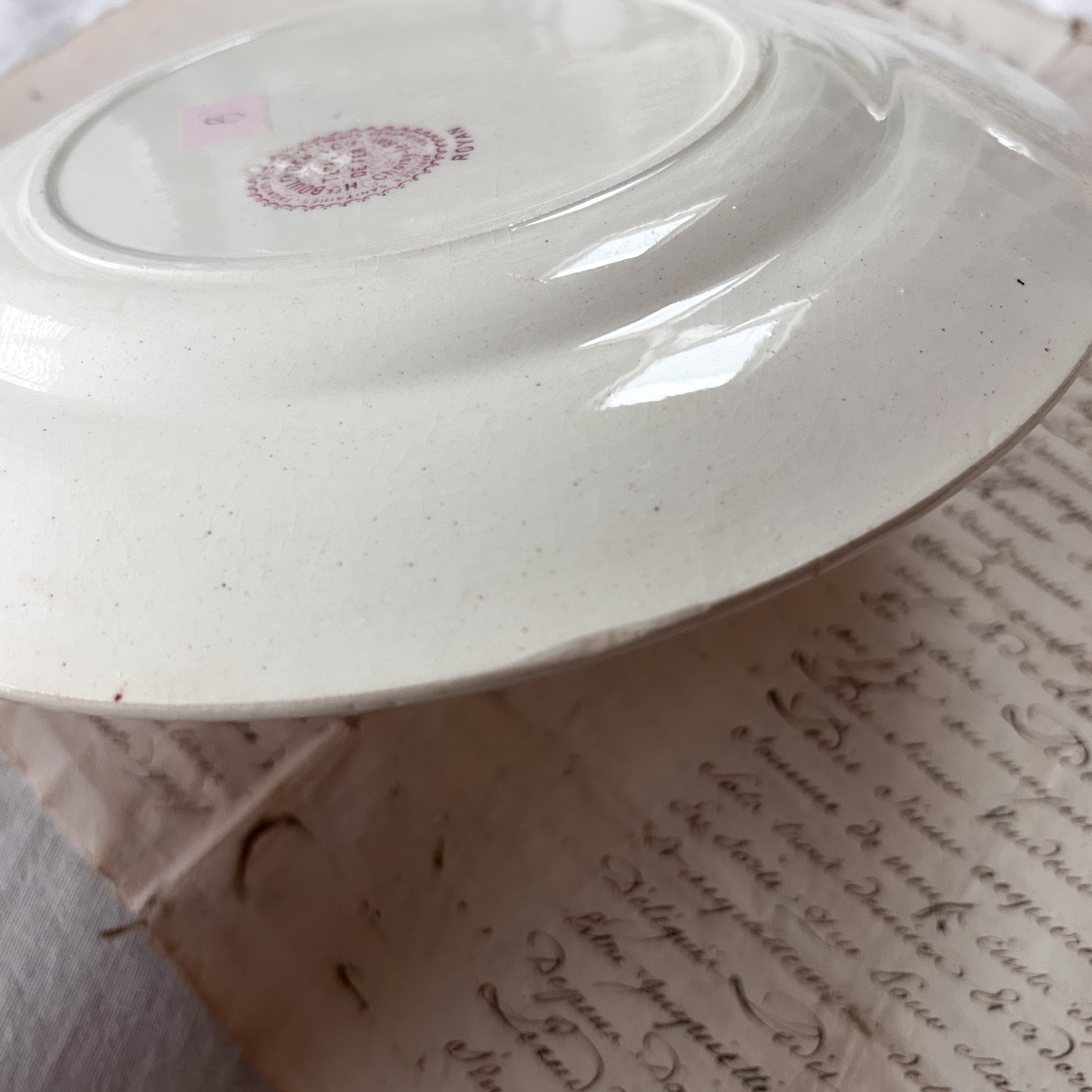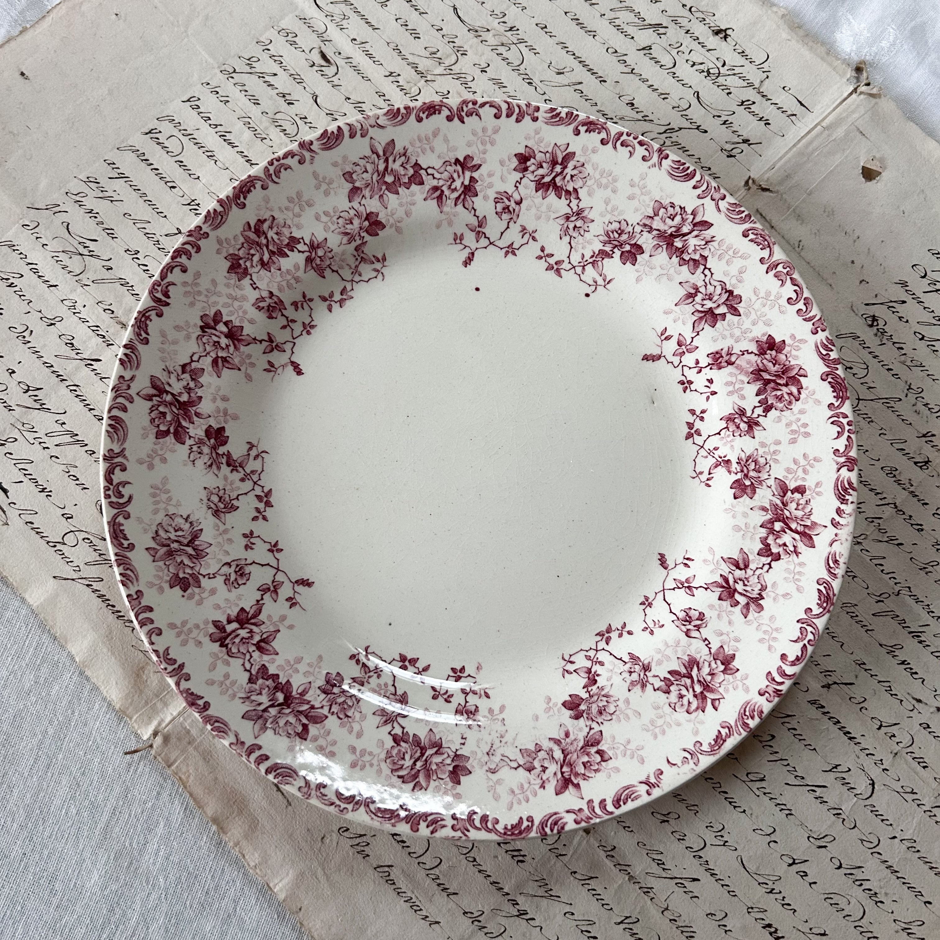 白地に深みのある赤で、優雅なバラをモチーフにしたガーランドが縁を彩るRoyanシリーズ。咲き誇るバラと可憐な小花、そして繊細な葉が絡み合う美しいデザインは、クラシカルなフレンチアンティークならではの魅力を感じさせます。縁取りのロカイユ模様がさらに気品を添え、テーブルを華やかに演出します。飾り皿としても存在感のある一枚です。