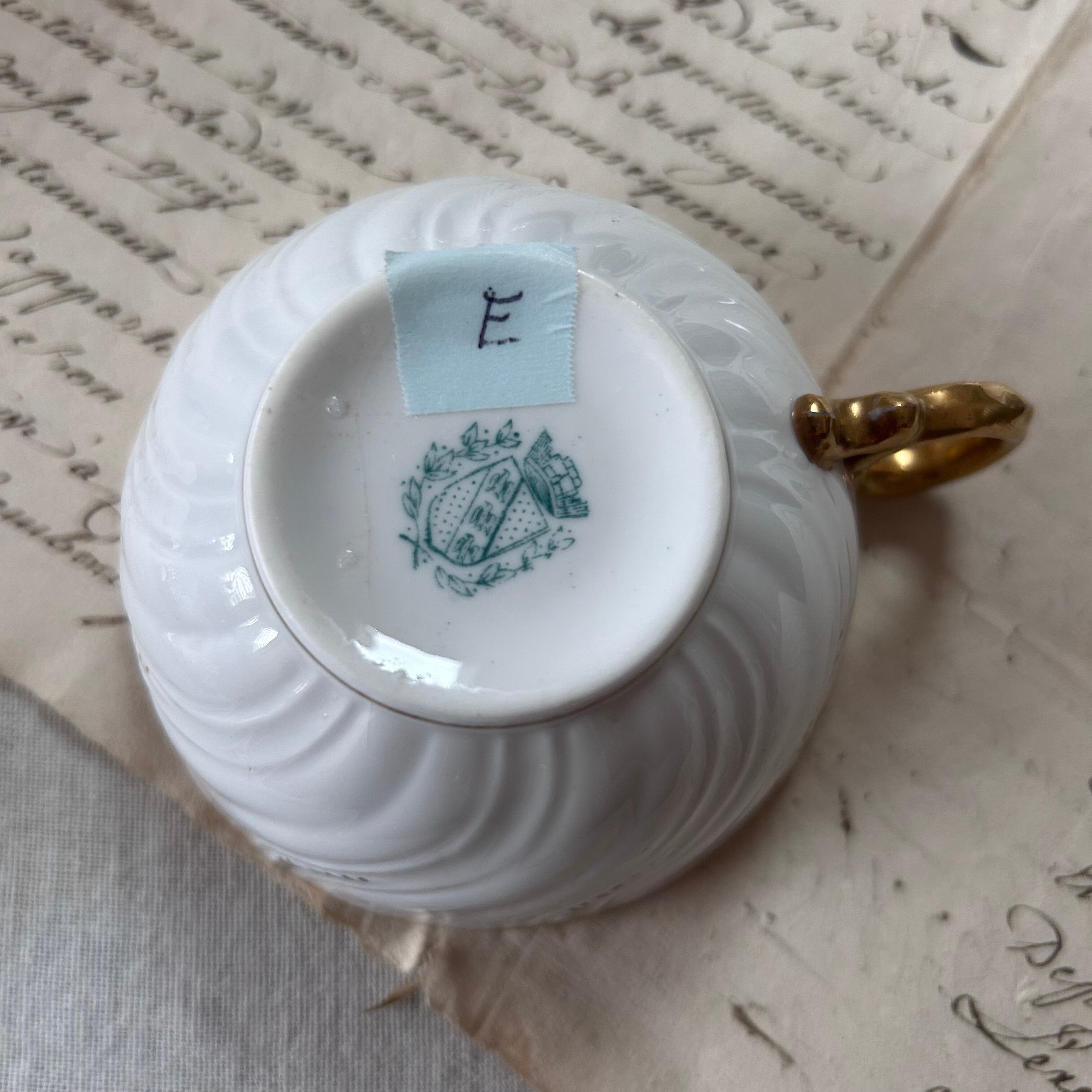 サルグミンヌ製の優美なアンティークカップ&ソーサー。スワールレリーフが施されたシェイプに、ハンドペイントの金彩がアクセントとなっています。縁取りの金彩はエレガントで、アンティークならではのクラシカルな雰囲気を醸し出します。紅茶やコーヒータイムを華やかに演出する一品です。