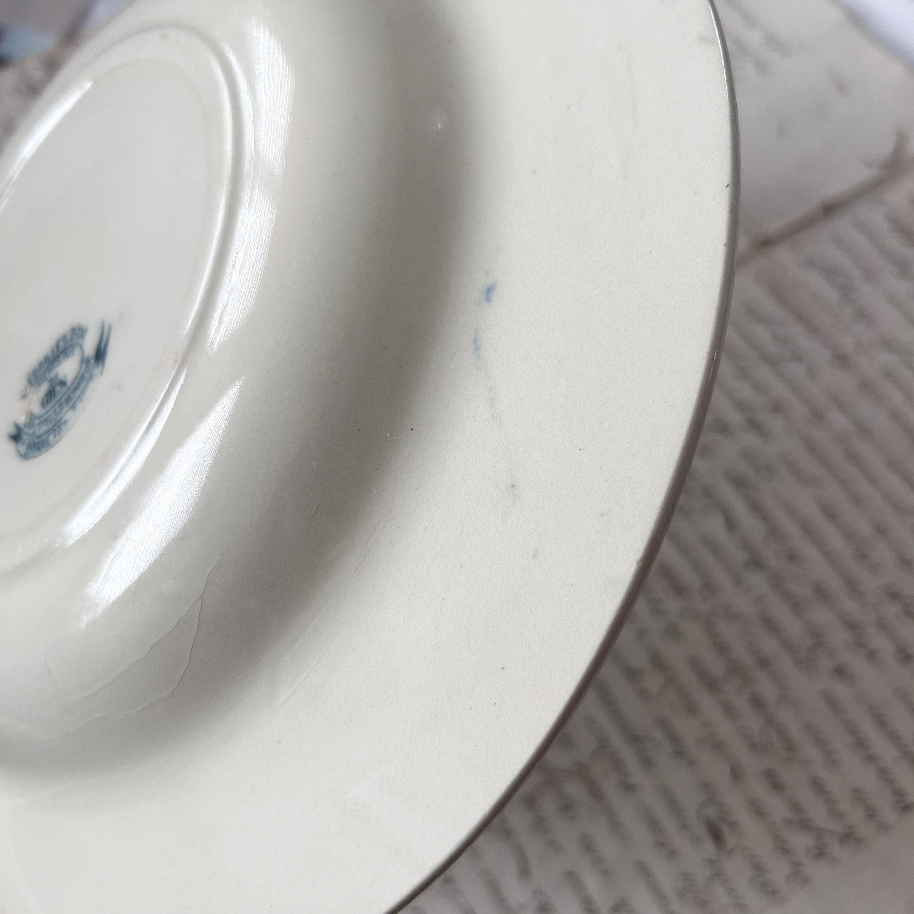 フランス・ジアンによるアンティークプレート。バックスタンプに「MEDAILLESD'OR(メダイユ・ドール)」の刻印があり、時の博覧会で金賞を受賞した栄誉を示しています。アイボリー地にブルーグリーンの花々とリボンのガーランドを配した優美なデザインで、中央にはバラのリースが描かれています。繊細でロマンティックな意匠は、テーブルにクラシカルな趣を添えます。