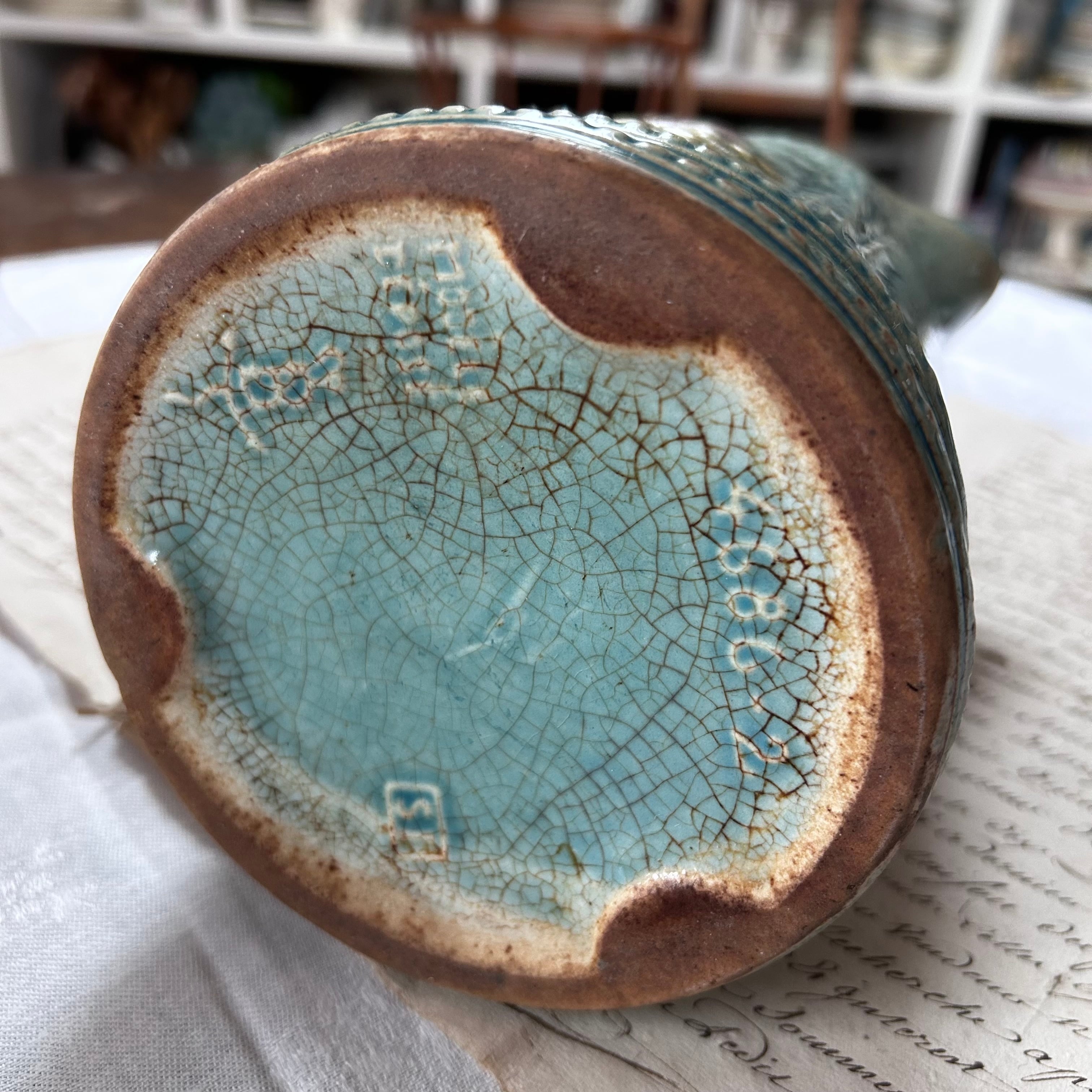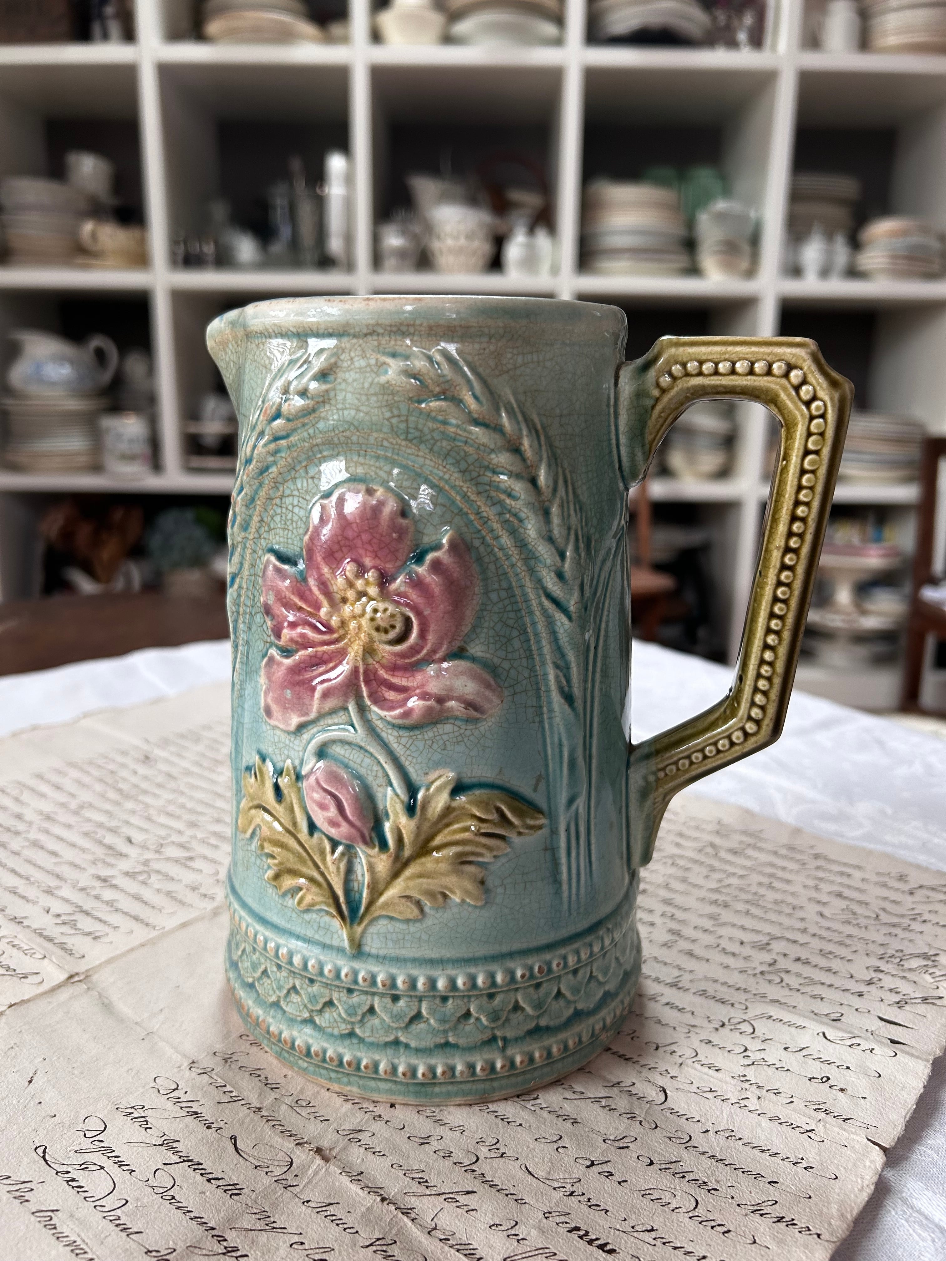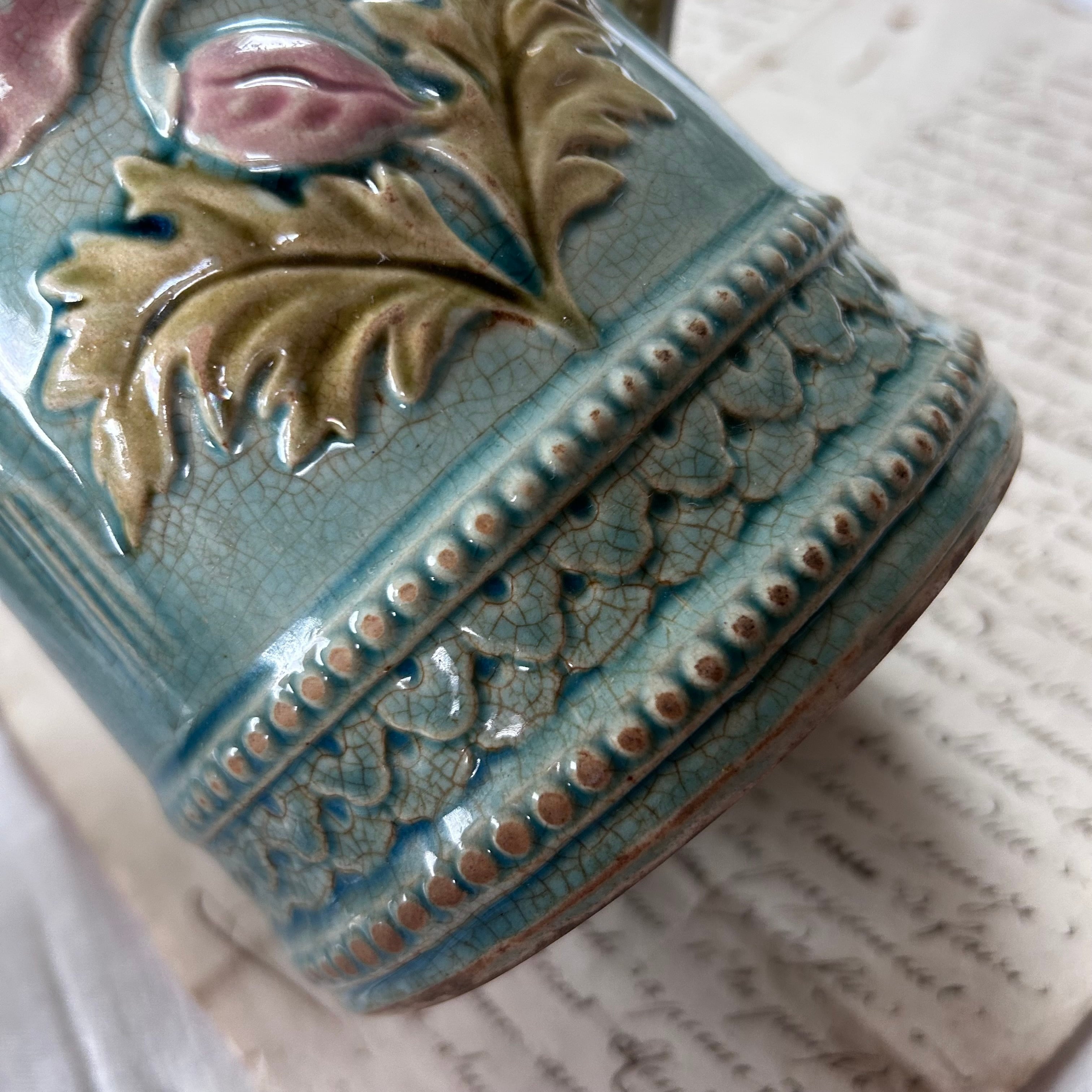 ターコイズグリーンを基調に、ピンクの大輪の花と蕾が立体的にあしらわれた、美しいバルボティーヌのピシェです。特筆すべきはこの優しい色合い。またレリーフ状に浮き上がった花模様に艶やかな釉薬が重なり合い、光の加減によって豊かな表情を見せてくれます。ハンドル部分や下部の方には繊細なビーズ装飾が施され、アンティークらしい気品と存在感を放ちます。