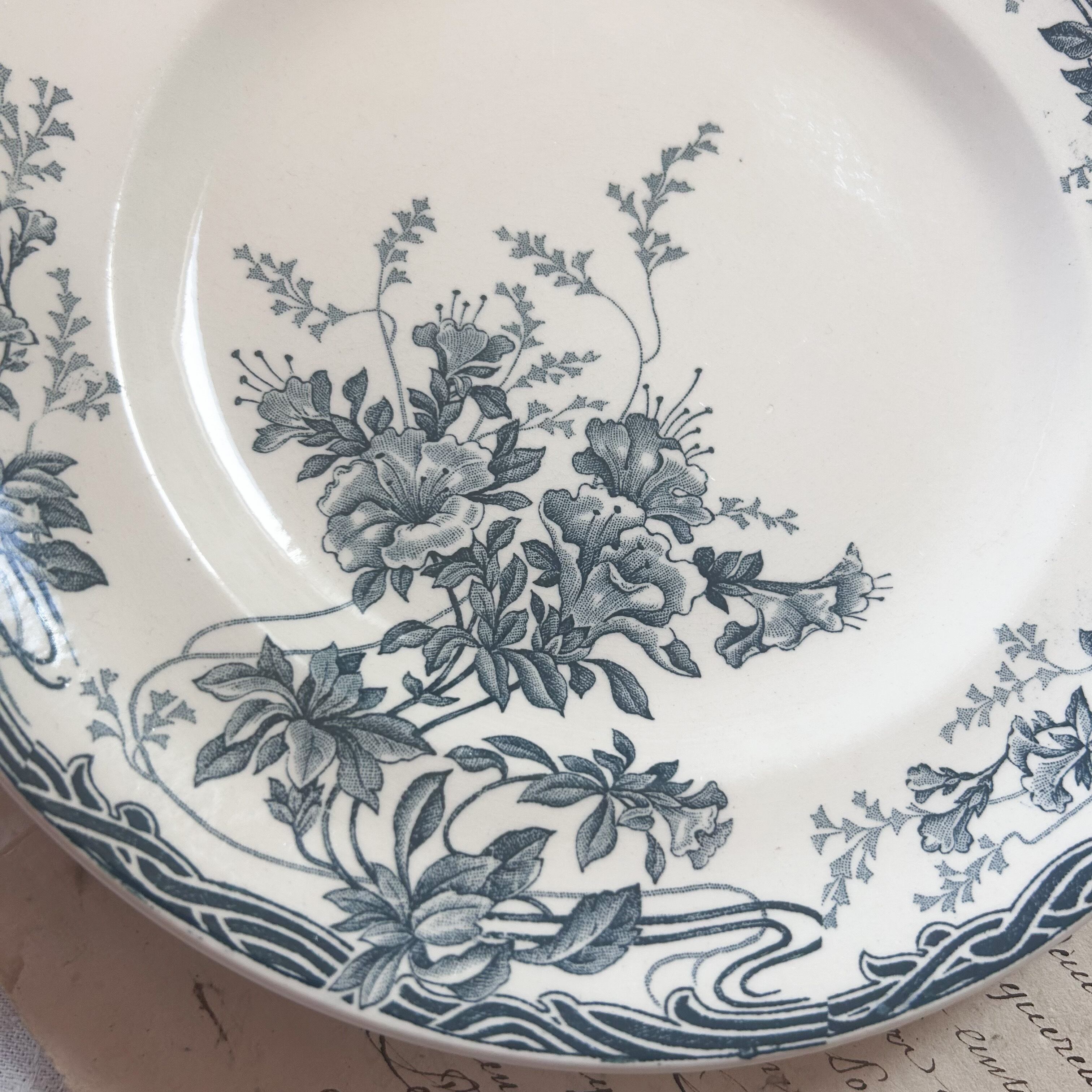 フランス・ロンウィ窯による「Azalles」シリーズのプレート。淡いブルーグレーで描かれたアザレ(ツツジ)の花が、リムから中央にかけて優美に広がります。縁には流れるようなモチーフがあしらわれ、柔らかな曲線がクラシカルな魅力を引き立てています。テーブルに品格と華やかさを添える一枚です。