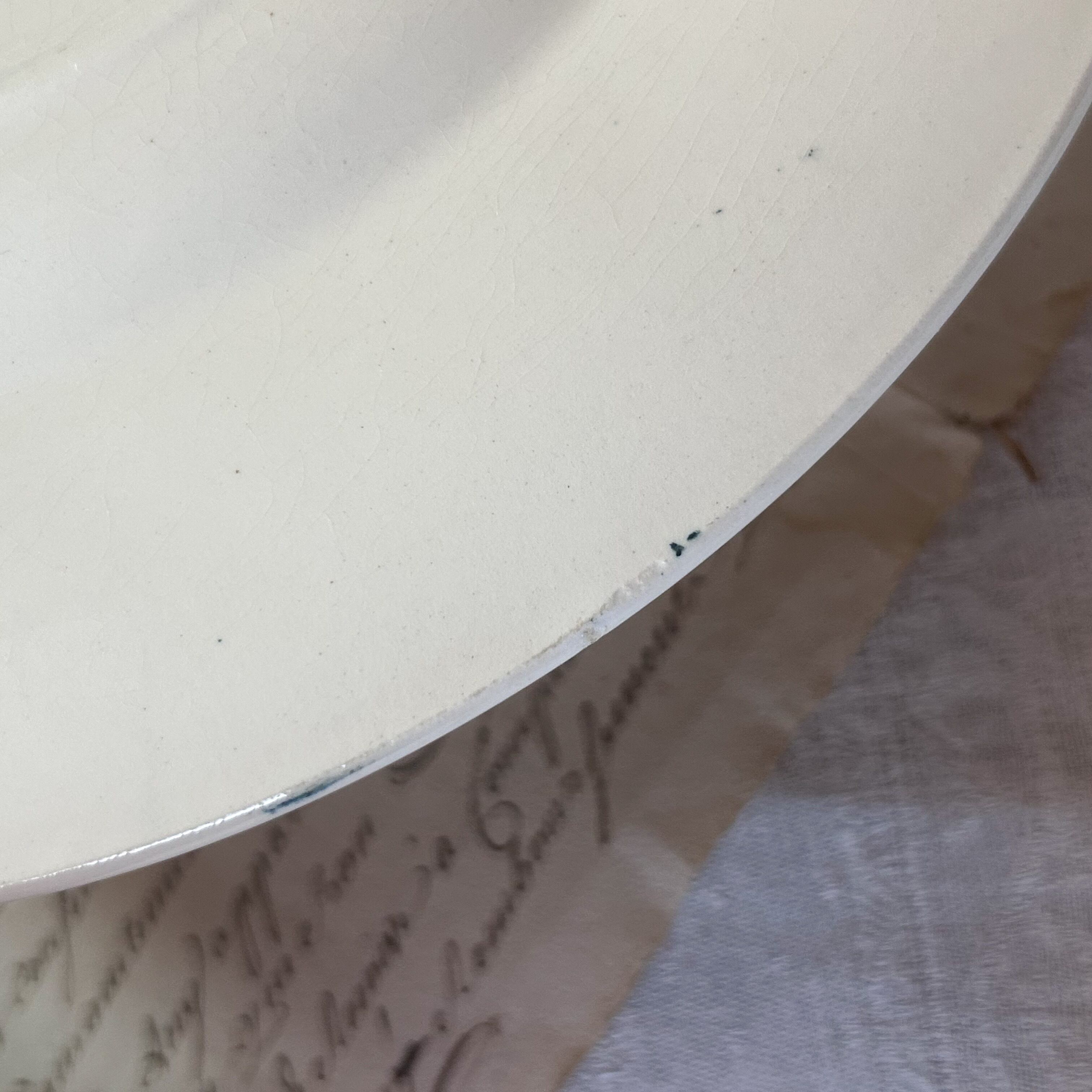 裏面の凹み、ライン状の窯傷、スレ状の窯傷は釉薬がのっています。見込み部に釉薬の剥がれあり。その他釉薬のムラ、経年劣化は見られますが、大きなダメージもなくつややかな良好なアンティークコンディションです。このロット、ラストの1枚です。