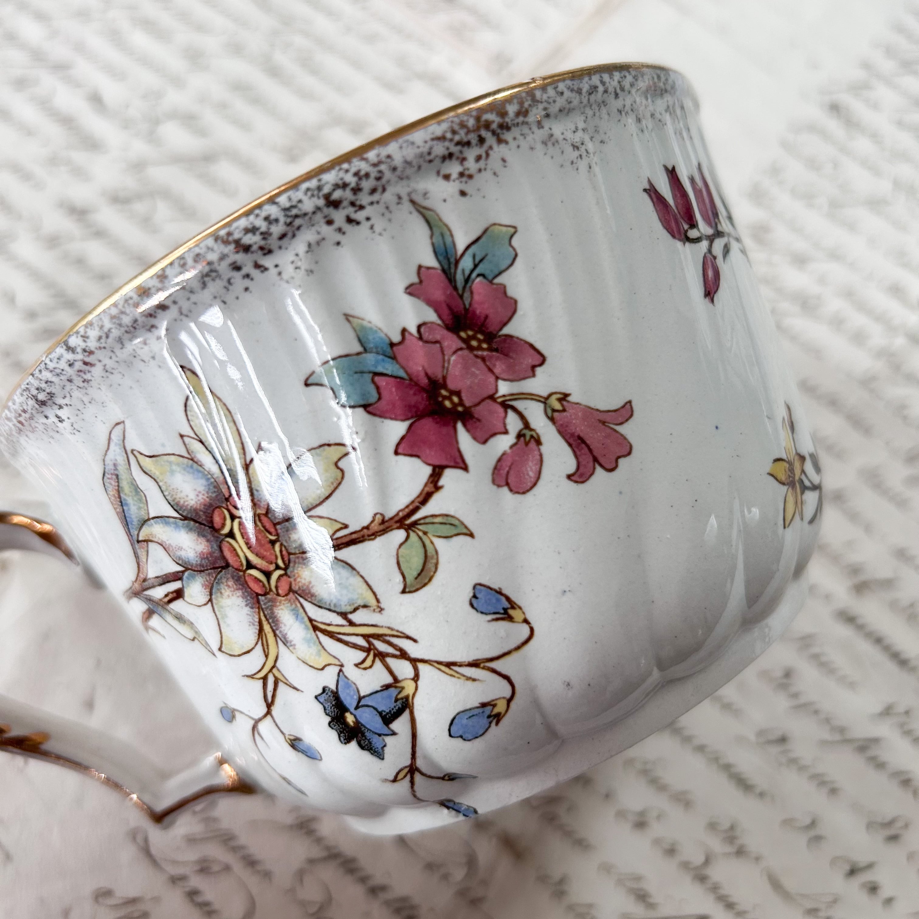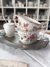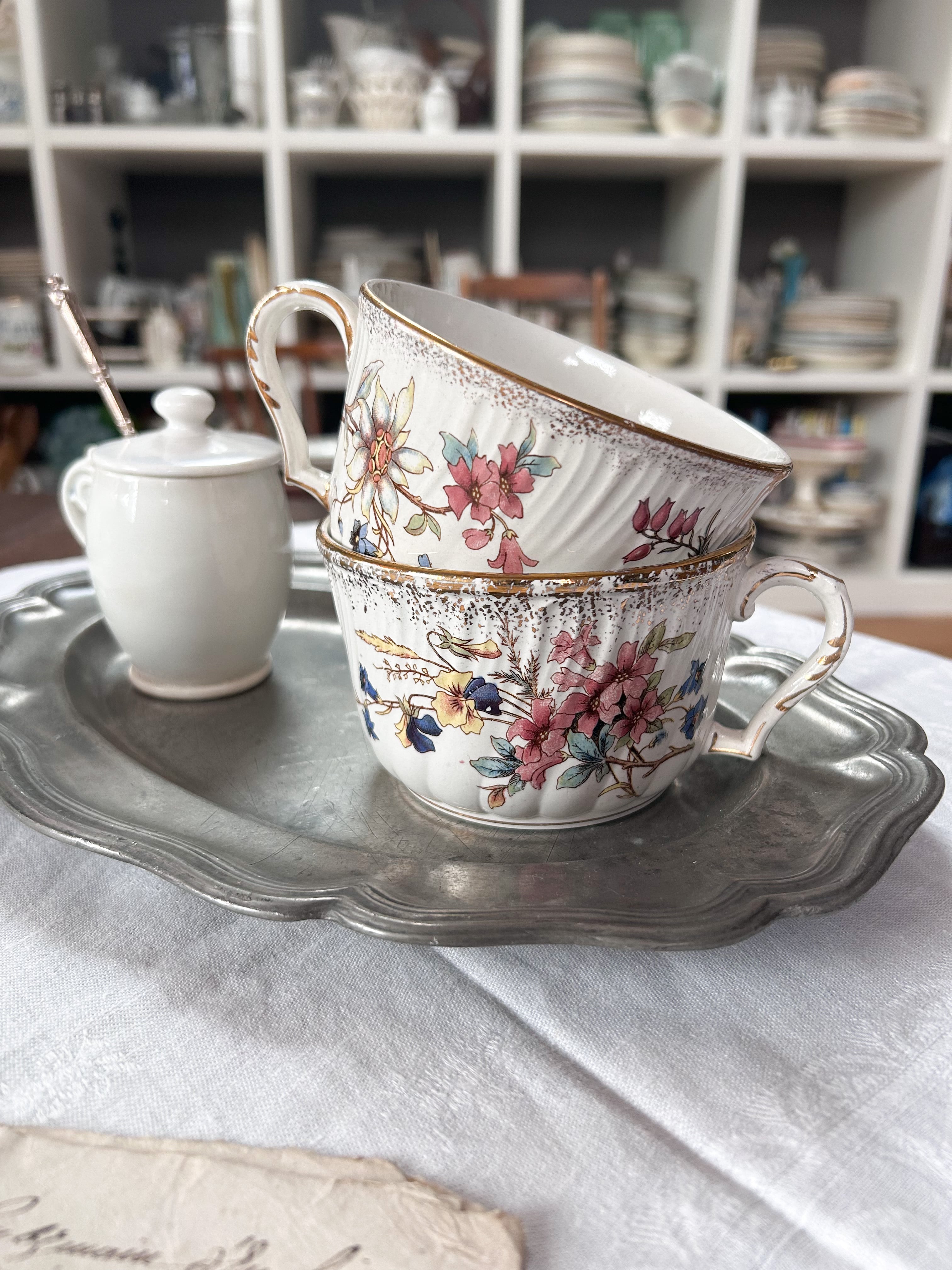 華やかな花々が咲き誇るようにデザインされた、サルグミンヌ窯「Righi」シリーズのショコラカップです。濃淡のあるピンクやブルーの花が表現され、金彩が縁やハンドルに施されていることで、上品さとアンティークらしい重厚感を兼ね備えています。