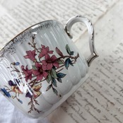華やかな花々が咲き誇るようにデザインされた、サルグミンヌ窯「Righi」シリーズのショコラカップです。濃淡のあるピンクやブルーの花が表現され、金彩が縁やハンドルに施されていることで、上品さとアンティークらしい重厚感を兼ね備えています。