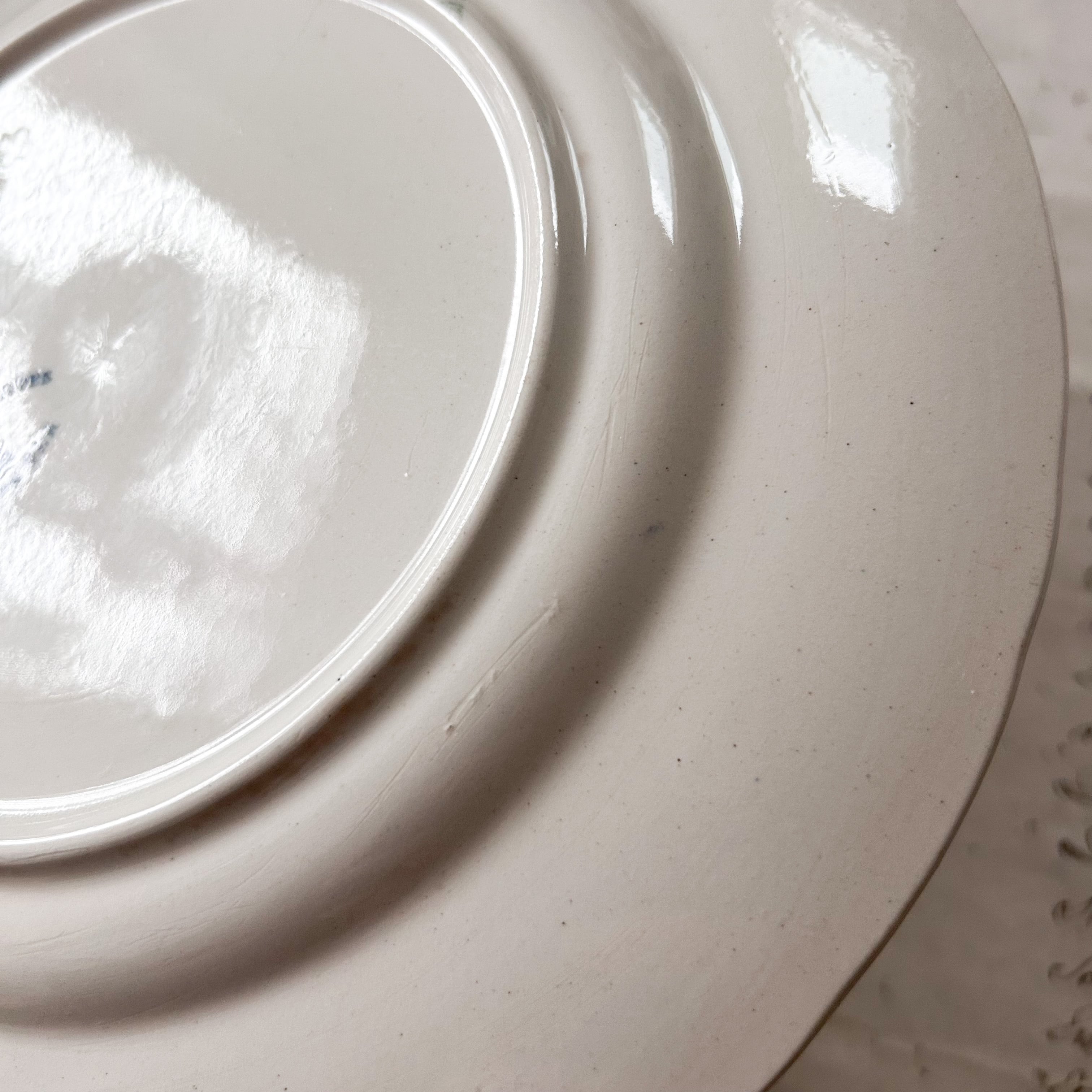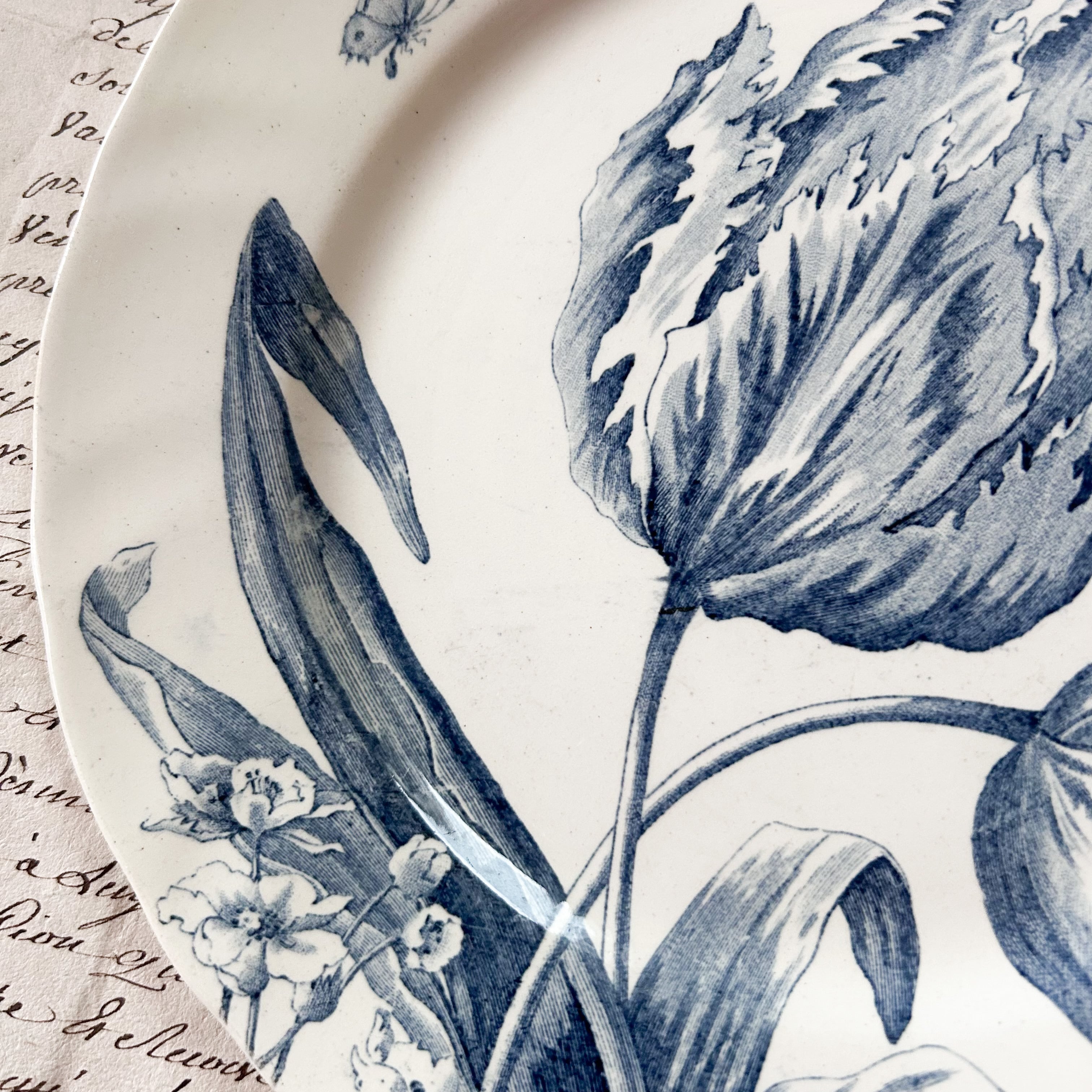 青みを帯びたモノクロームで描かれたチューリップが大胆に咲き誇る一枚。写実的でありながらも柔らかな筆致で表現された花と蝶のモチーフが上品なシリーズ。リムには装飾を配さず、中央に大きく咲く花を際立たせた構図は、シンプルでありながらも強い存在感を放ちます。アンティークならではの美しさを食卓やディスプレイに添えてくれるお品です。