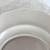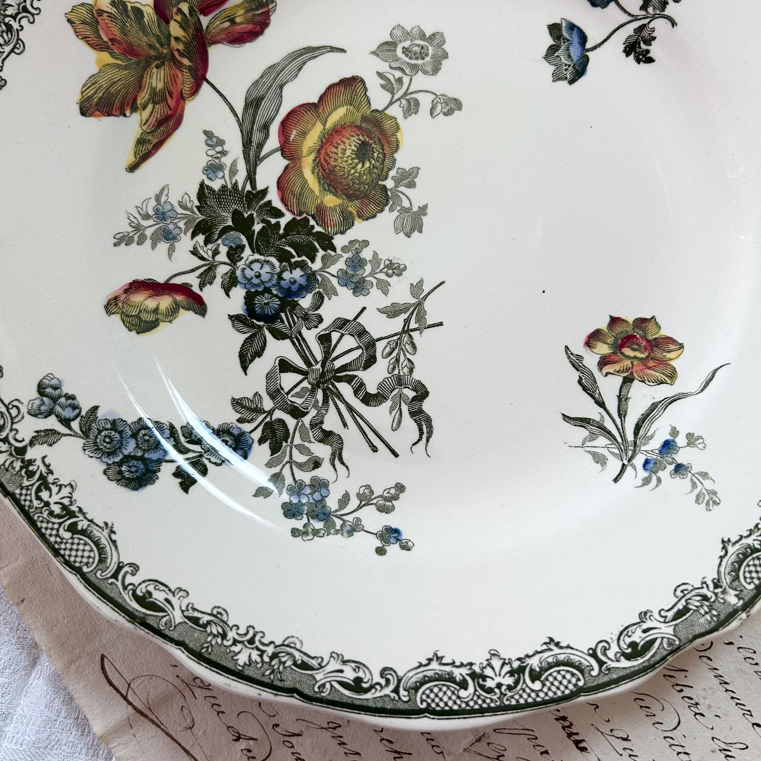 淡いグリーンの繊細な縁飾りに、鮮やかな花々を多色刷りであしらった華やかな一枚です。朱赤や黄色、青の花がバランスよく配置され、リボンの装飾がロマンティックな雰囲気を添えています。サルグミンヌらしい柔らかな陶肌に、彩り豊かな花々が生き生きと映える、優雅で存在感あるかなりレアな深皿です。ディナープレートとして特別な日に使いたいお品です。