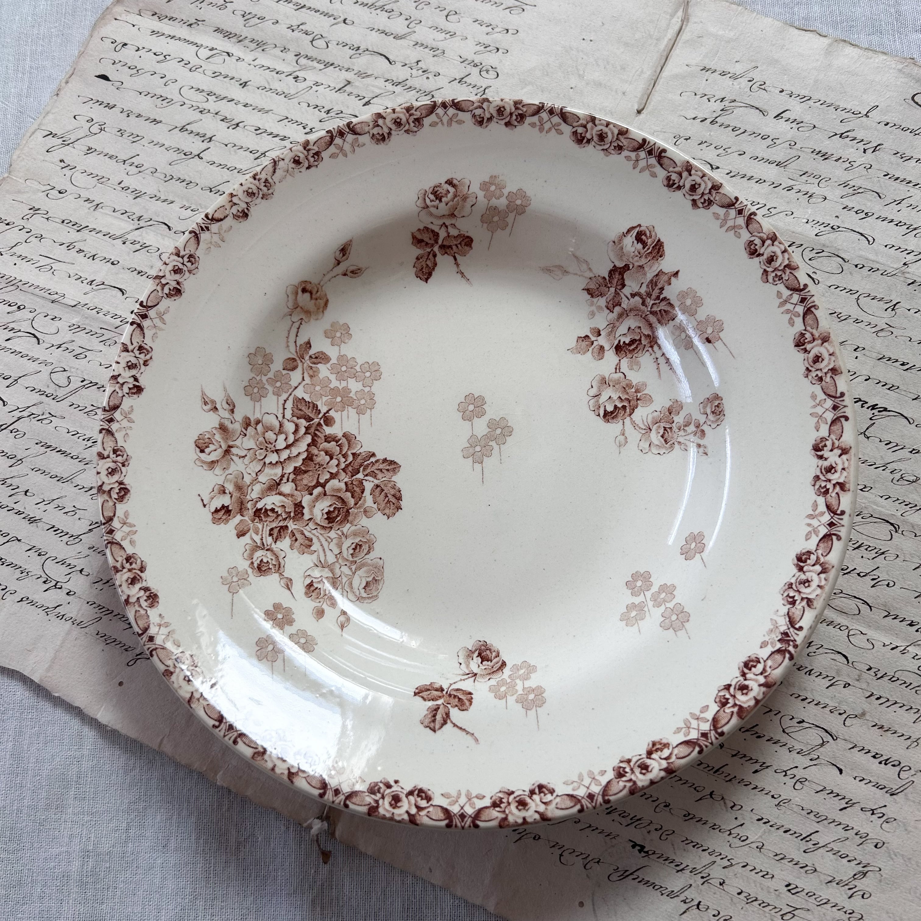 可憐な小花とバラがリースのように配置された上品なデザインが特徴のプレート。淡いブラウンのトーンで描かれた花柄が、優雅で落ち着いた雰囲気を漂わせます。縁取りにも繊細なバラのモチーフが施され、フレンチアンティークらしい気品を感じさせる一枚です。
