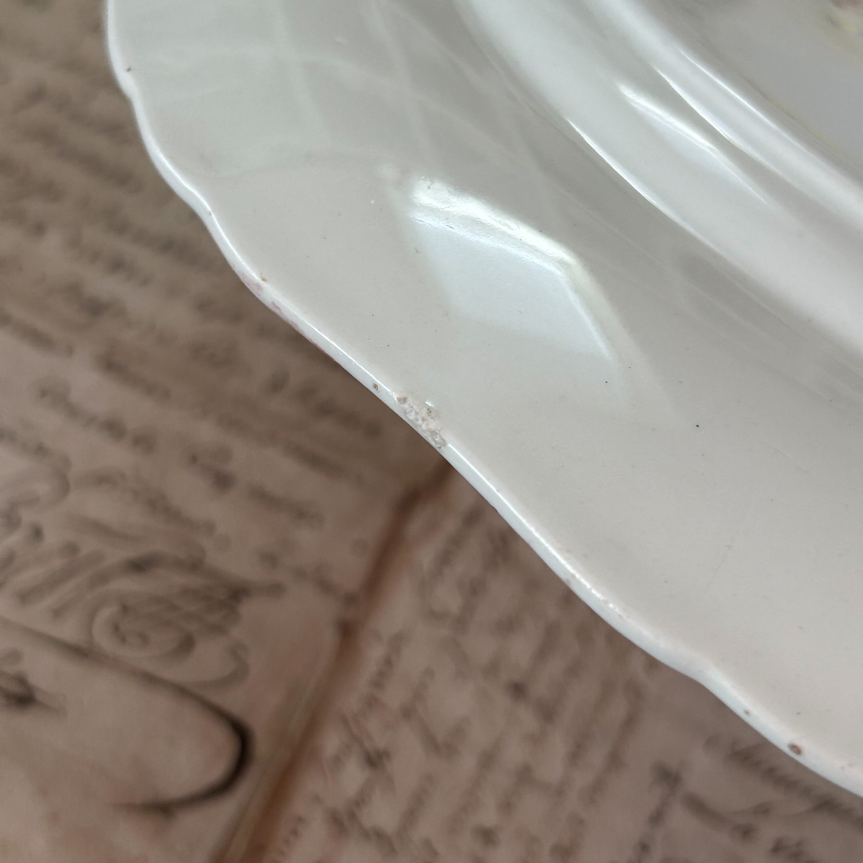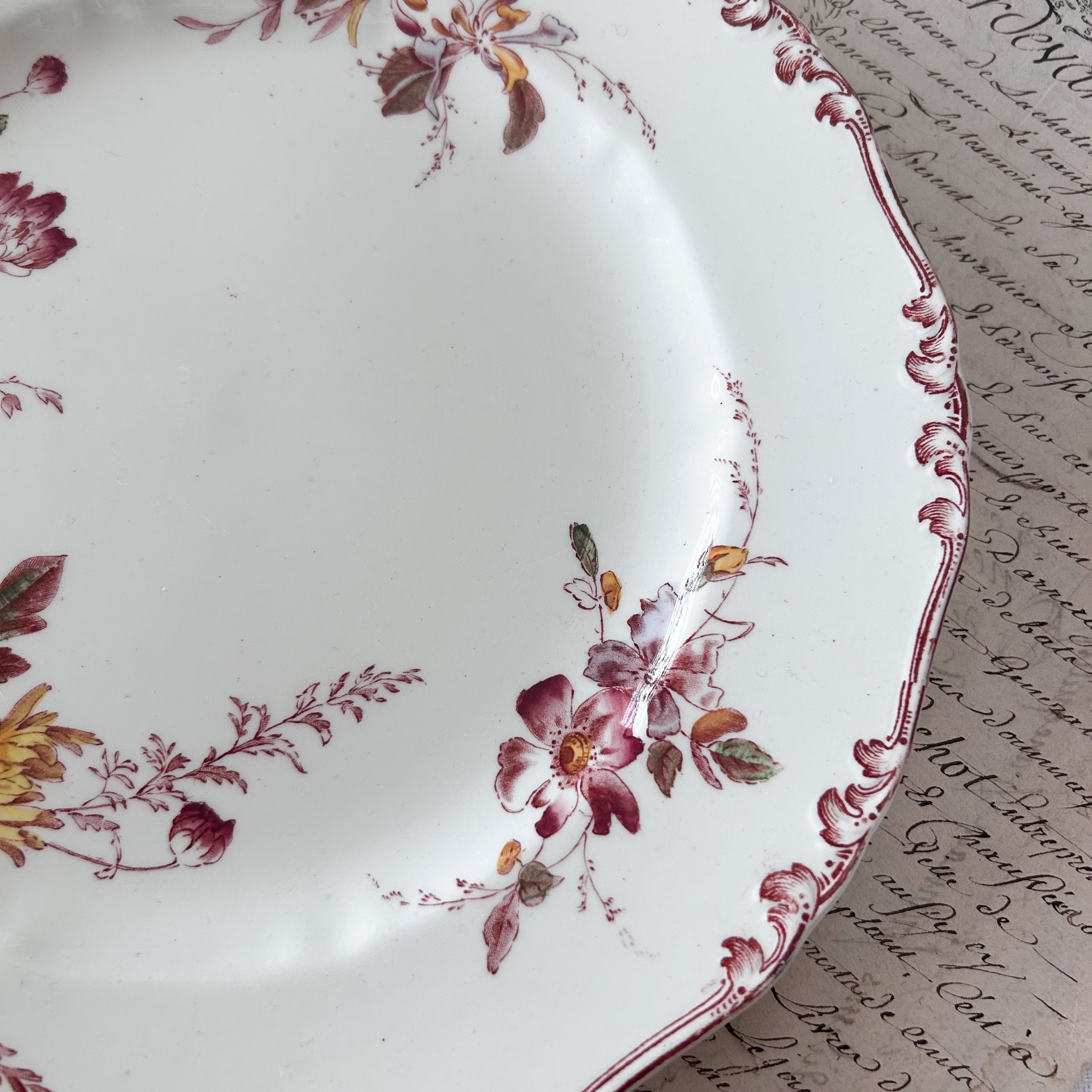 華やかな菊や蘭を思わせる花々が色鮮やかに描かれたシリーズ。縁取りにはリズミカルなレリーフ装飾が施され、深みのある赤褐色に黄色や淡いピンクを差した花模様が、柔らかなアイボリーの陶肌に映えます。秋の食卓を思わせる華やかさを持ちながら、クラシカルで落ち着いた雰囲気が漂うデザインは、料理を美しく引き立ててくれる一枚です。テーブルコーディネートに季節感を添えるだけでなく、飾り皿としても優雅に空間を彩ります。アンティークならではの風合いが、暮らしに趣と温かみを与えてくれる魅力的なアイテムです。エミールブルジョワ向に生産されたものです。