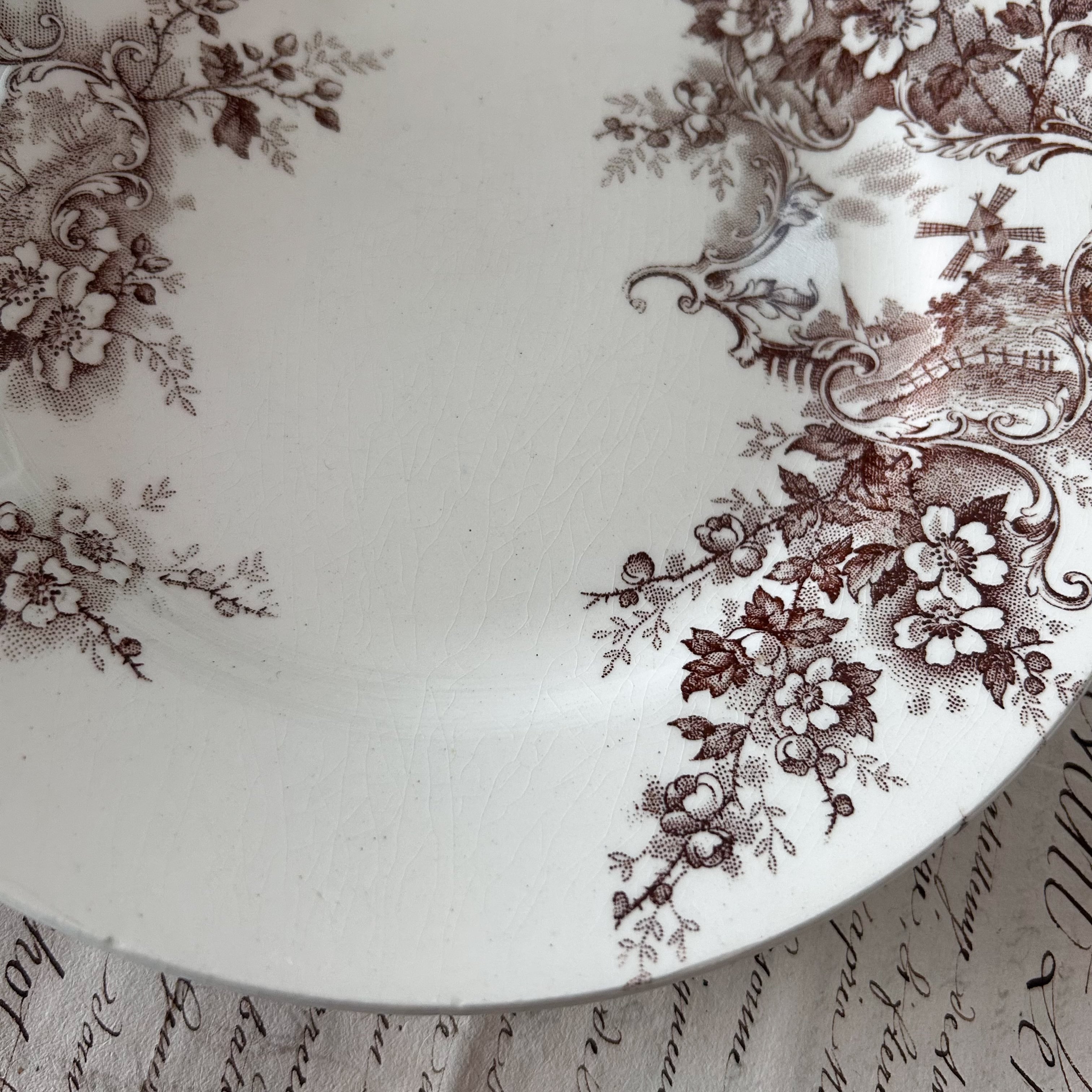 深みのあるブラウンで転写された花とロカイユ装飾、そして風景画が織り込まれた優雅なプレートです。クラシカルな花のブーケやスクロールの中に田園風景が描かれ、まるで絵画を切り取ったかのような芸術性を感じさせます。繊細な花々と柔らかな陶肌の組み合わせが、19世紀フランスのサロン文化を彷彿とさせる一枚。この「Pompadour (ポンパドール)」は、ショワジールロワを代表するデザインのひとつであり、コレクターや愛好家の間でも人気の高いシリーズとして知られています。飾っても使っても華やかさを添える、大変魅力的なお品です。