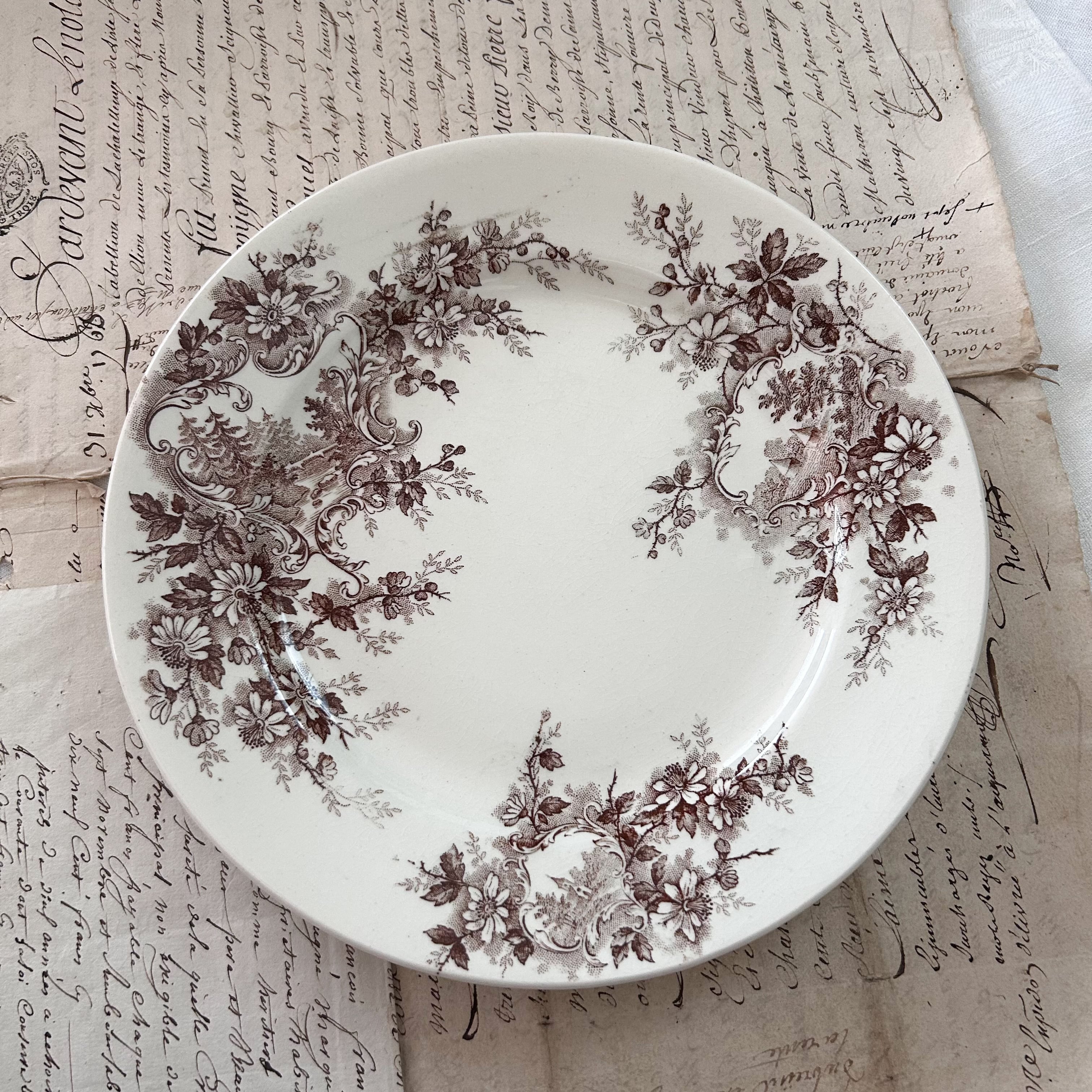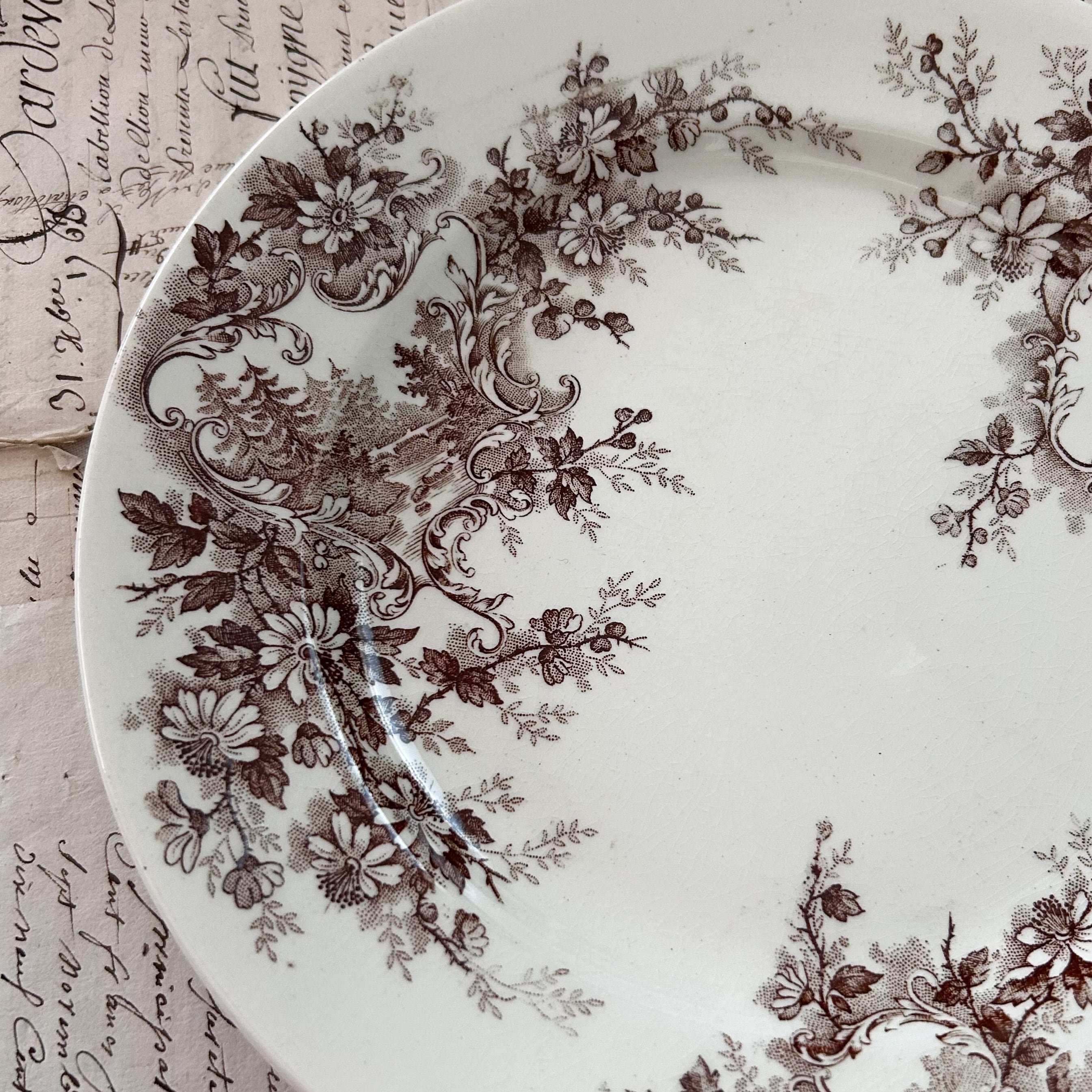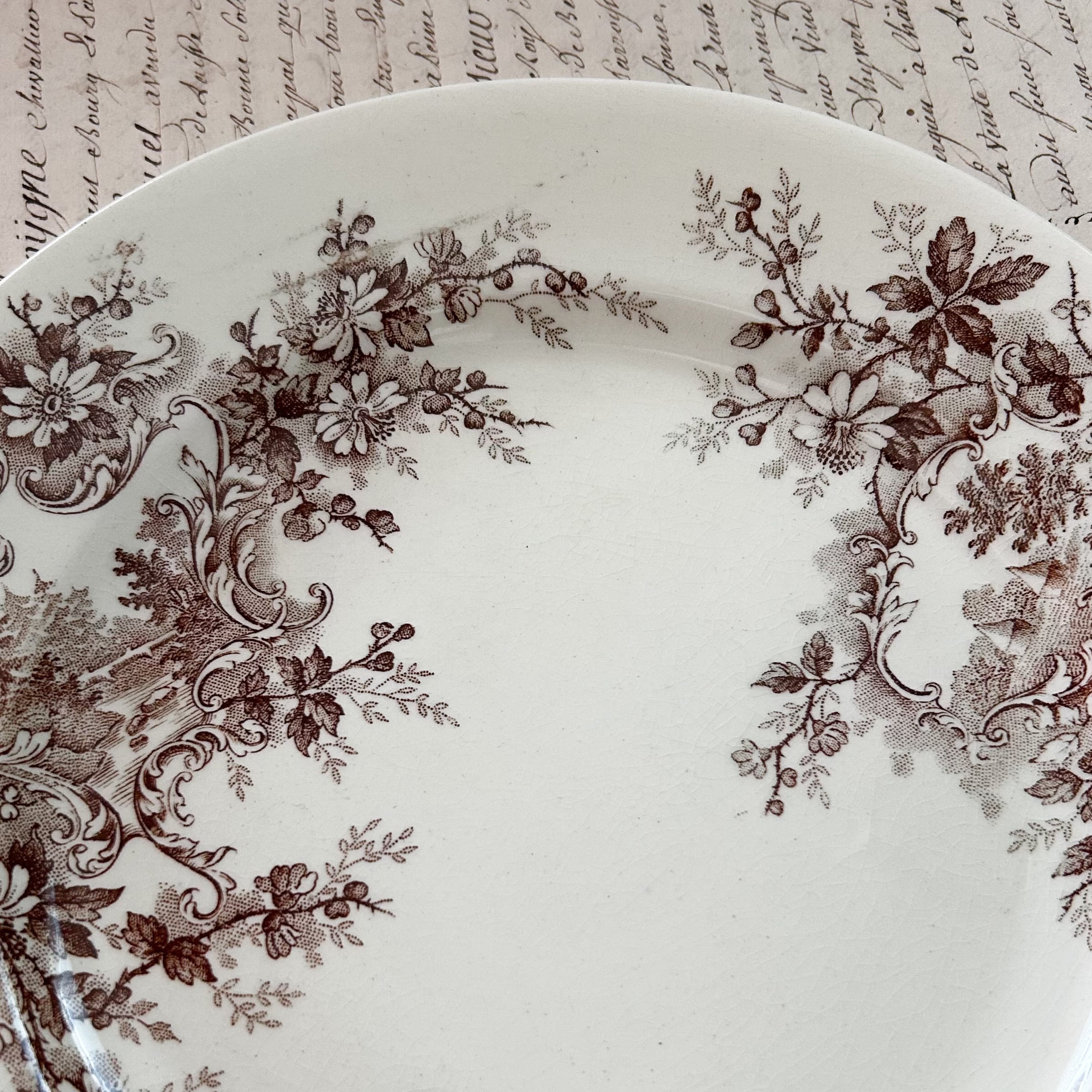 深みのあるブラウンで転写された花とロカイユ装飾、そして風景画が織り込まれた優雅なプレートです。クラシカルな花のブーケやスクロールの中に田園風景が描かれ、まるで絵画を切り取ったかのような芸術性を感じさせます。繊細な花々と柔らかな陶肌の組み合わせが、19世紀フランスのサロン文化を彷彿とさせる一枚。この「Pompadour (ポンパドール)」は、ショワジールロワを代表するデザインのひとつであり、コレクターや愛好家の間でも人気の高いシリーズとして知られています。飾っても使っても華やかさを添える、大変魅力的なお品です。