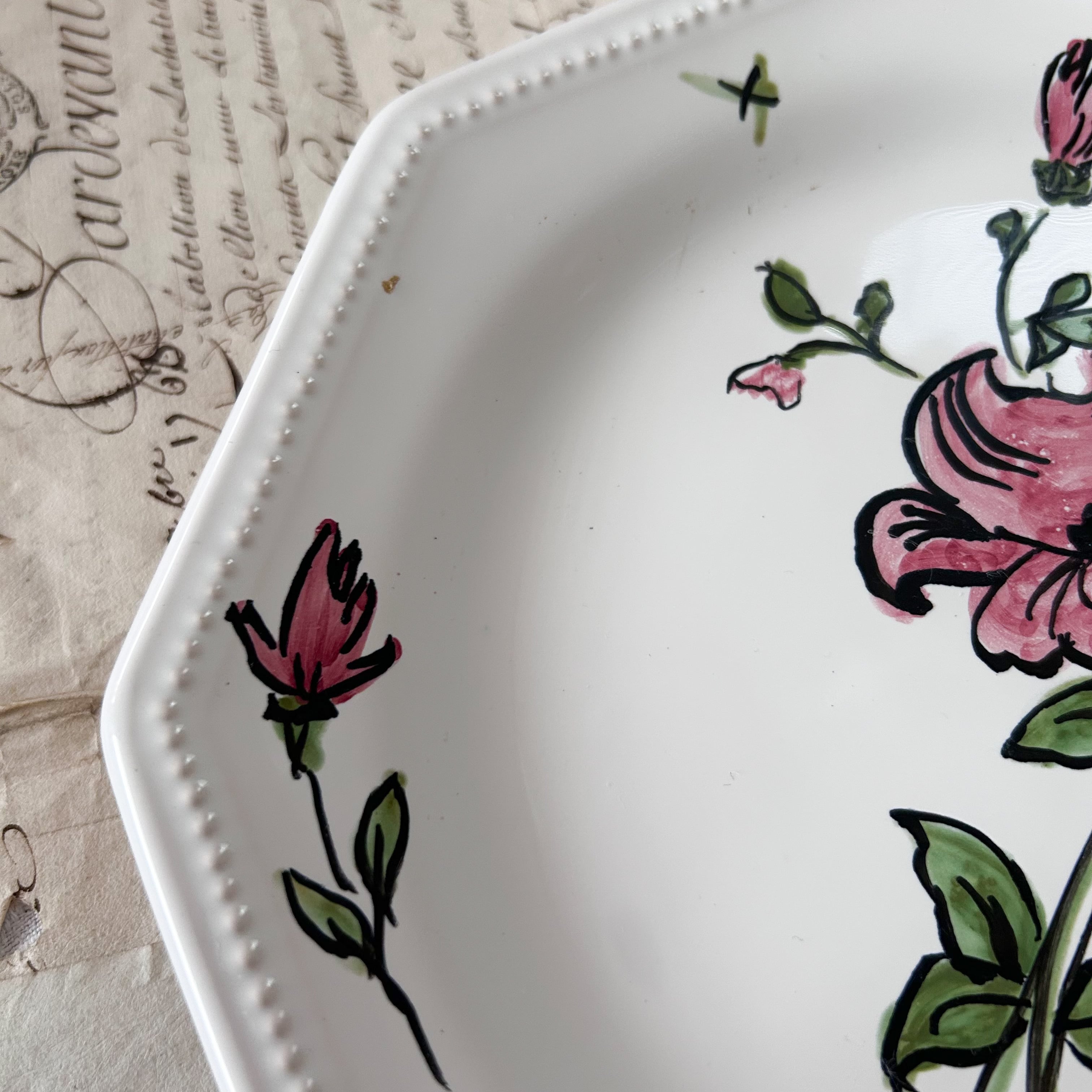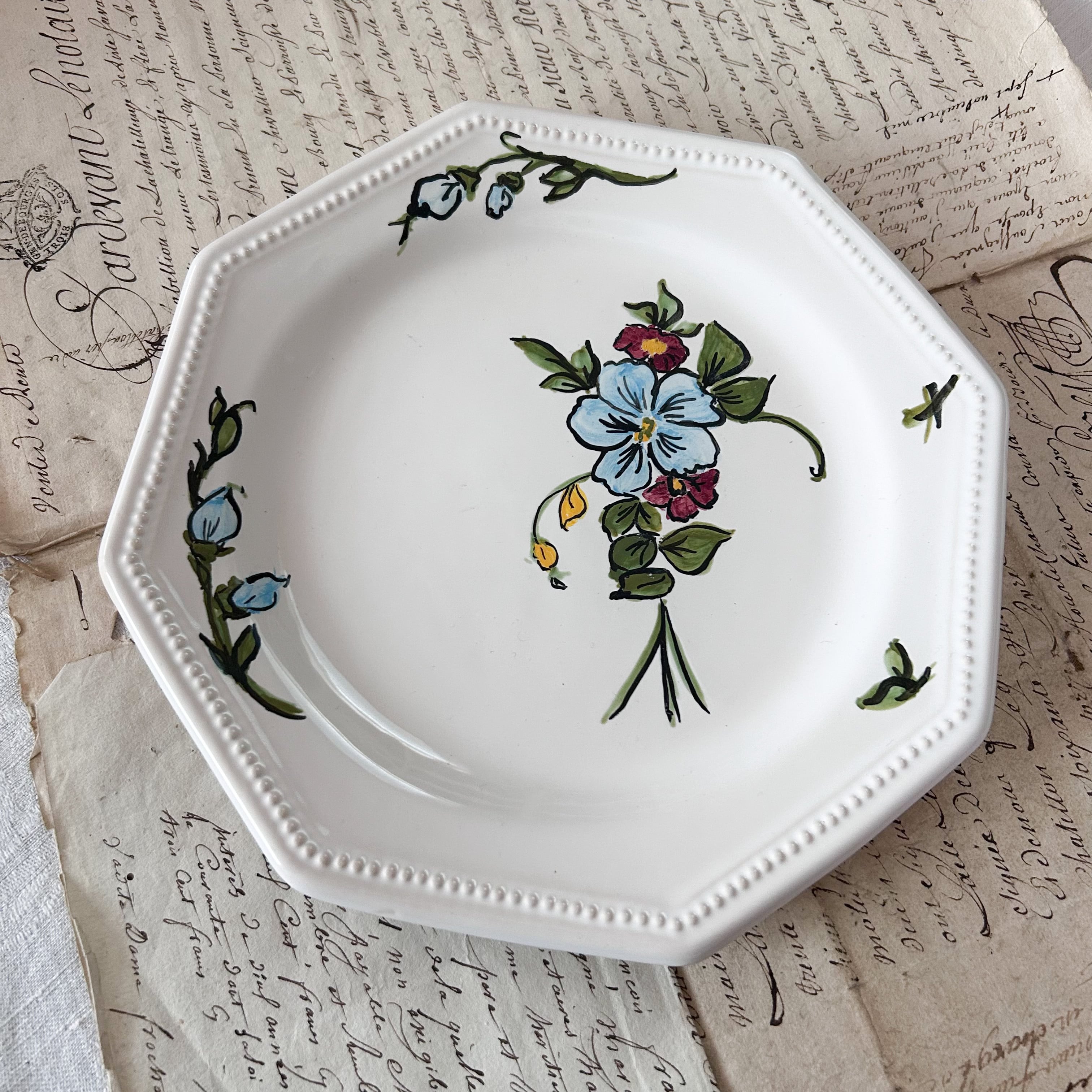 ●こちらは大胆に描かれた花が魅力的なデザイン。オクトゴナル+パールリムも上品です。ケーキなどにちょうどいいサイズ感も嬉しいです。