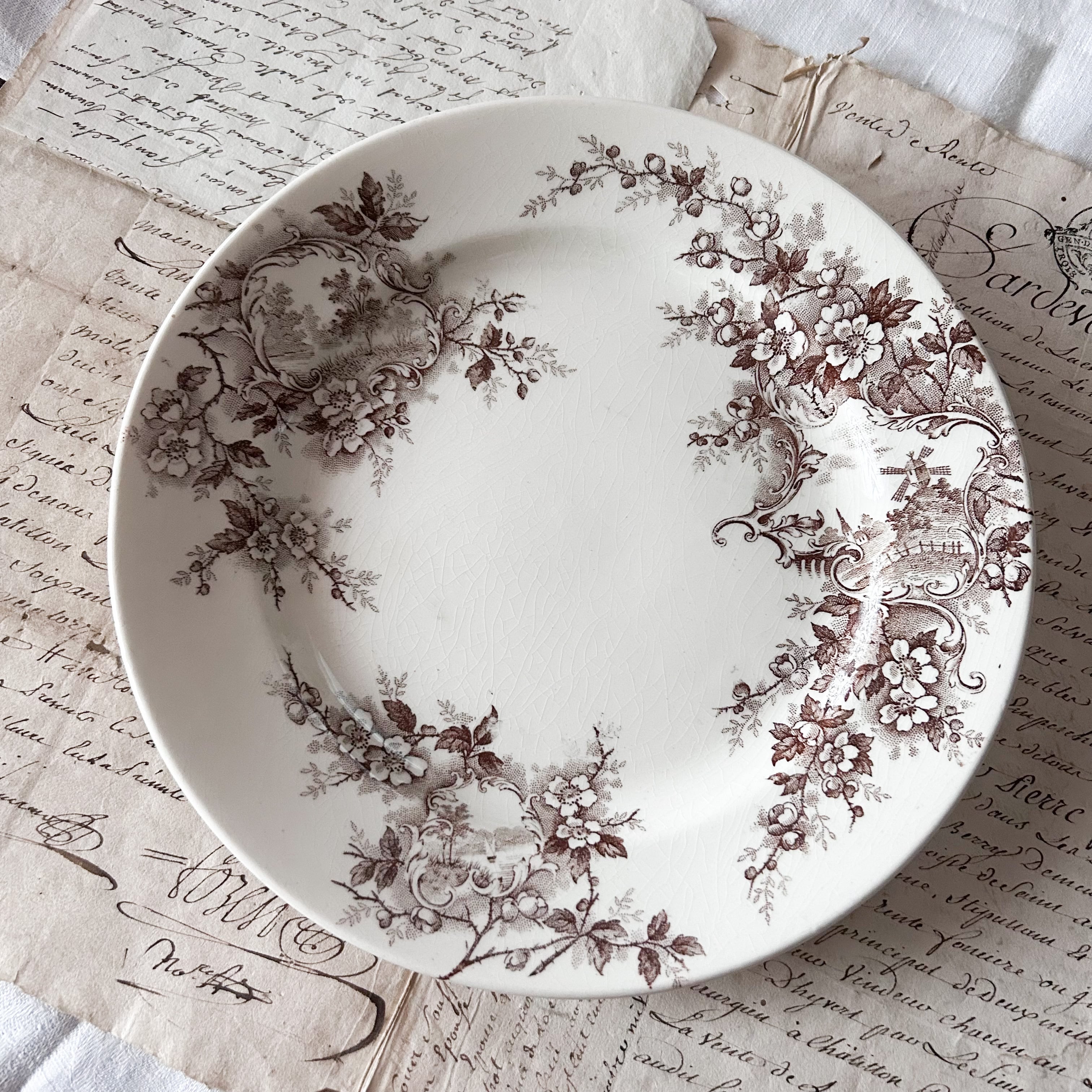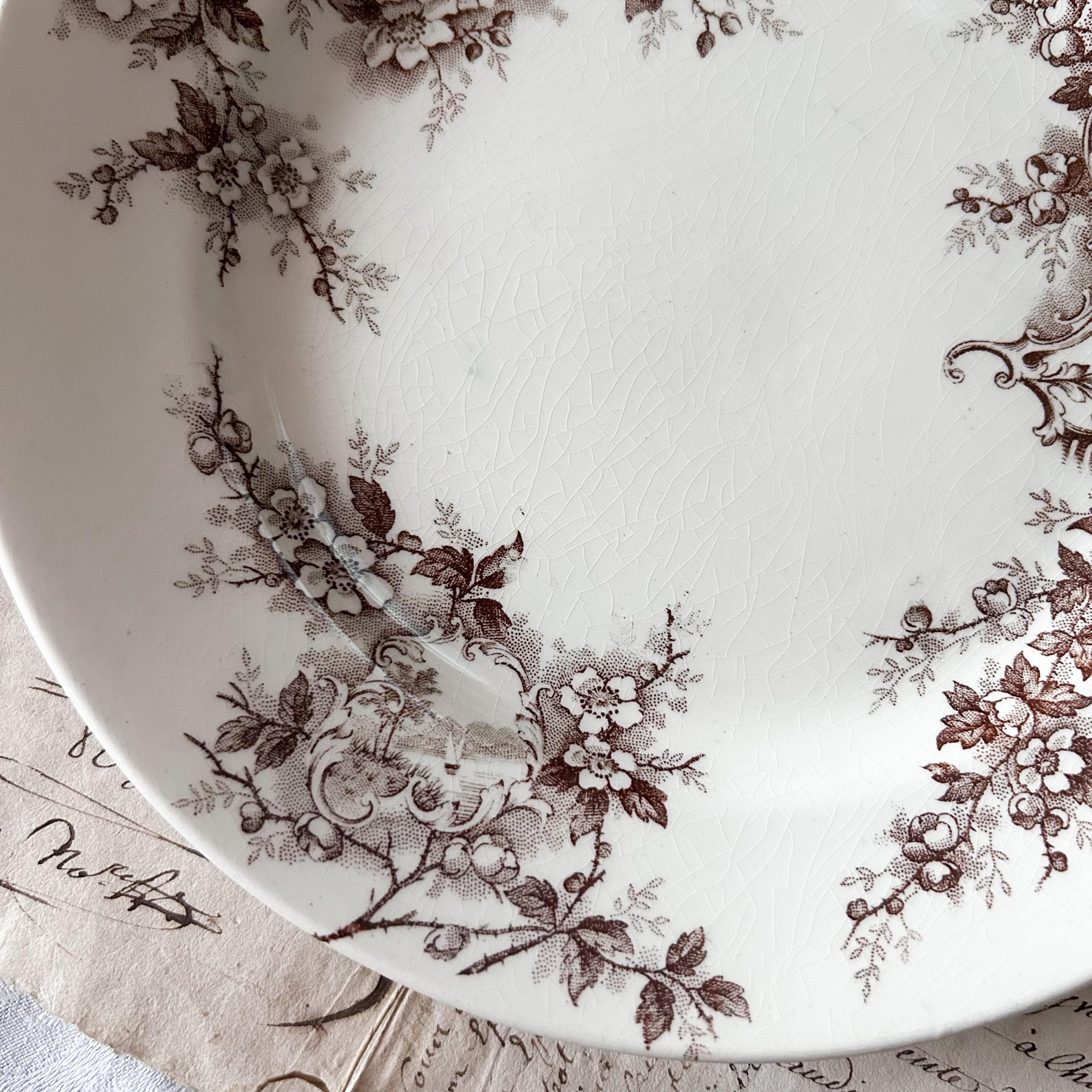 深みのあるブラウンで転写された花とロカイユ装飾、そして風景画が織り込まれた優雅なプレートです。クラシカルな花のブーケやスクロールの中に田園風景が描かれ、まるで絵画を切り取ったかのような芸術性を感じさせます。繊細な花々と柔らかな陶肌の組み合わせが、19世紀フランスのサロン文化を彷彿とさせる一枚。この「Pompadour (ポンパドール)」は、ショワジールロワを代表するデザインのひとつであり、コレクターや愛好家の間でも人気の高いシリーズとして知られています。飾っても使っても華やかさを添える、大変魅力的なお品です。