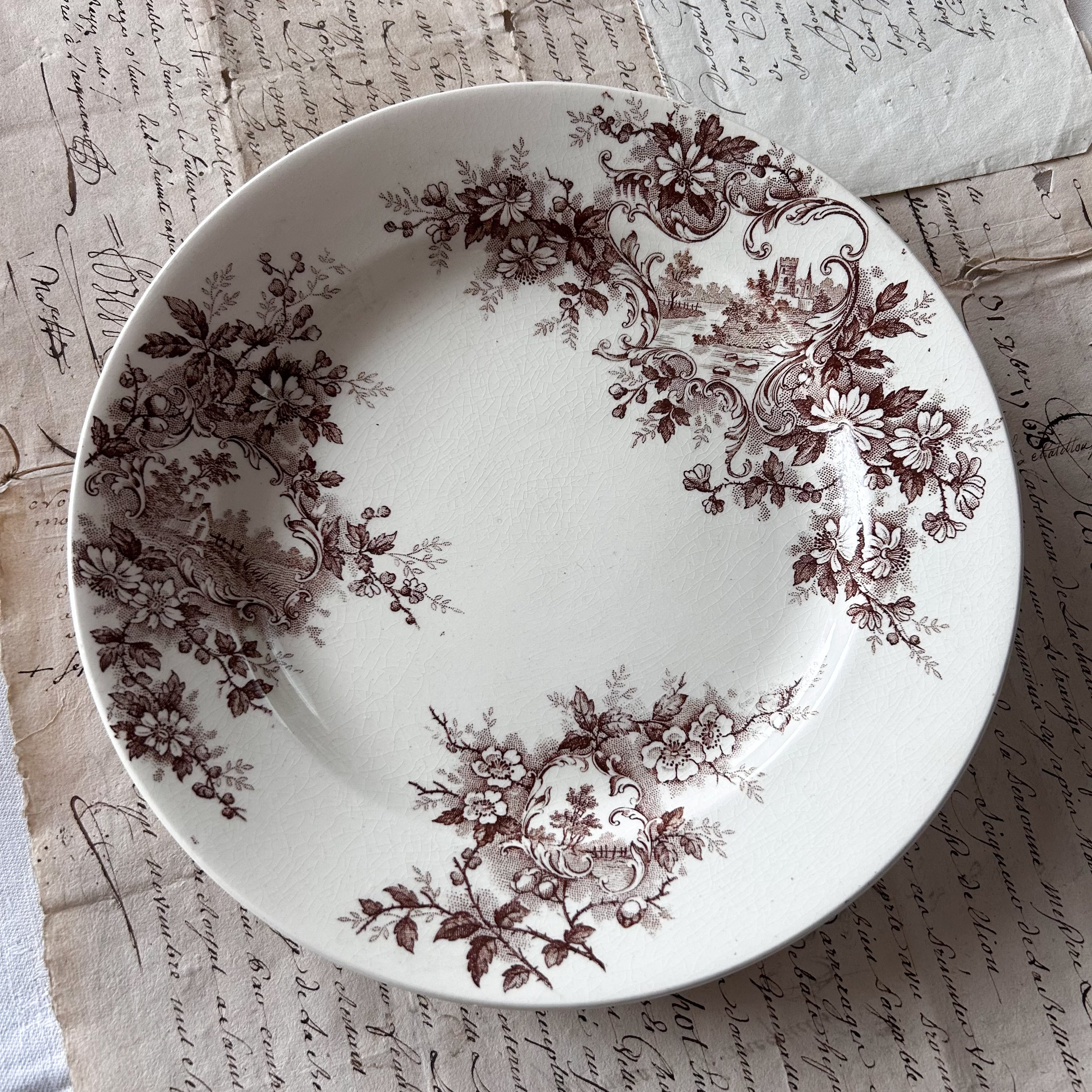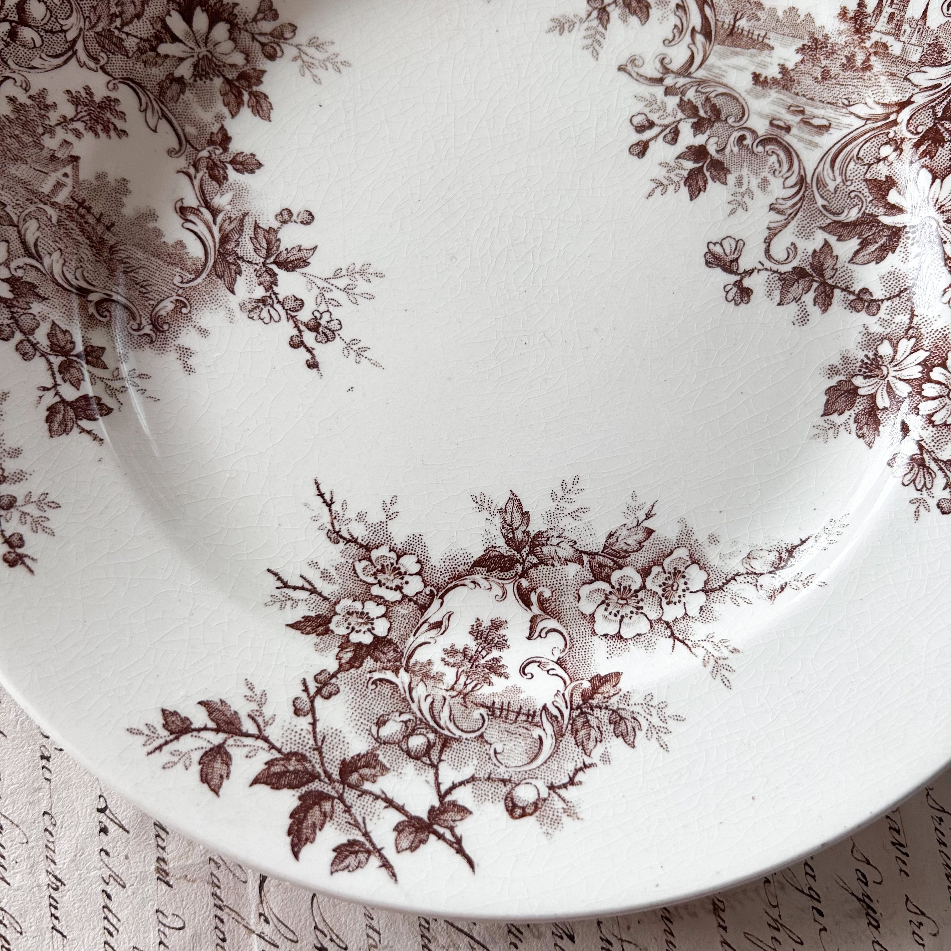 深みのあるブラウンで転写された花とロカイユ装飾、そして風景画が織り込まれた優雅なプレートです。クラシカルな花のブーケやスクロールの中に田園風景が描かれ、まるで絵画を切り取ったかのような芸術性を感じさせます。繊細な花々と柔らかな陶肌の組み合わせが、19世紀フランスのサロン文化を彷彿とさせる一枚。この「Pompadour (ポンパドール)」は、ショワジールロワを代表するデザインのひとつであり、コレクターや愛好家の間でも人気の高いシリーズとして知られています。飾っても使っても華やかさを添える、大変魅力的なお品です。