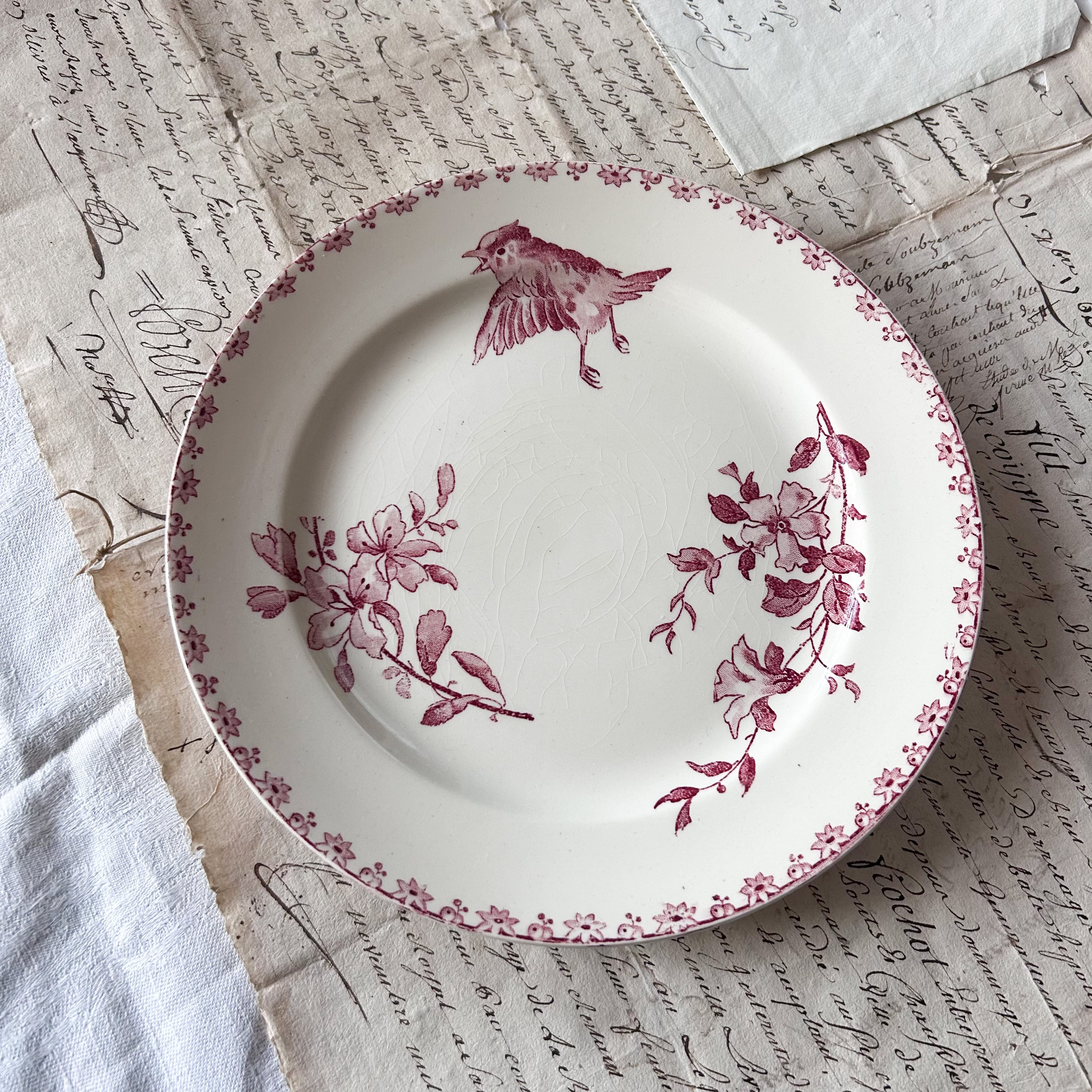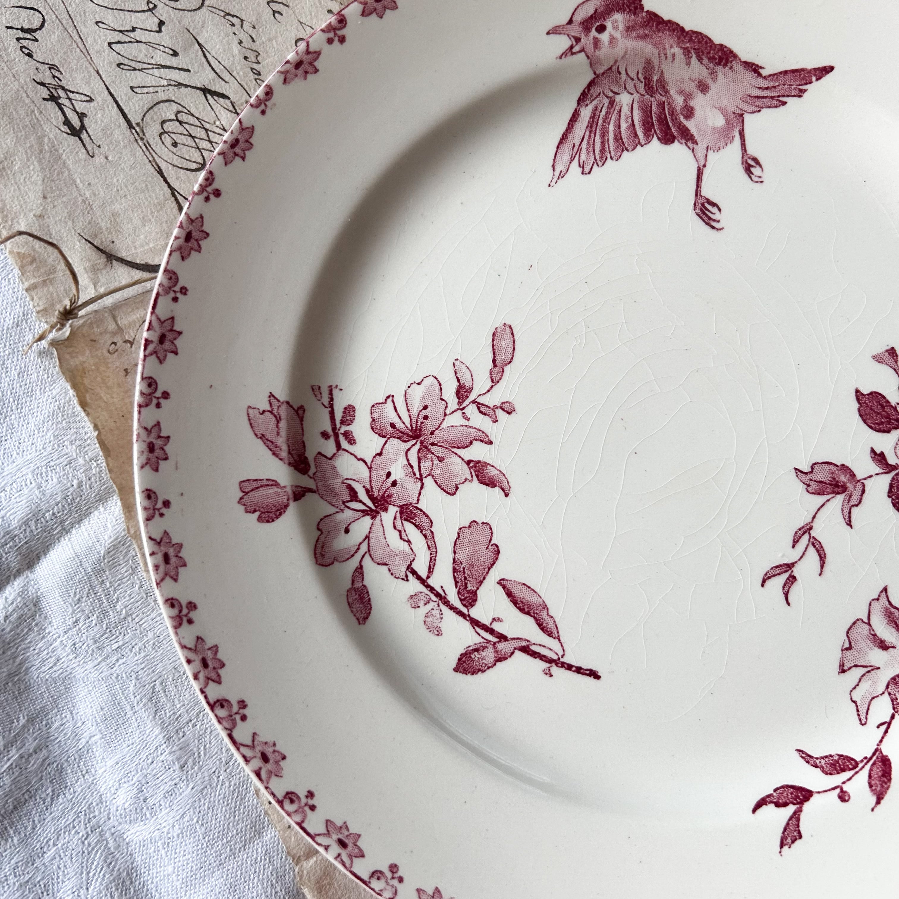 羽ばたく小鳥とやさしい花のモチーフがあしらわれた、繊細で詩的な雰囲気のアンティークプレート。縁を彩る小さな花模様がプレート全体を優しく引き締め、飾っても食卓に置いても目を惹くデザインです。愛らしくも上品なパターンで、ティータイムやデザートプレートにぴったりです。