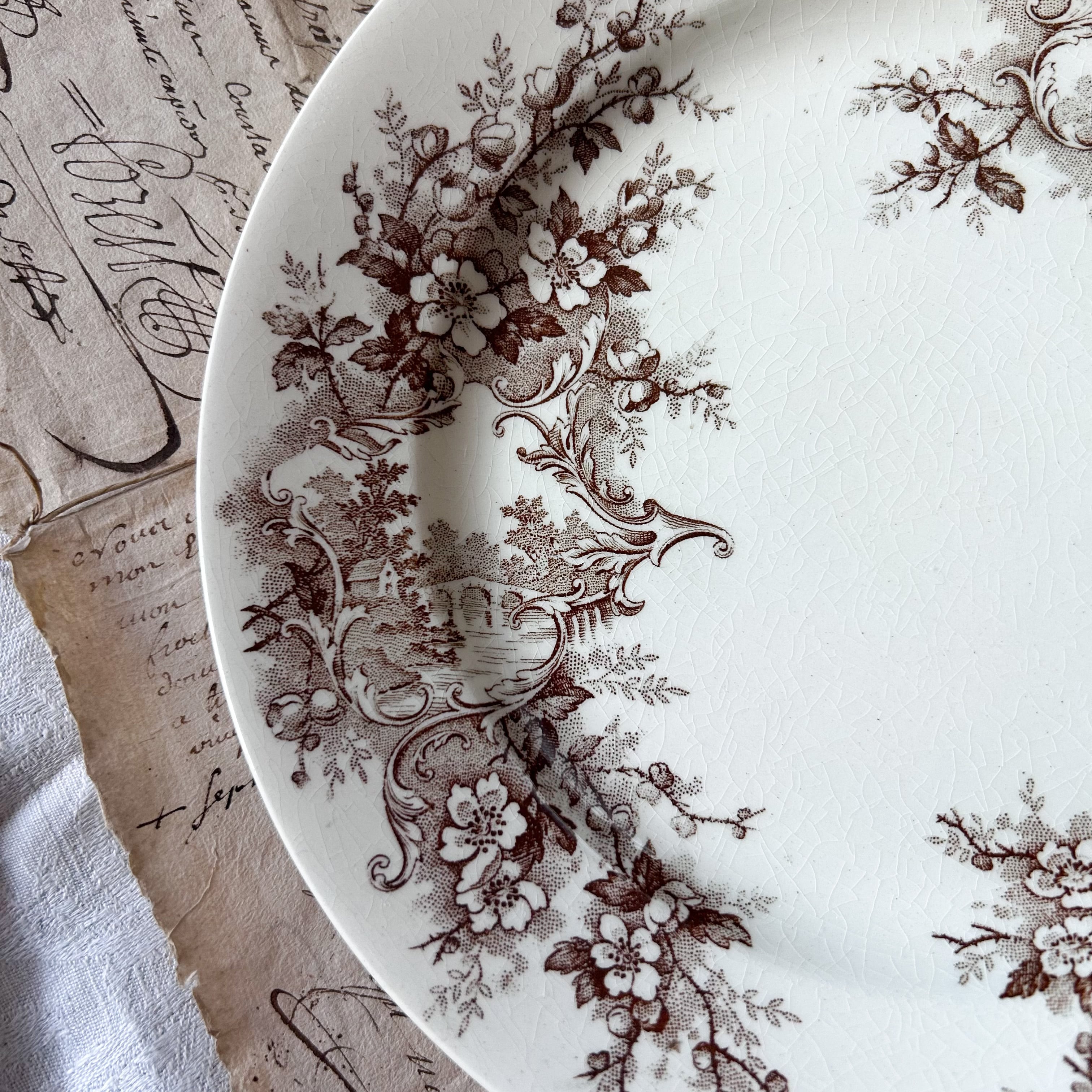 深みのあるブラウンで転写された花とロカイユ装飾、そして風景画が織り込まれた優雅なプレートです。クラシカルな花のブーケやスクロールの中に田園風景が描かれ、まるで絵画を切り取ったかのような芸術性を感じさせます。繊細な花々と柔らかな陶肌の組み合わせが、19世紀フランスのサロン文化を彷彿とさせる一枚。この「Pompadour (ポンパドール)」は、ショワジールロワを代表するデザインのひとつであり、コレクターや愛好家の間でも人気の高いシリーズとして知られています。飾っても使っても華やかさを添える、大変魅力的なお品です。