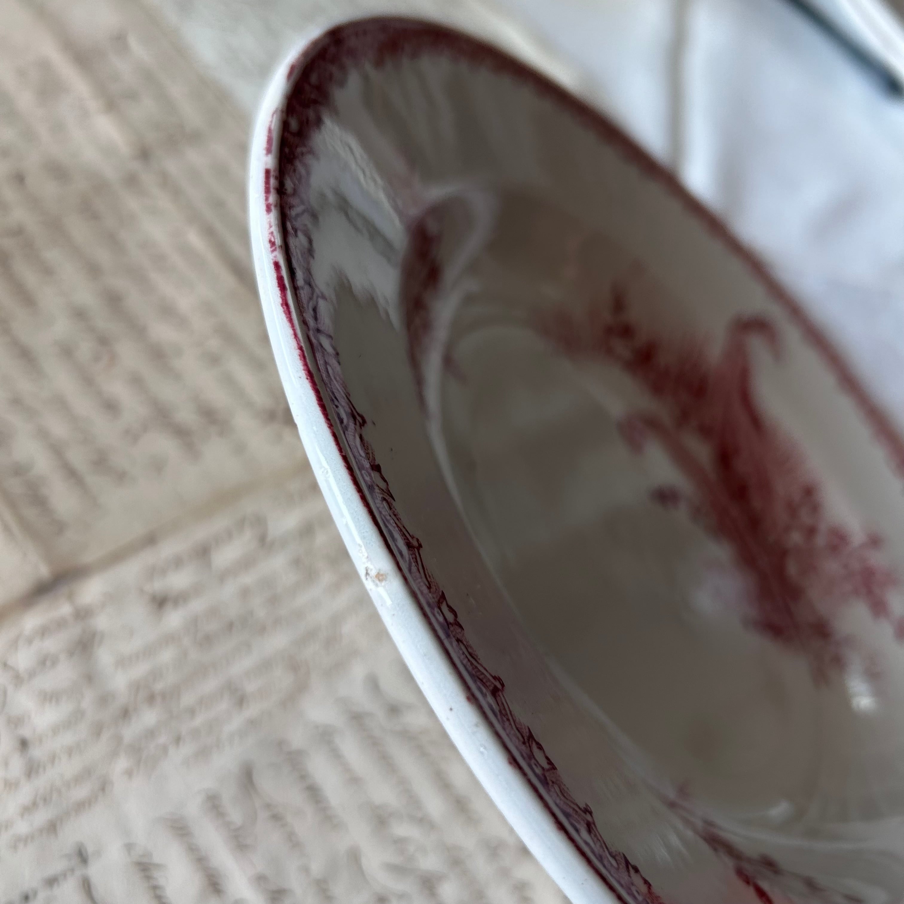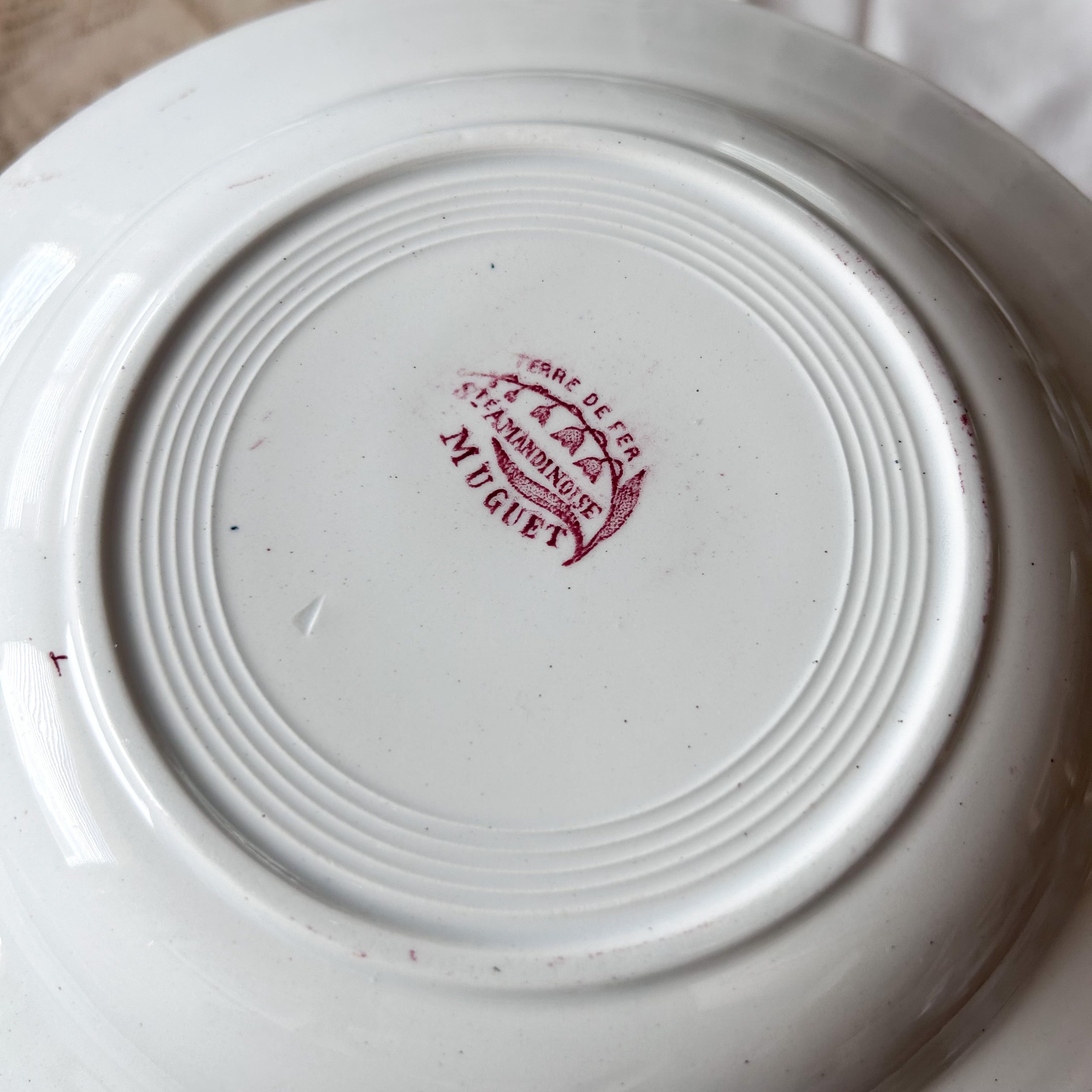 スズランの花をあしらった上品なレッドトランスファープリントが美しい、19世紀末〜20世紀初頭のサンタマン窯の深皿です。バックスタンプはありませんが、1900年前後の製造と推定されます。シリーズ名の「MUGUET (ミュゲ)」はフランス語でスズランを意味し、幸福の象徴として親しまれる大変人気のあるモチーフです。