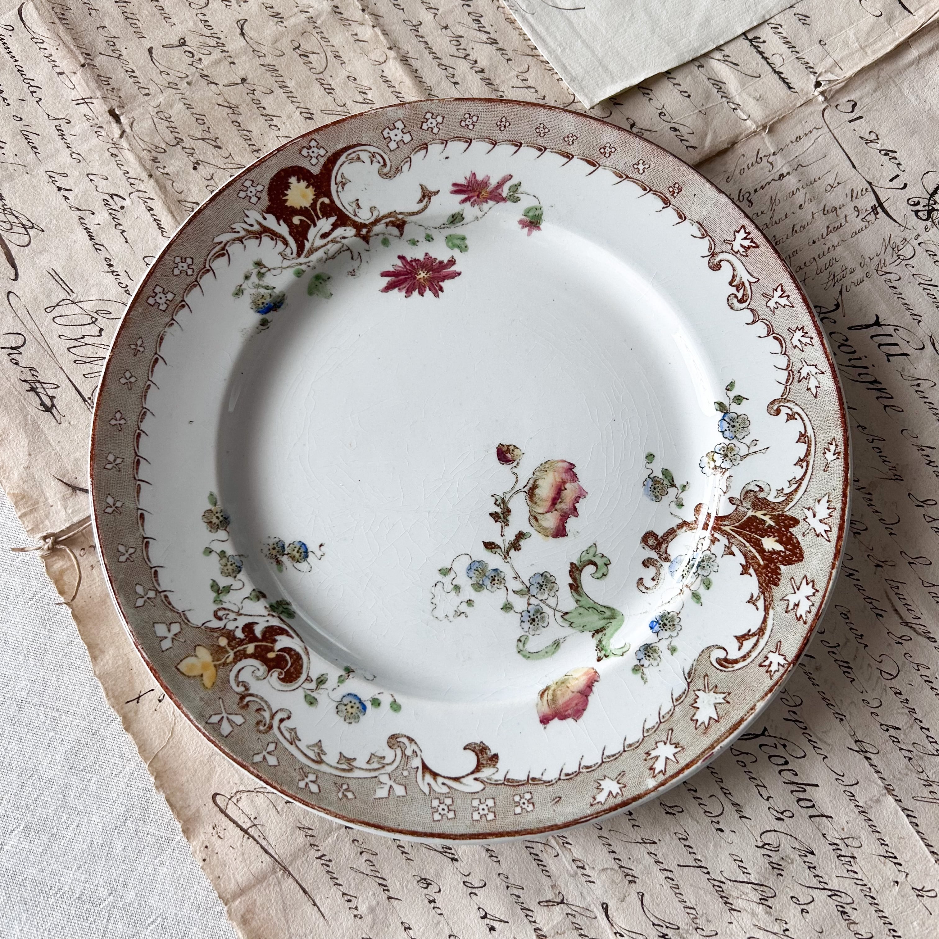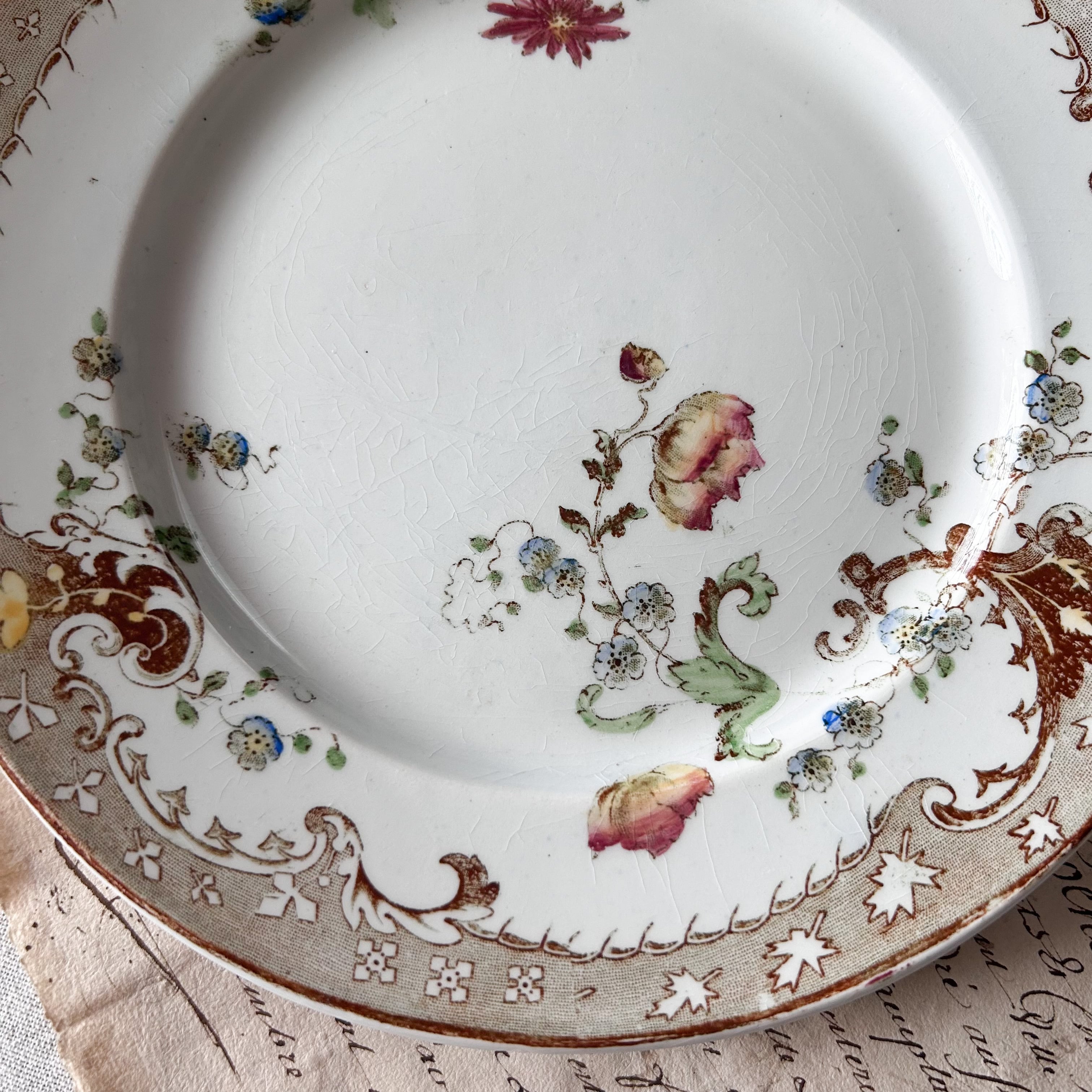 温かみのある白地に、茶色の縁取りとスクロール装飾が施され、中央には繊細な多色刷りの花々があしらわれたエレガントなプレートです。可憐なブルーやローズの花々と、優雅なリム装飾が調和し、19世紀フランス陶器らしいクラシカルな気品を漂わせています。これからの季節にぴったりの色目。ディスプレイとしても存在感があり、テーブルを華やかに彩る一枚です。