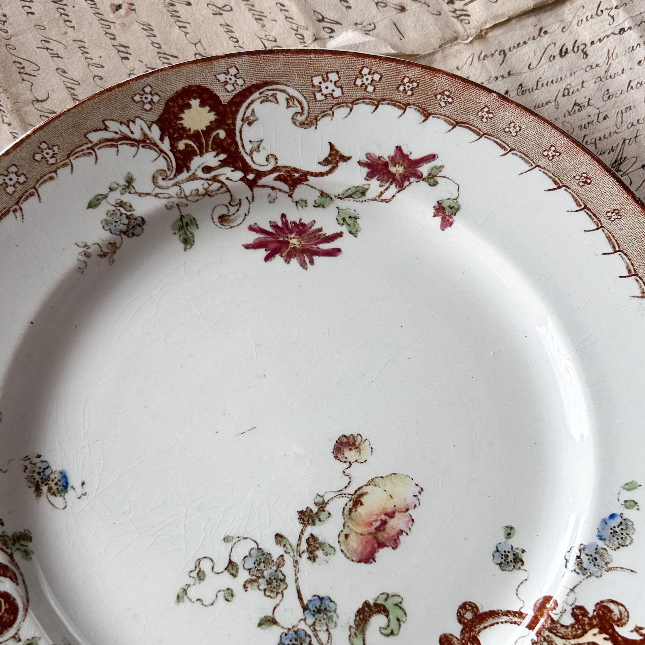 温かみのある白地に、茶色の縁取りとスクロール装飾が施され、中央には繊細な多色刷りの花々があしらわれたエレガントなプレートです。可憐なブルーやローズの花々と、優雅なリム装飾が調和し、19世紀フランス陶器らしいクラシカルな気品を漂わせています。これからの季節にぴったりの色目。ディスプレイとしても存在感があり、テーブルを華やかに彩る一枚です。