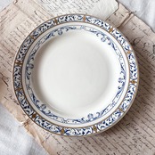 白地に鮮やかなコバルトブルーとマスタードイエローで縁を飾った、端正な佇まいの一枚です。唐草のようなアラベスク模様と幾何学的なクロス文様の組み合わせがクラシカルな印象を与え、落ち着きと華やぎを兼ね備えています。気品あふれる色調とデザインは、食卓を洗練された雰囲気に演出してくれるでしょう。スイート、冷菜などに合うデザインです。