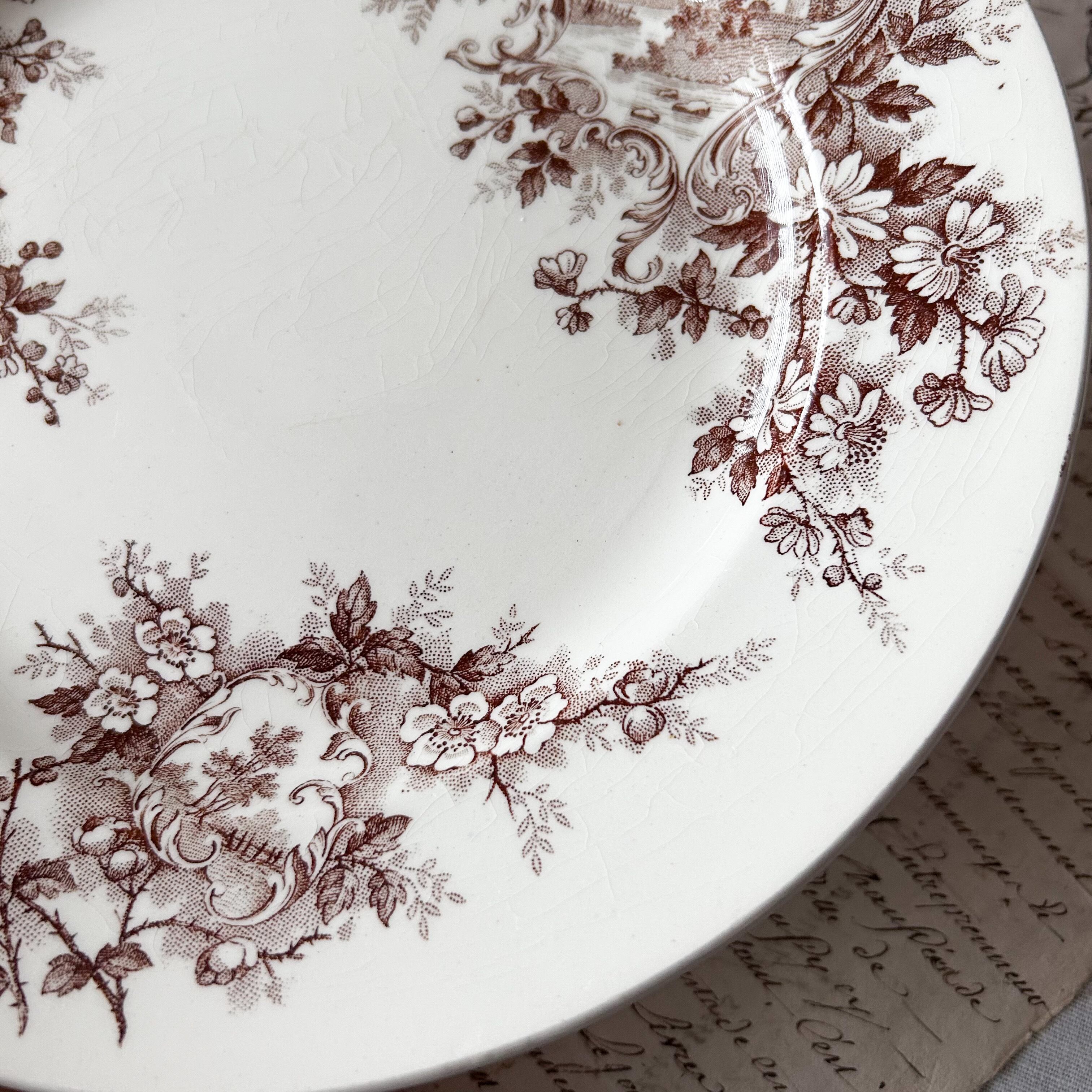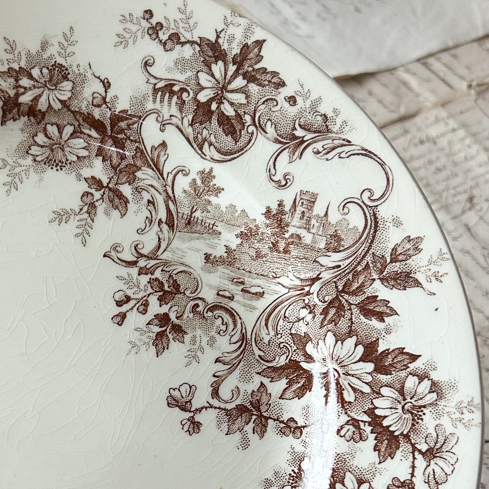 深みのあるブラウンで転写された花とロカイユ装飾、そして風景画が織り込まれた優雅なプレートです。クラシカルな花のブーケやスクロールの中に田園風景が描かれ、まるで絵画を切り取ったかのような芸術性を感じさせます。繊細な花々と柔らかな陶肌の組み合わせが、19世紀フランスのサロン文化を彷彿とさせる一枚。この「Pompadour (ポンパドール)」は、ショワジールロワを代表するデザインのひとつであり、コレクターや愛好家の間でも人気の高いシリーズとして知られています。飾っても使っても華やかさを添える、大変魅力的なお品です。